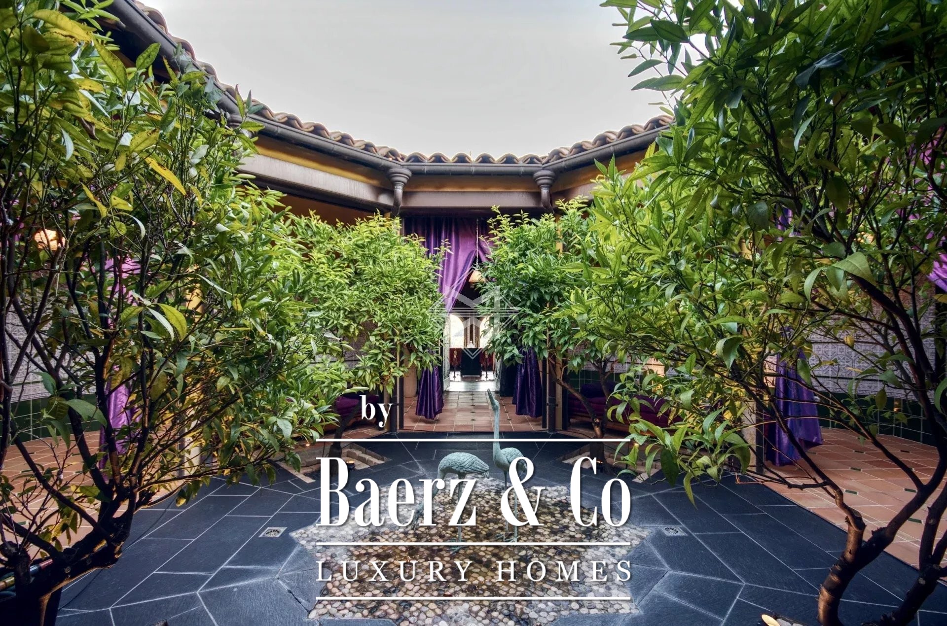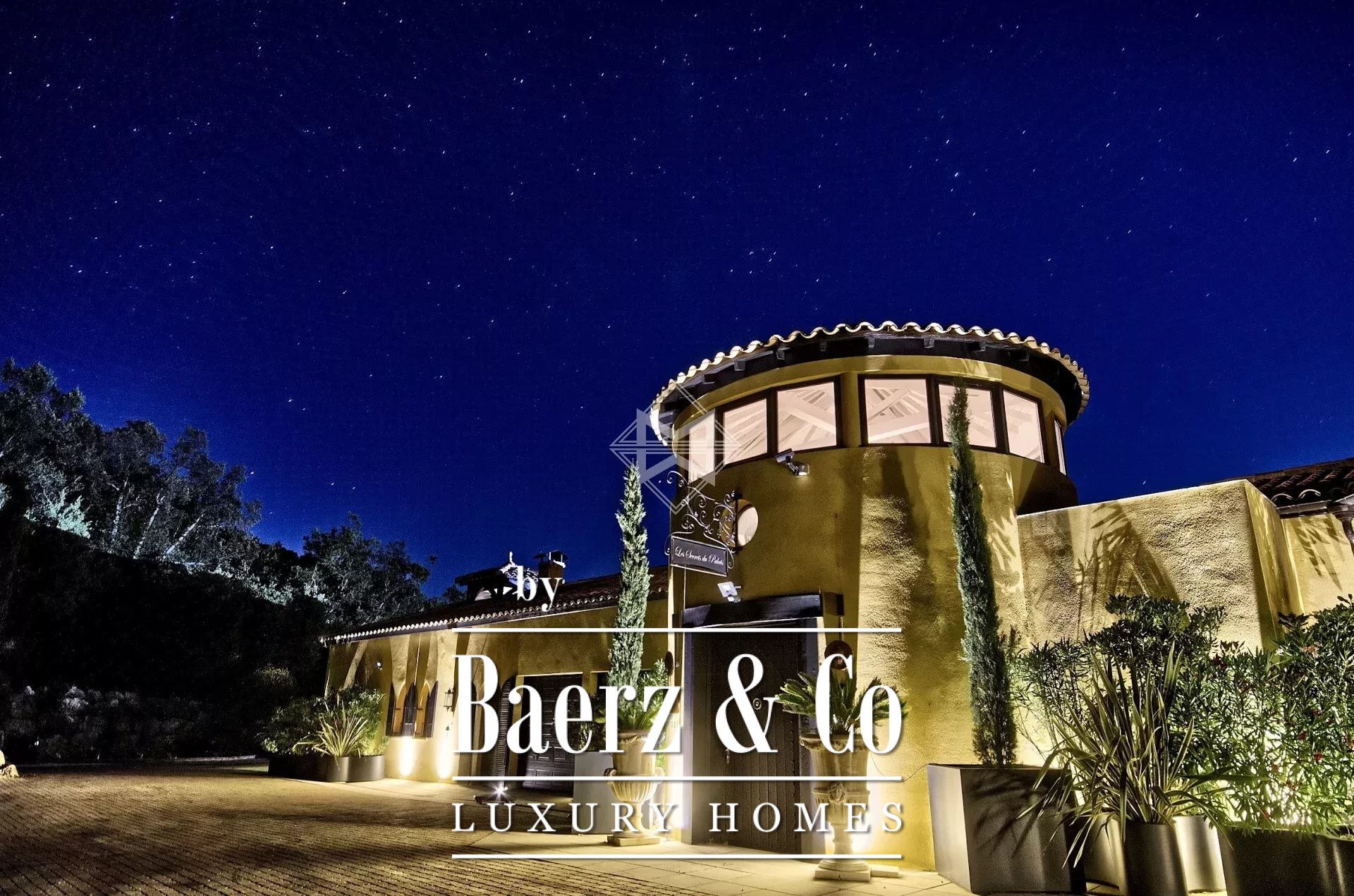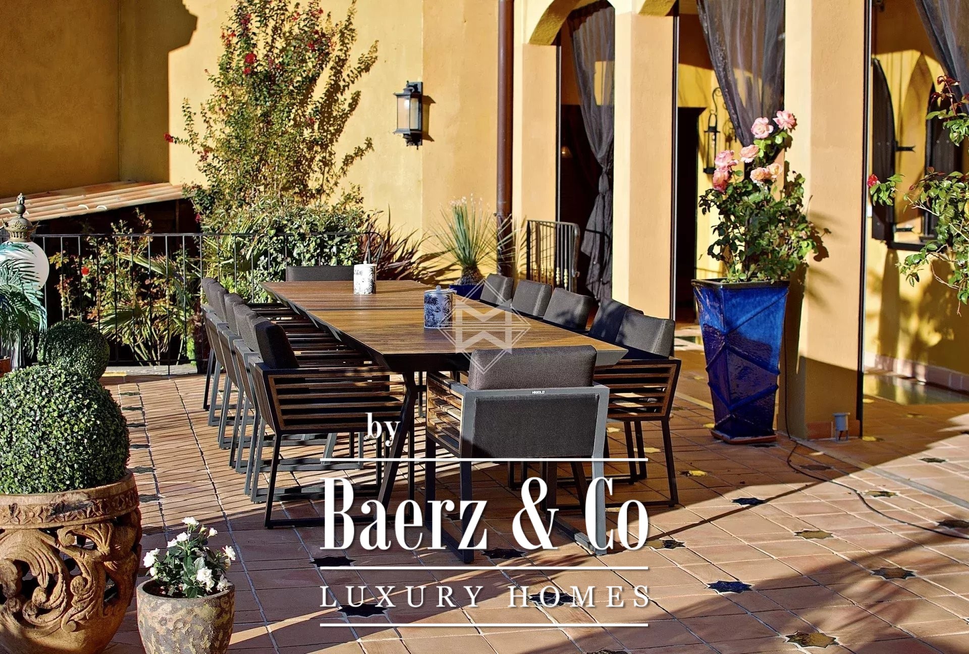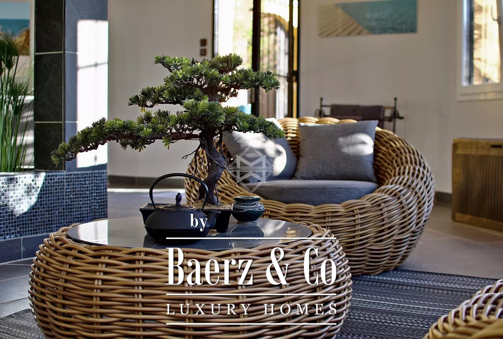 The main residence reveals expansive living areas designed for comfort and quiet flow, complemented by six bedrooms, each with a measured sense of privacy. A dedicated wellness area with spa, a luminous patio with fountain, and the presence of a large swimming pool evoke a serene, measured lifestyle.
