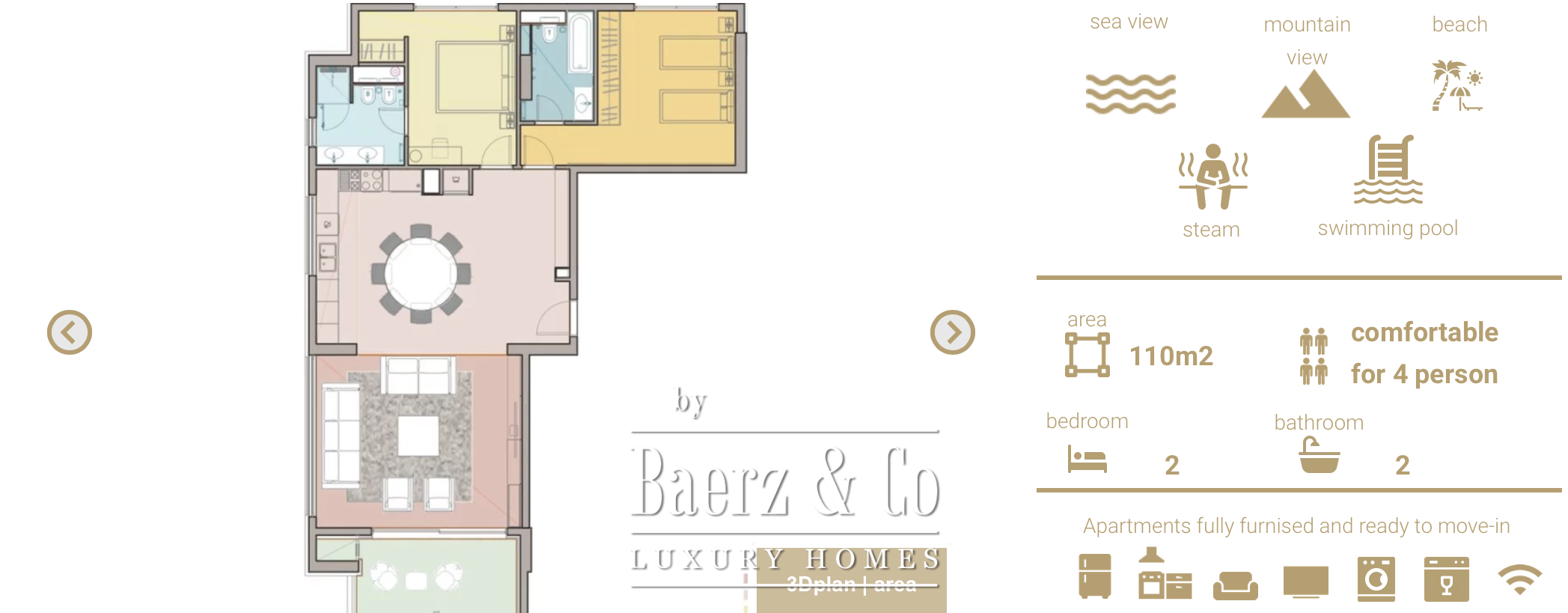 The interior comprises two distinctly separated bedrooms and two bathrooms, with a design attuned to comfort and natural light. The property extends a full furniture package, allowing for immediate coastal living or seamless transition to a holiday residence. Amenities at your disposal include reception services, security, technical support, a serene swimming pool, sunbeds, hammam, and a children’s playground.