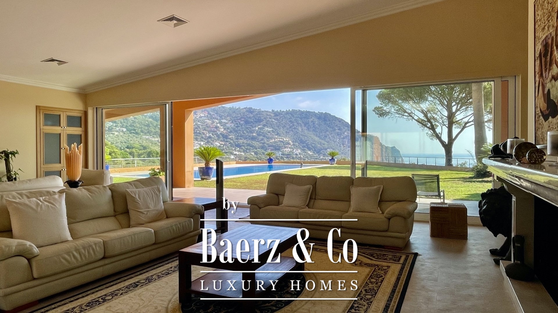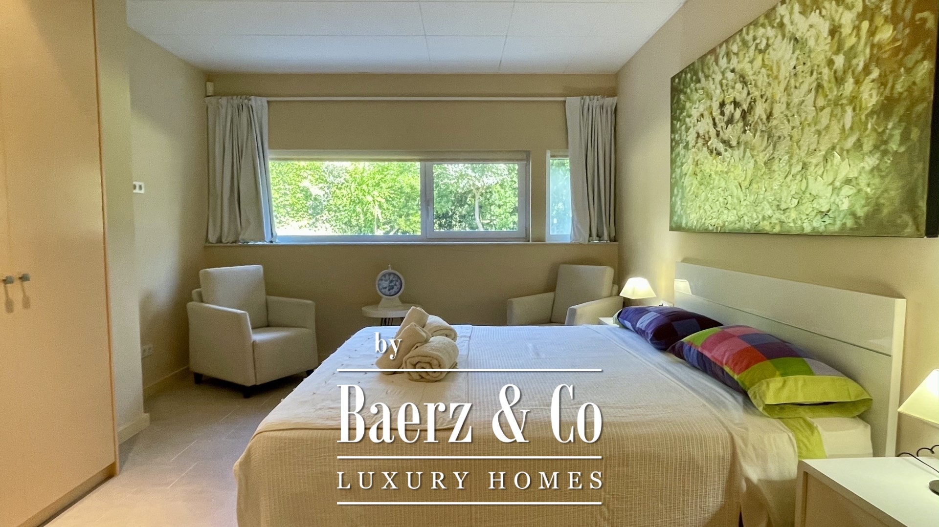 The principal suite measures nearly 70 m², featuring sea views, private terrace access, a fitted dressing room, and a bathroom with Jacuzzi, walk-in shower, and dual toilets. Two further en-suite bedrooms offer direct access to lush gardens, while a private study with solid wood shelving and the sound of a fountain cultivates tranquillity. Each room connects intuitively to the outdoors, maintaining the villa’s strong relationship with its Mediterranean setting.