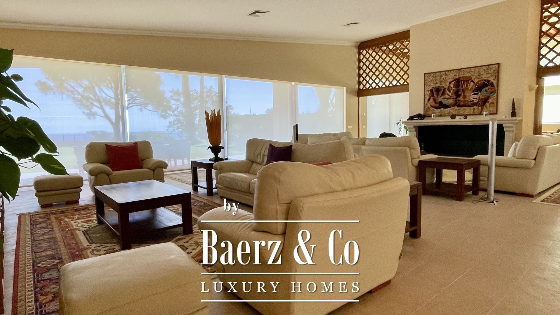 The experience begins along a sculpted pathway, arriving at a striking entrance that leads to a living room with double-height ceilings and exceptional light. Spaces flow between intimate fire-lit corners, a reading lounge, and open gathering areas—all facing expansive sea and garden vistas. A formal dining area seamlessly connects to a generous kitchen with central island, opening out to a covered terrace with lounge and gas barbecue for al fresco evenings.