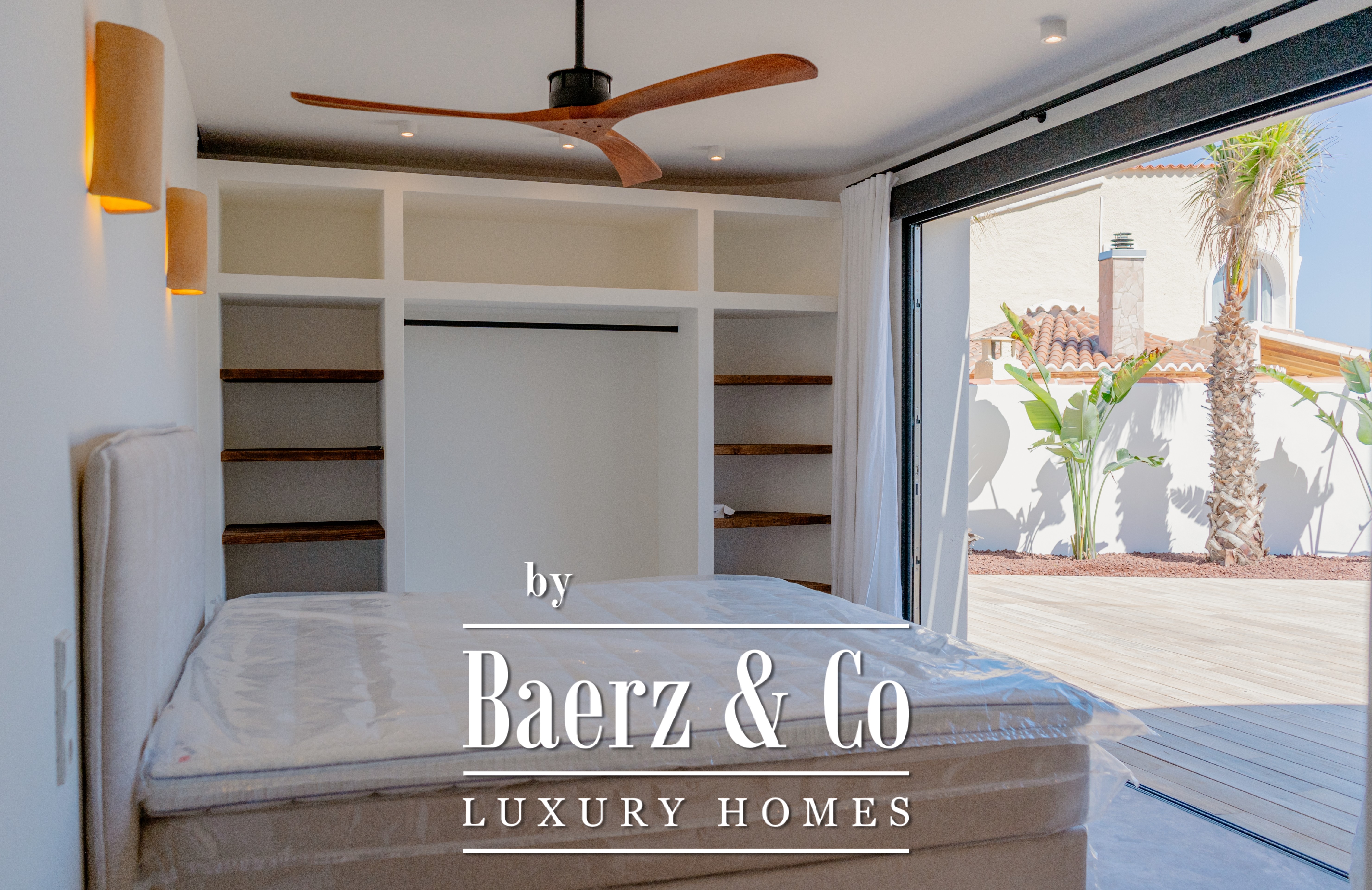 The Mediterranean garden, fully landscaped with automatic irrigation and surrounded by palm trees and lush planting, provides a green setting where peace and beauty take center stage. On the main floor, you will find the impressive master suite with panoramic sea views, a freestanding bathtub, walk-in shower, and a luxurious custom-made dressing room in thermally treated Movingui wood – a sustainable and stylish accent subtly repeated throughout the house.