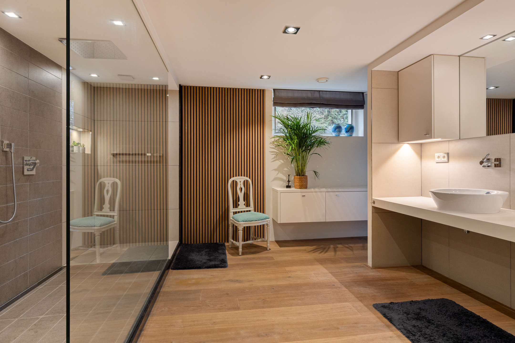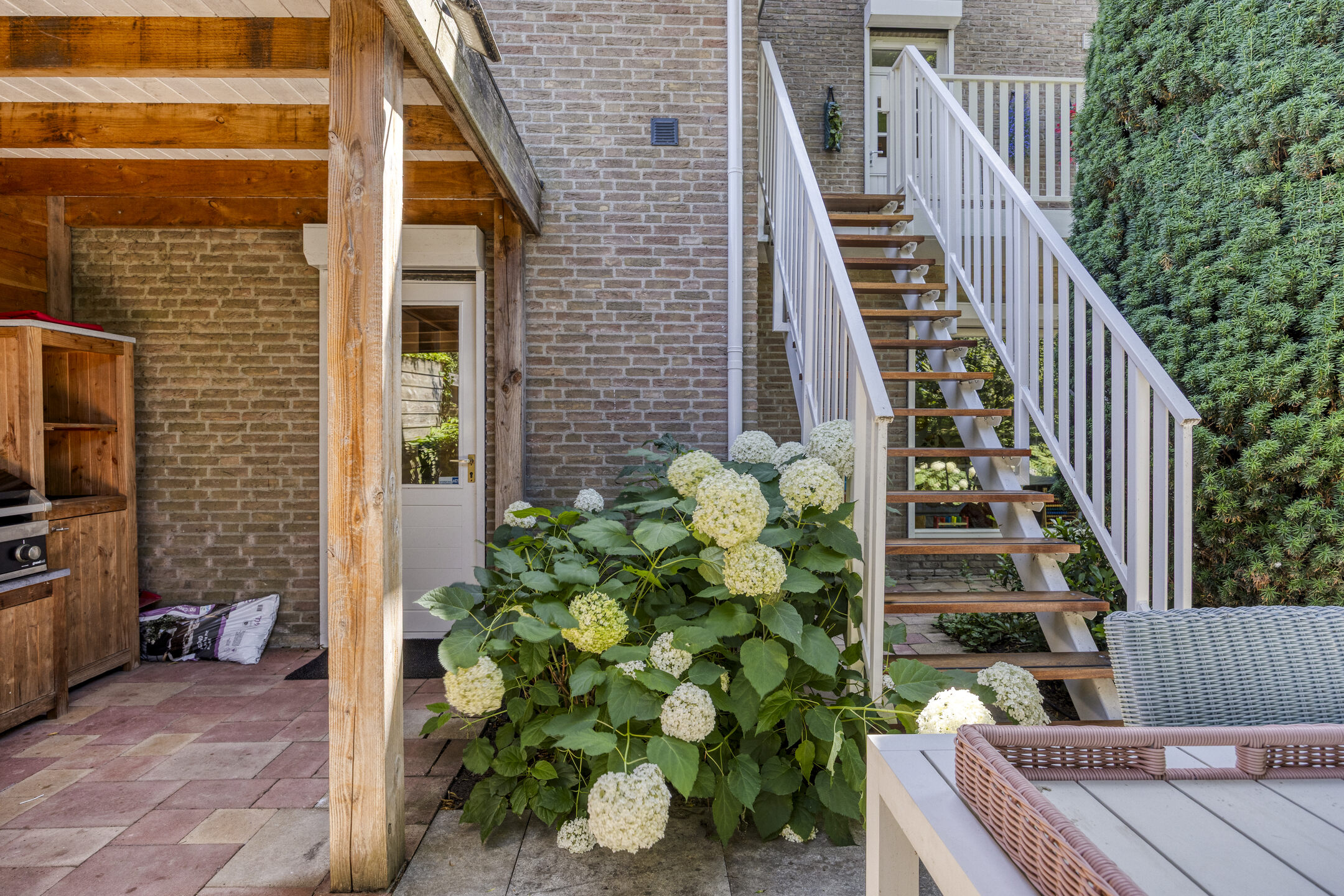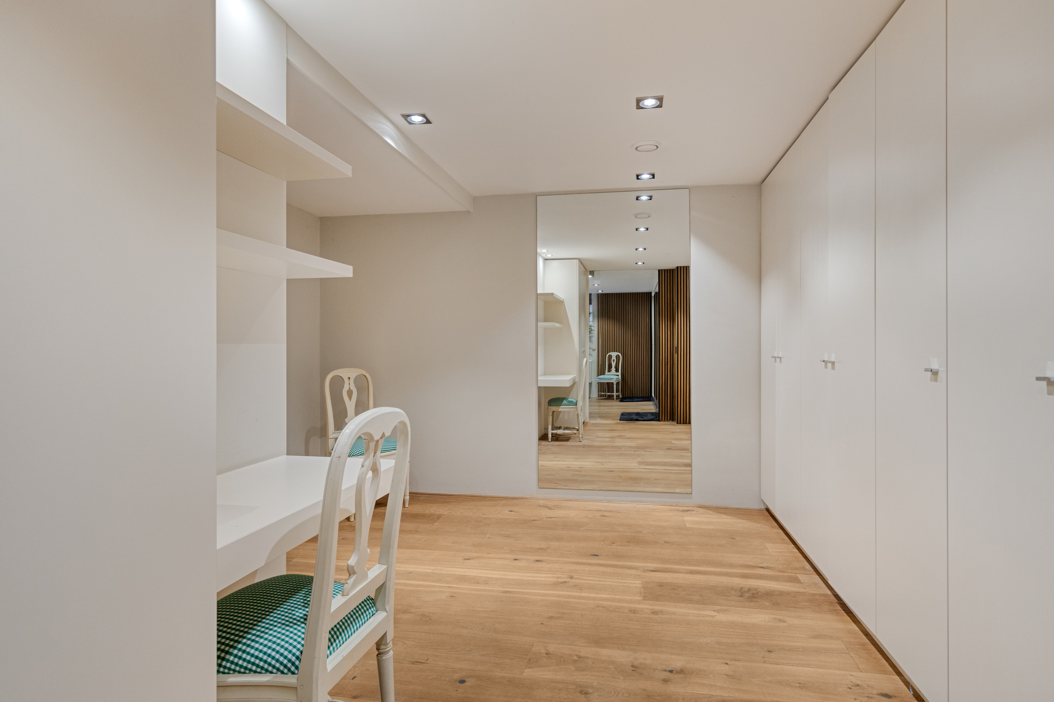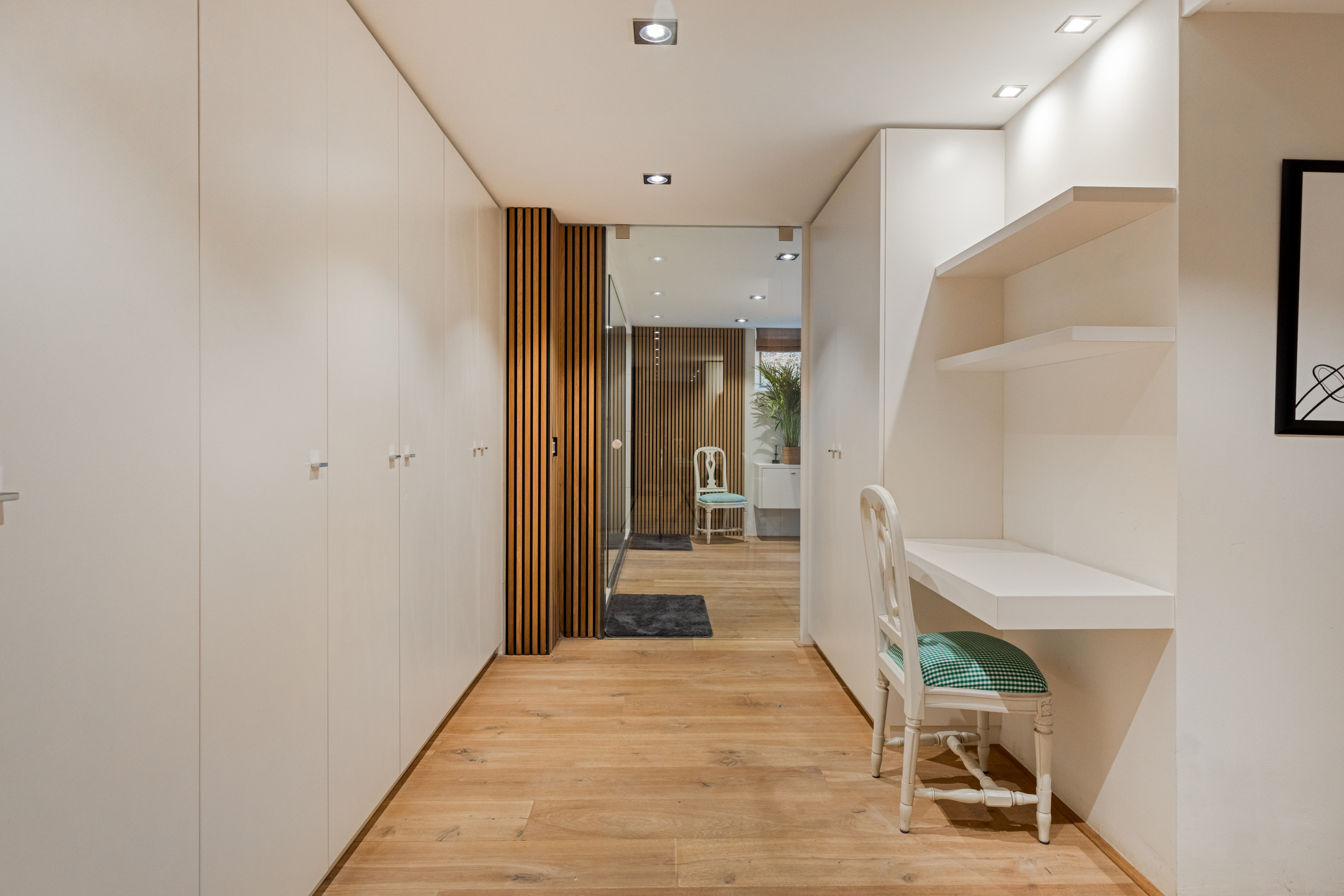 A large driveway with electric charging point introduces the property, complemented by a private garage. Expanses of glass and a serene conservatory suffuse the main living area with light, where a wooden floor and open fireplace create a welcoming atmosphere. The kitchen, with its modern island and extensive built in appliances, includes features such as a climate cabinet, Quooker and steam oven. Adjacent balconies and gardens offer seamless transitions between indoor and outdoor life, with sun throughout the day and practical roll down shutters, sun awnings and twenty solar panels ensuring both comfort and efficiency.