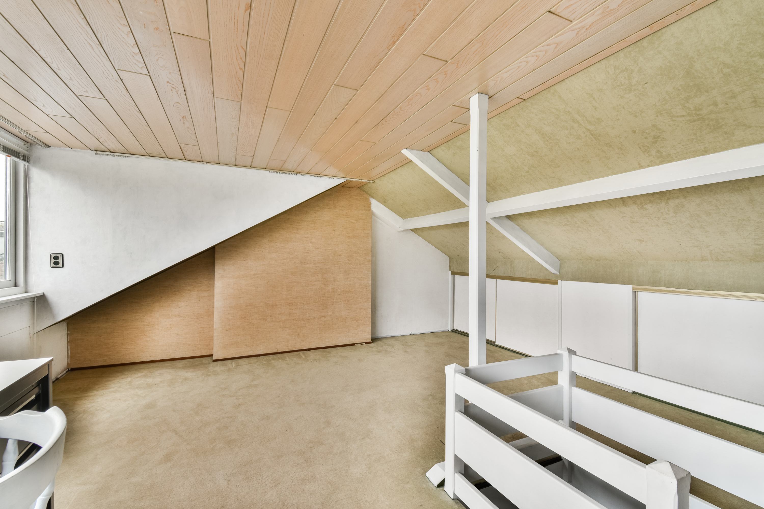 Spacious attic with dormer window and practical storage behind the knee walls, ideal for additional storage.