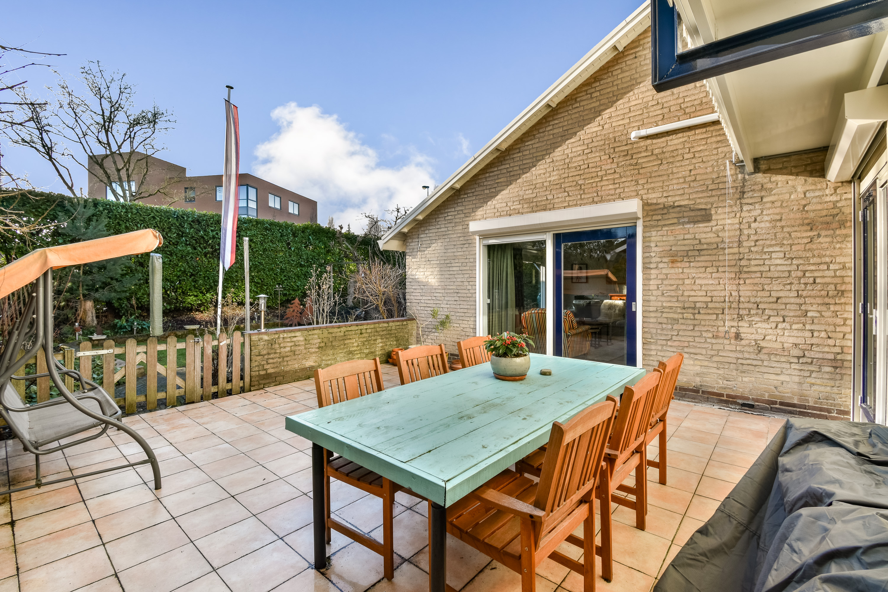 On the ground floor, the entrance opens into a spacious living room with air conditioning and a fireplace, complemented by wide doors leading directly to the garden and sunny patio. Adjacent to the kitchen equipped with built-in appliances lies a utility room and indoor storage. The massief oak flooring throughout the main level introduces warmth, while an extra versatile room opens onto the garden, providing possibilities for home office or creative pursuits.