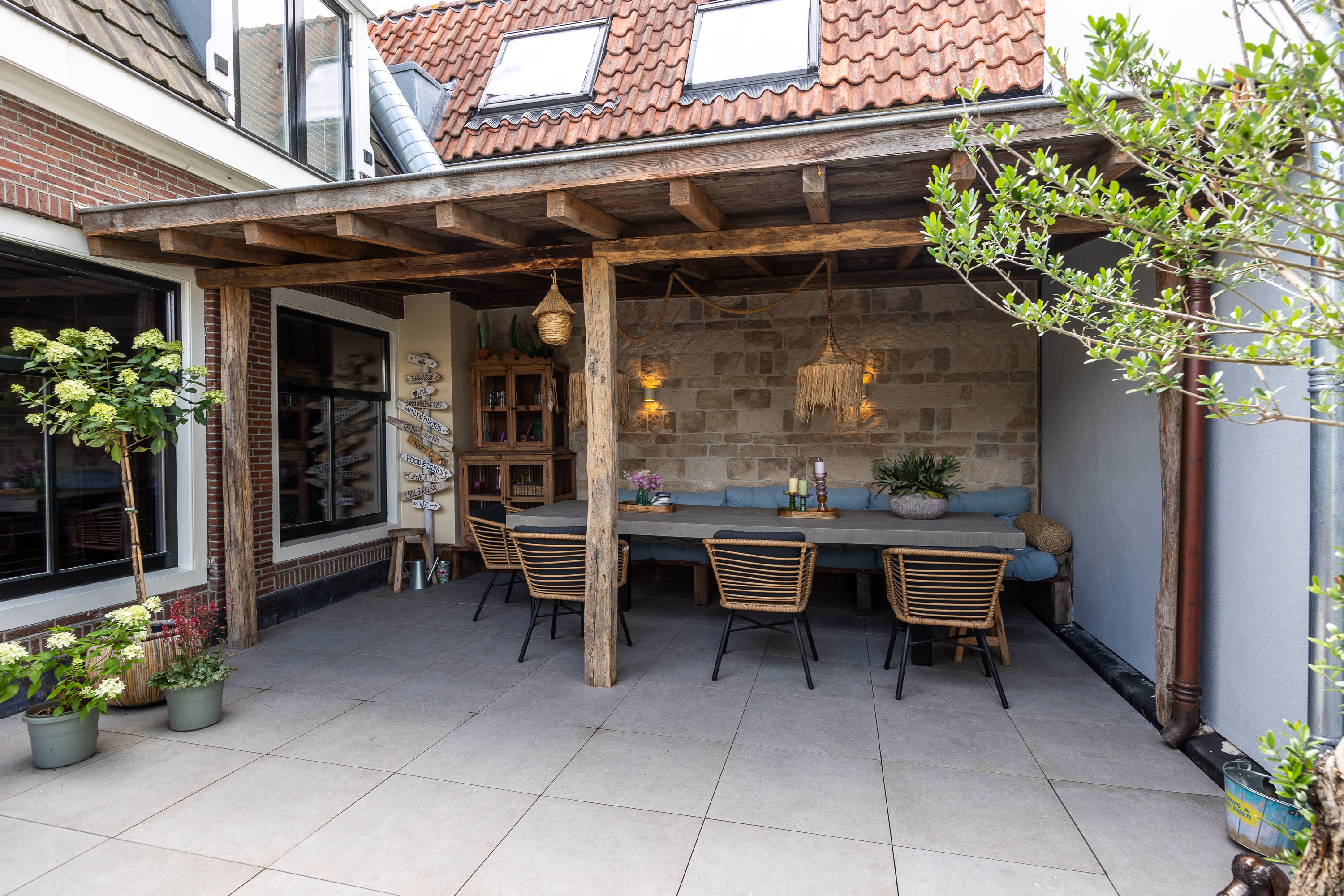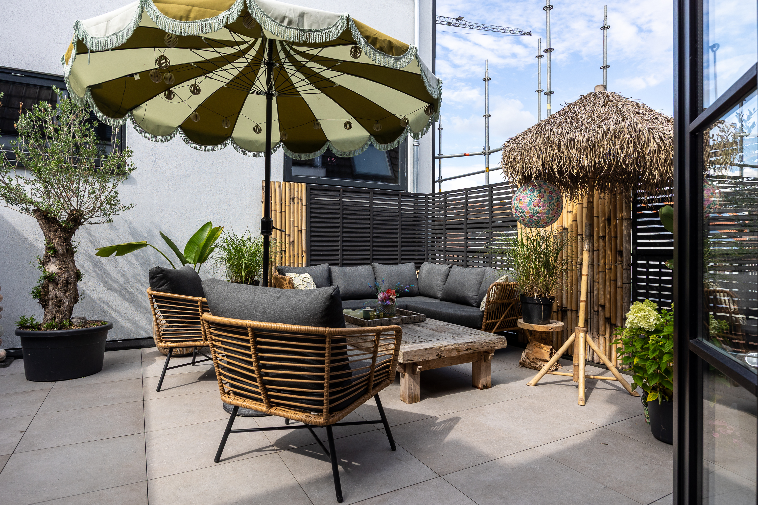 Through a hallway with built-in cupboards and space for an extra refrigerator, you step right onto the roof terrace. This spacious, sunny terrace is fully tiled and equipped with an attractive canopy, a fixed bench, and a custom-made table. Here you will experience complete peace and privacy, right in the center of town. A wonderful outdoor retreat, perfect for dinners, drinks, or a cup of coffee in the morning sun.