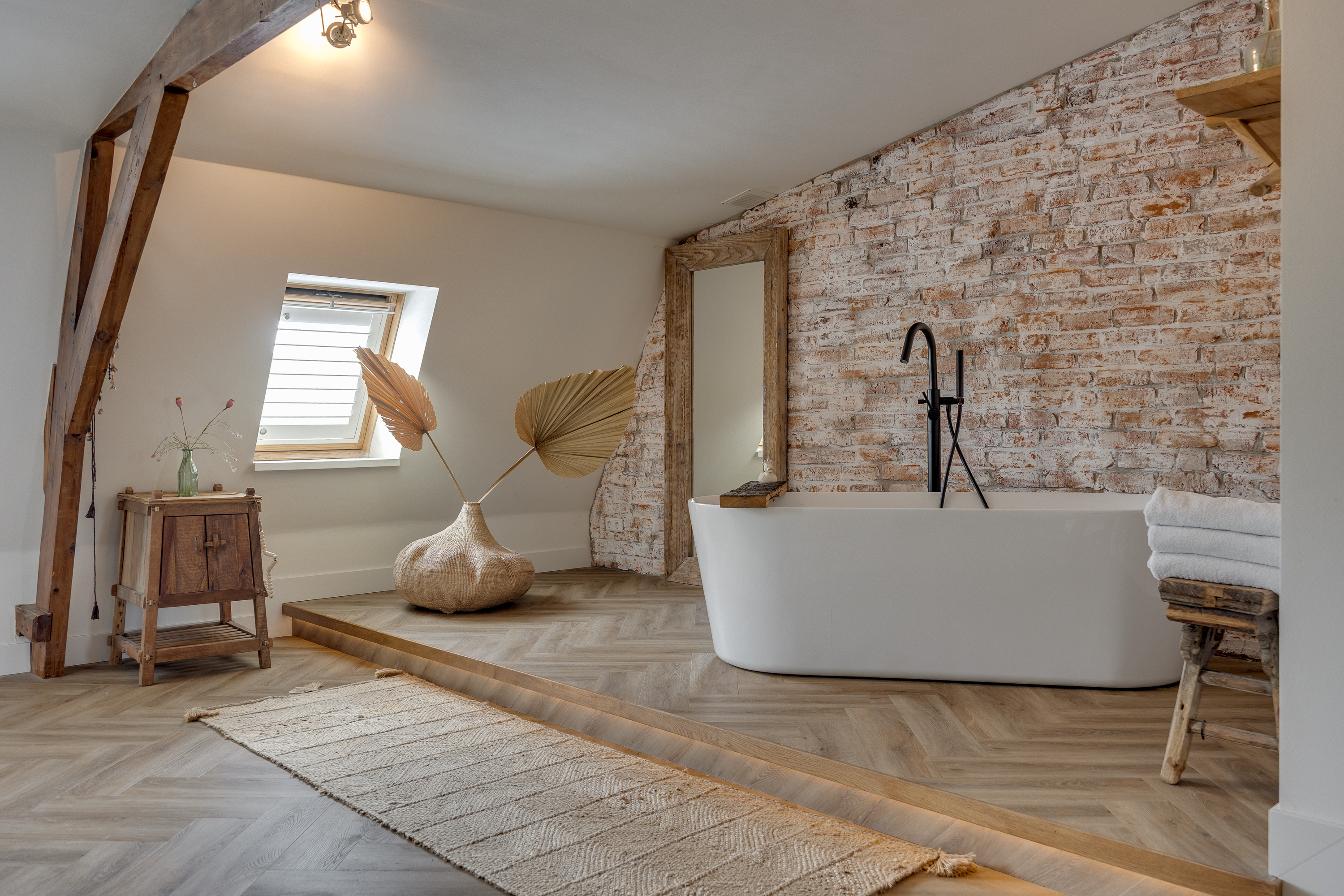 There is also a second bathroom with a walk-in shower, washbasin, toilet, and space for a washing machine and dryer. An additional separate toilet is located on the landing. Authentic wooden beams have been left exposed and provide an attractive contrast to the modern finish.