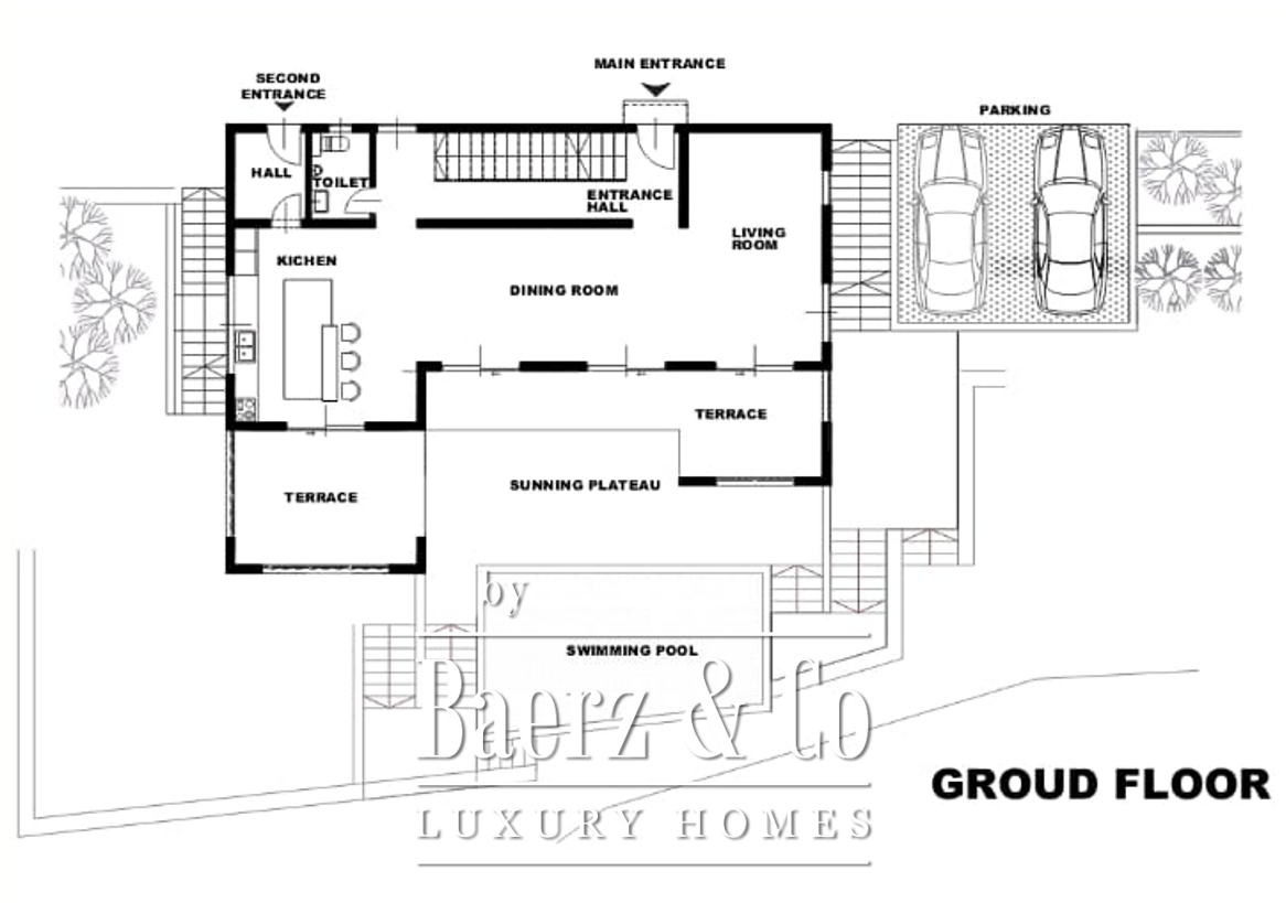 The villa has 3 levels. It has a pool and a sauna. The villa has 4 parking spots behind it. It is connected by an asphalt road to the main road.
