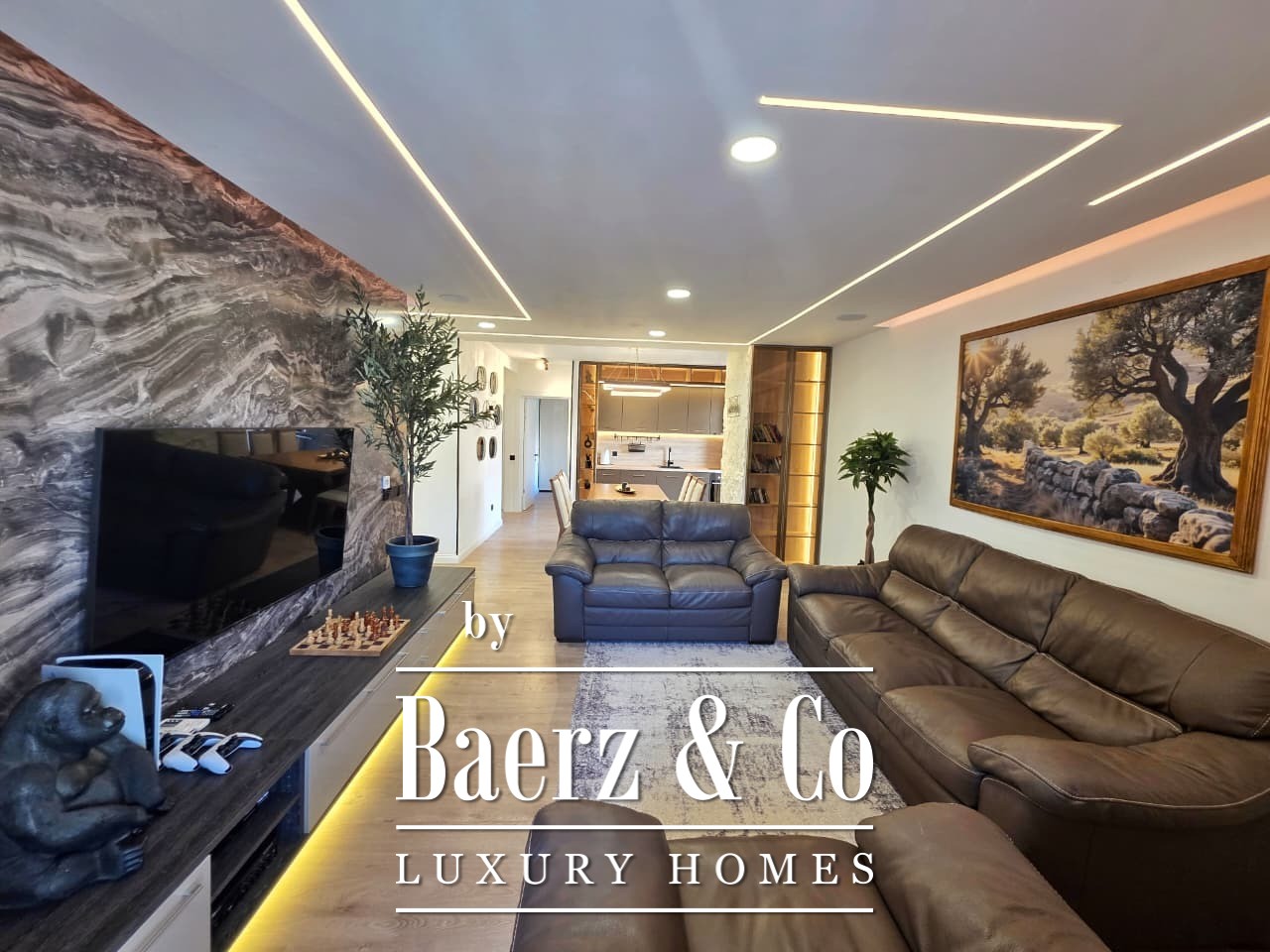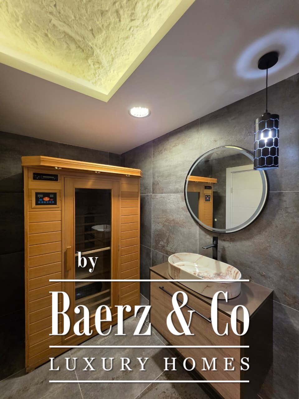 The layout includes a hallway, an open-plan living room with kitchen and dining area, three bedrooms, and two bathrooms. A private sauna offers a dedicated space for relaxation, while four terraces extend the living experience outdoors. Both bathrooms are enhanced by underfloor heating, managed together with the main heating system and boilers via a mobile app for modern comfort. Electric curtains and air-conditioning in every room provide a tailored indoor climate in each season.