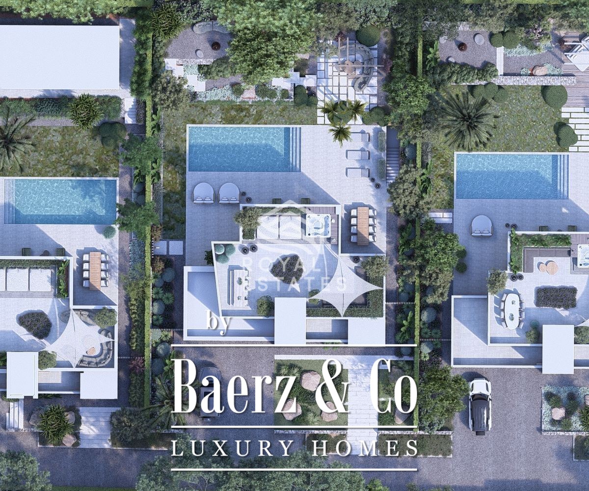 Glass walls dissolve boundaries, saturating the villa with natural light throughout the day. Terraces offer settings for dining, relaxation, and gatherings, alongside a private swimming pool set within landscaped gardens and a rooftop terrace with a dedicated barbecue area for evenings under changing skies. Air conditioning, fitted wardrobes, first class carpentry, and a smart home system underline comfort at every turn.