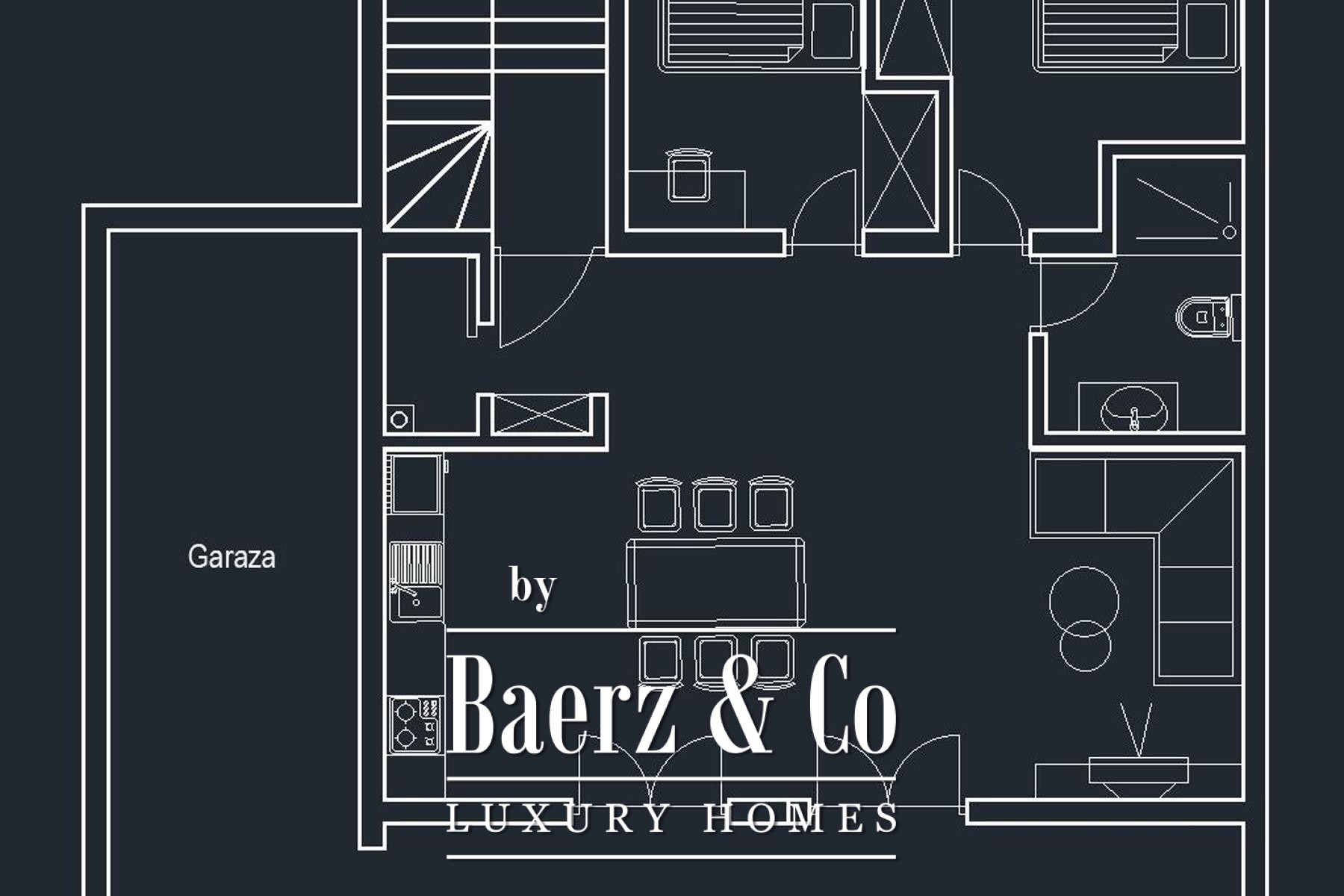 The second floor comprises a studio and an additional apartment, both featuring private balconies facing the Adriatic. The larger apartment offers a living space with kitchen and dining, two bedrooms, and a bathroom. This house in Crikvenica is sold fully furnished, equipped with air conditioning, solar water heating, and a central heating system with a heat pump for comfort throughout the year.