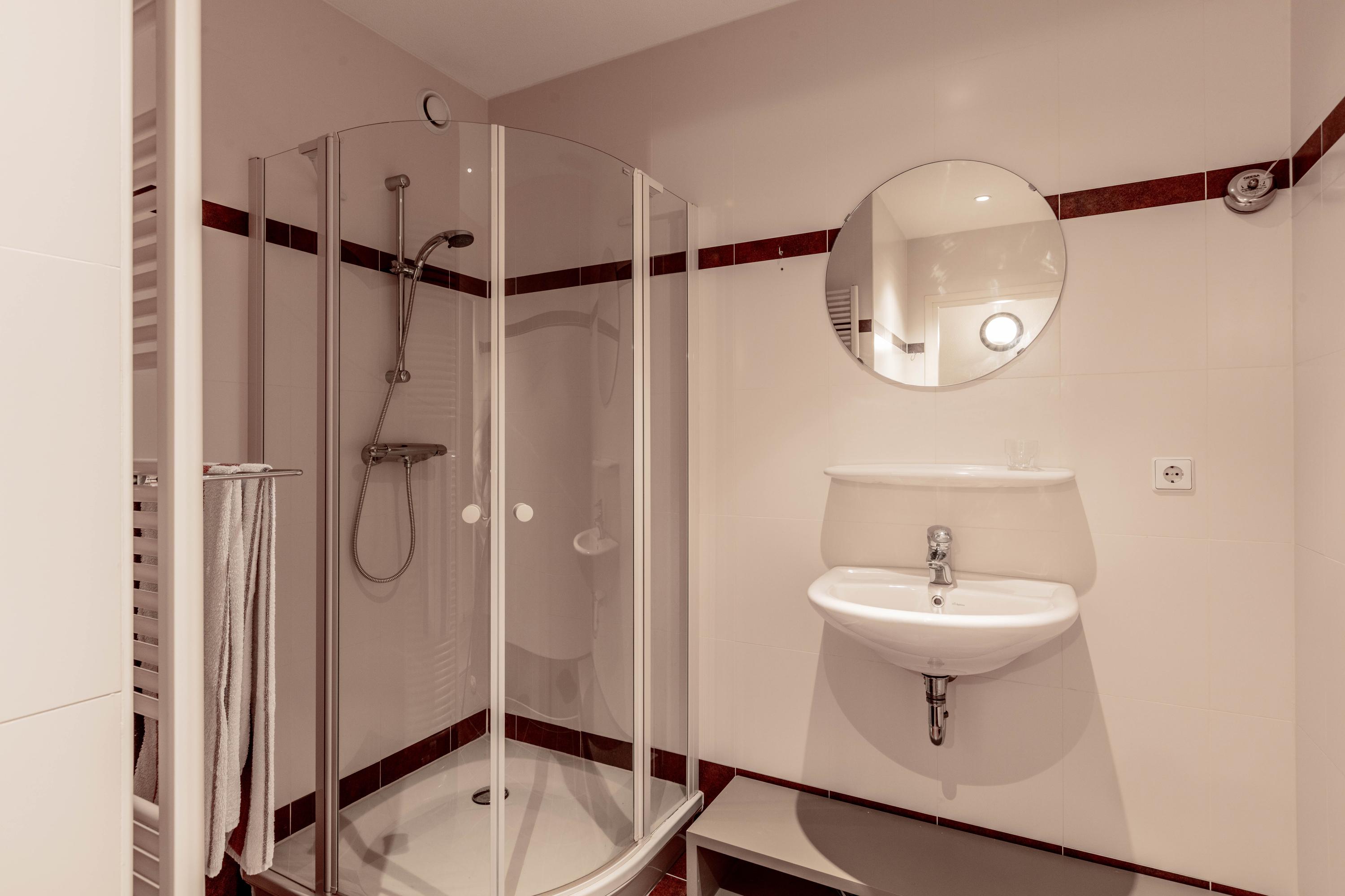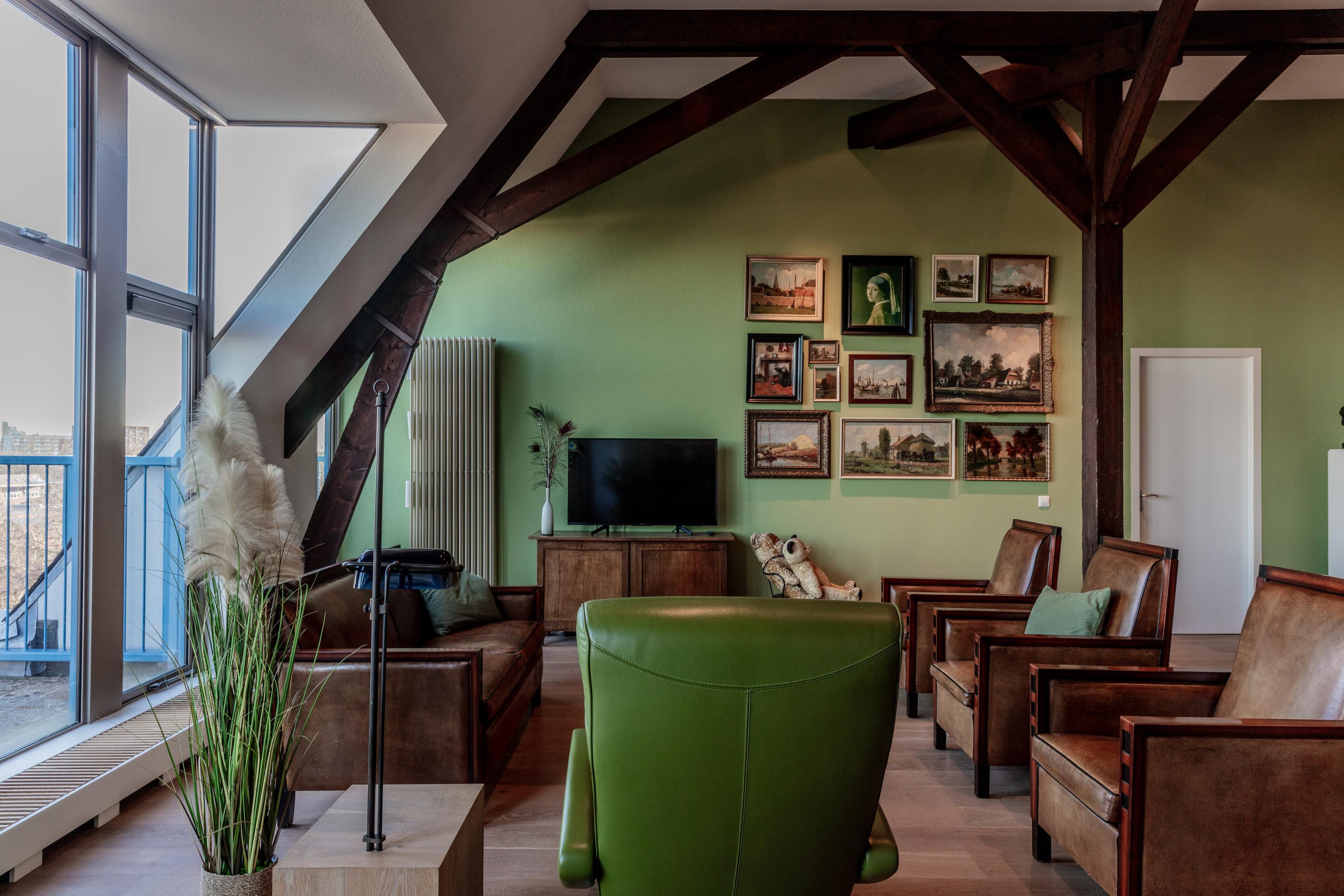 Inside, two generous bedrooms each provide a dedicated bathroom and direct access to an outdoor balcony, capturing open sightlines over Delft and the Schie. The voluminous living area features oak parquet flooring and soaring ceilings, while the Siematic kitchen is fitted with a marble countertop and premium integrated appliances. A mezzanine overlooks the main living zone, providing space for fitness, play, or retreat.