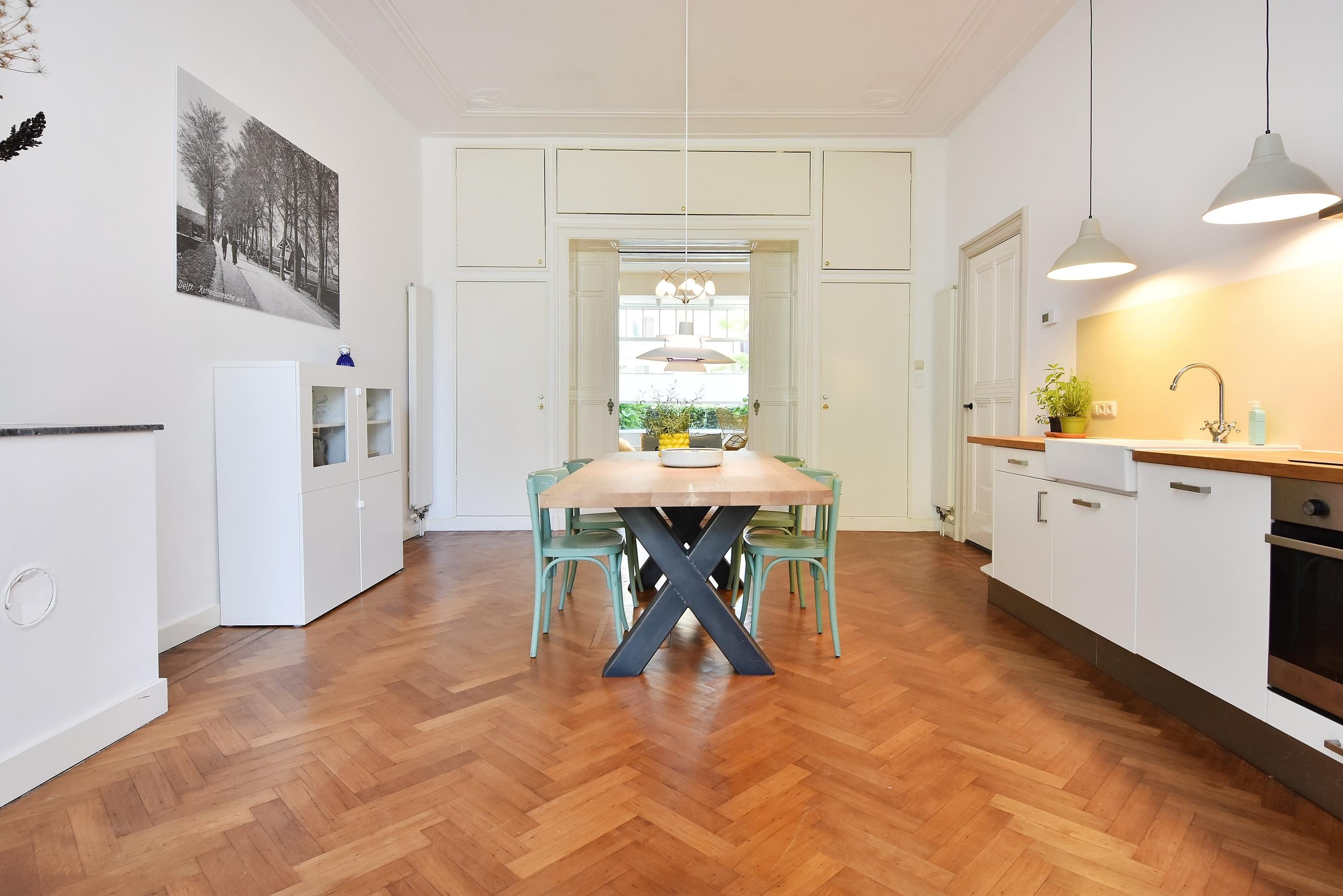 This stately townhouse is situated in a child-friendly and ideal residential neighborhood, within walking distance of Delft’s historic center. Theater, cinema, film house, restaurants, cafés, and terraces are all close by. For daily groceries, a small supermarket can be found on Rotterdamseweg, with a larger supermarket at Bastiaansplein.