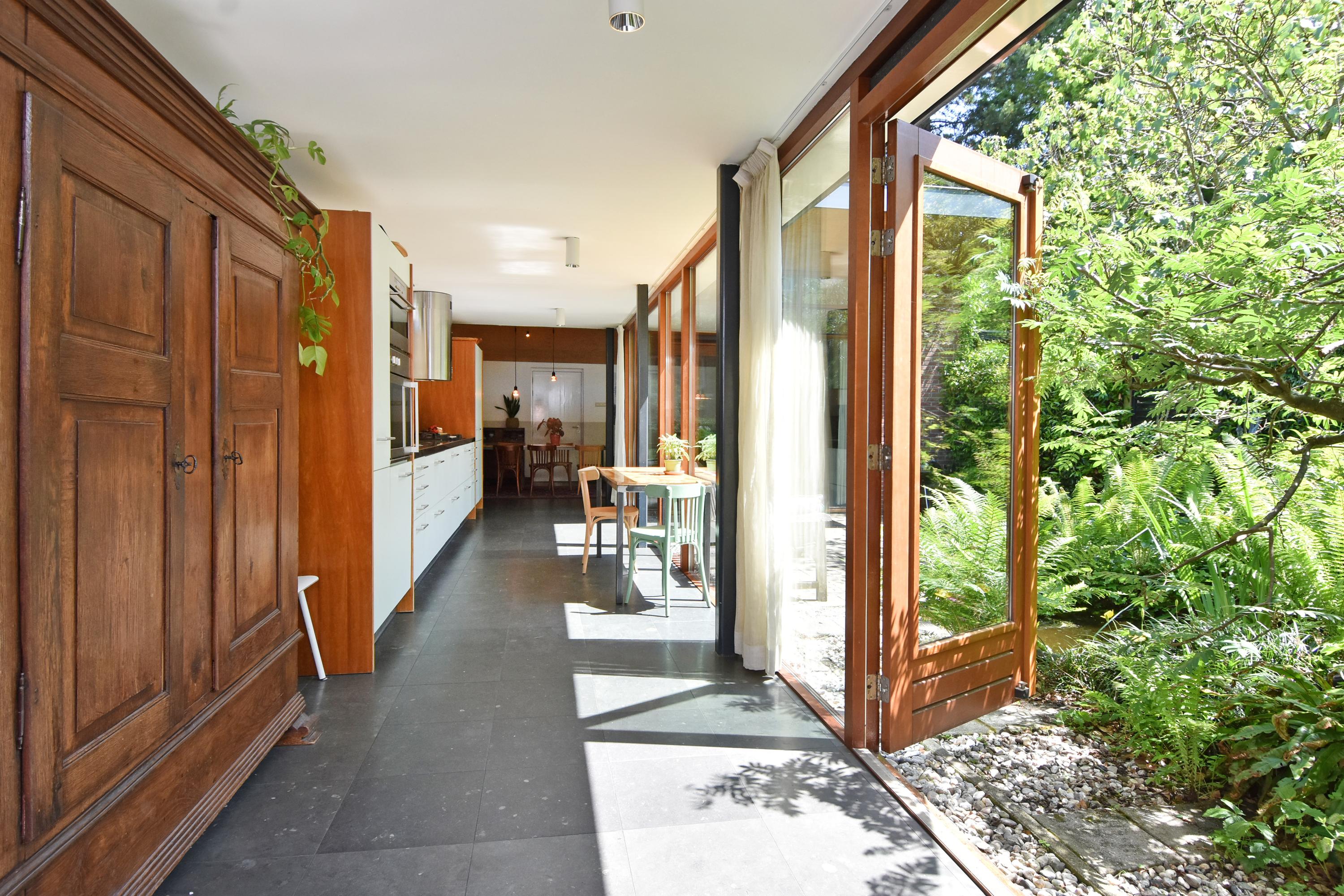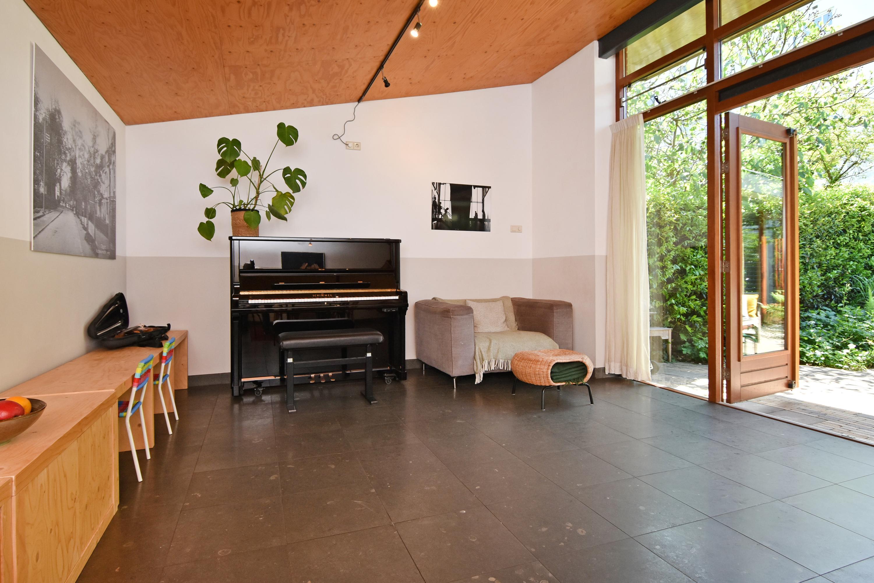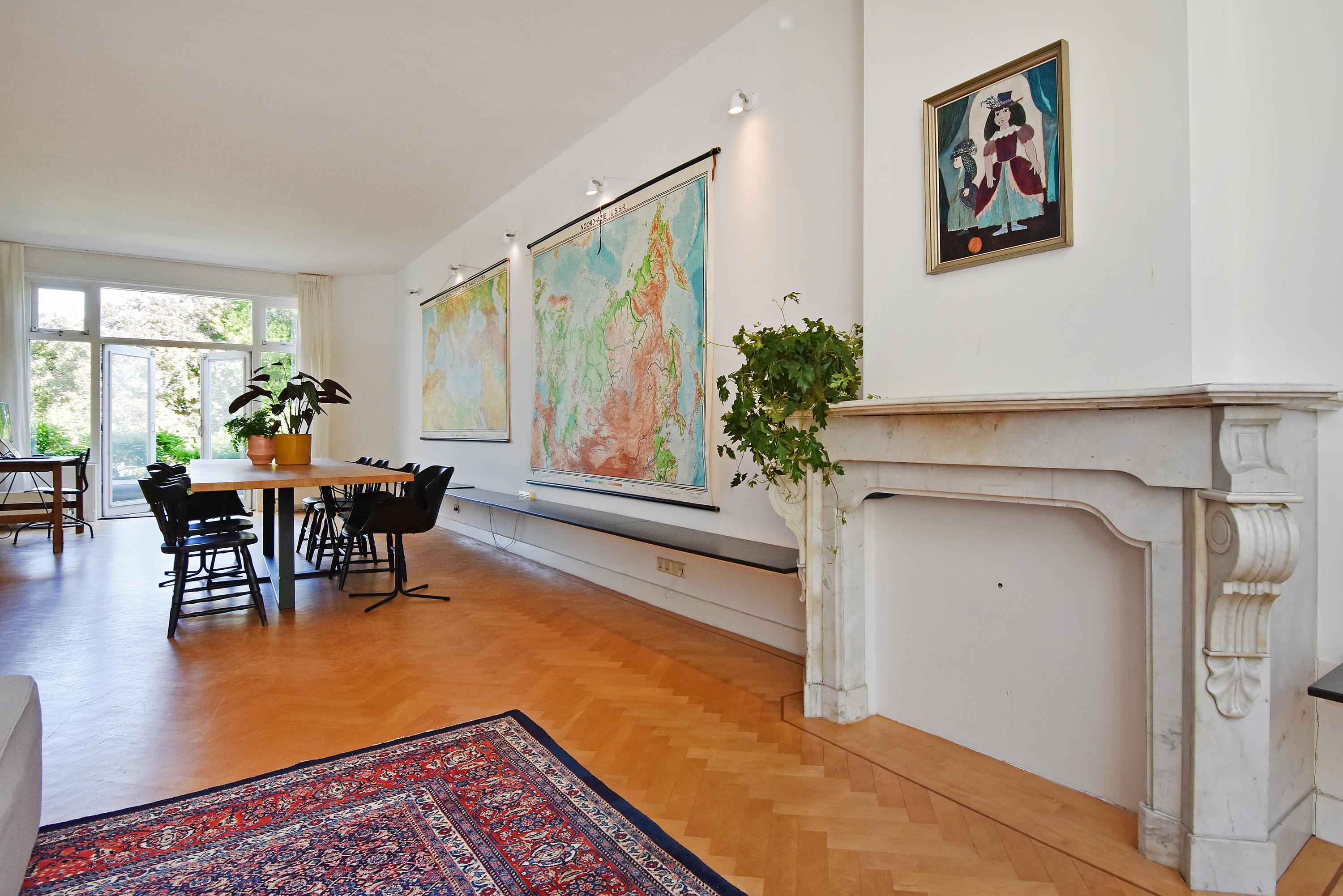 A modern extension forms a remarkable combination with the historic house. Here you will find a fully equipped and spacious kitchen, featuring a large block with stainless steel countertop, drawer units, excellent workspace, and many (designer) built-in appliances. Large windows provide unique views of the beautifully landscaped, lush, and sunny garden. Adjoining is a generous dining and music room, which also opens onto the back garden via French doors. This dining room also connects to the large garage at the rear, which benefits from daylight and can also be accessed via the side street.