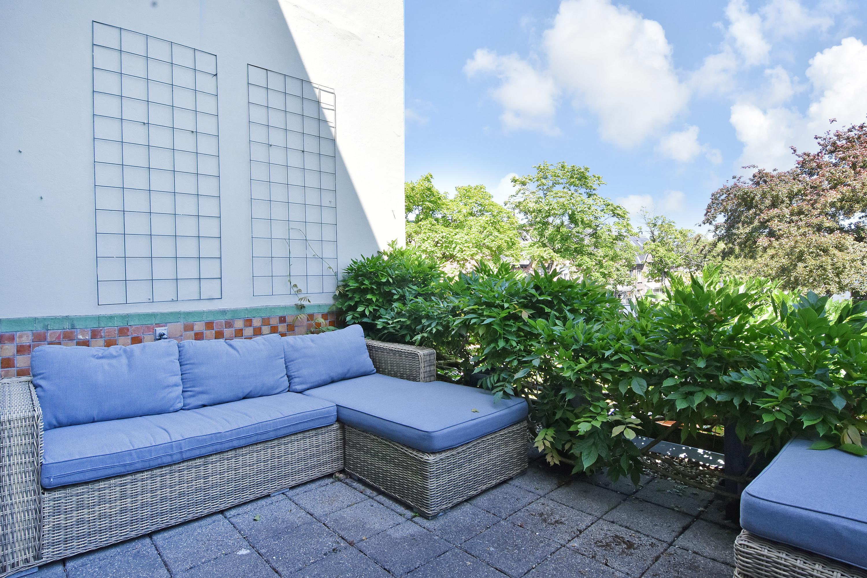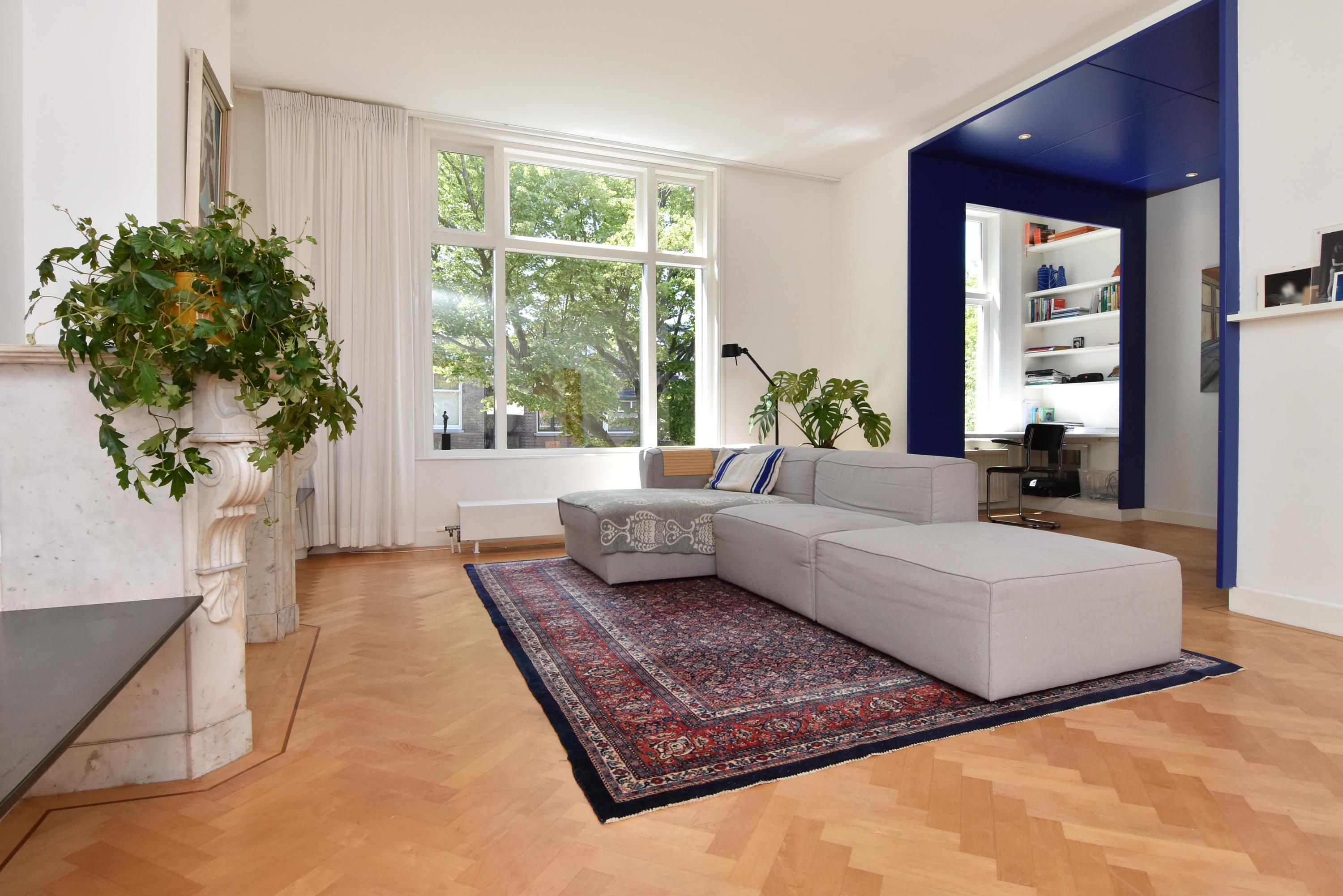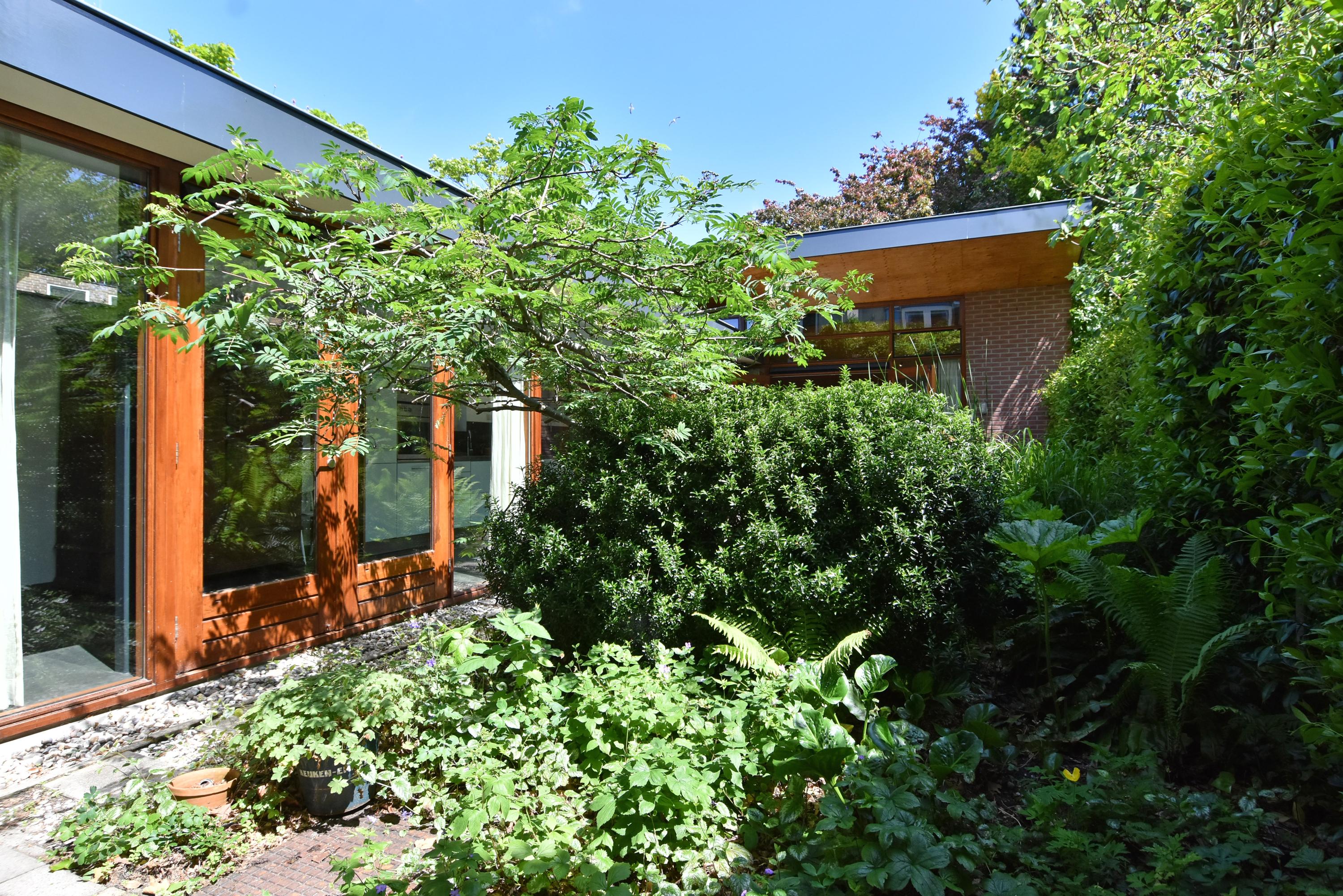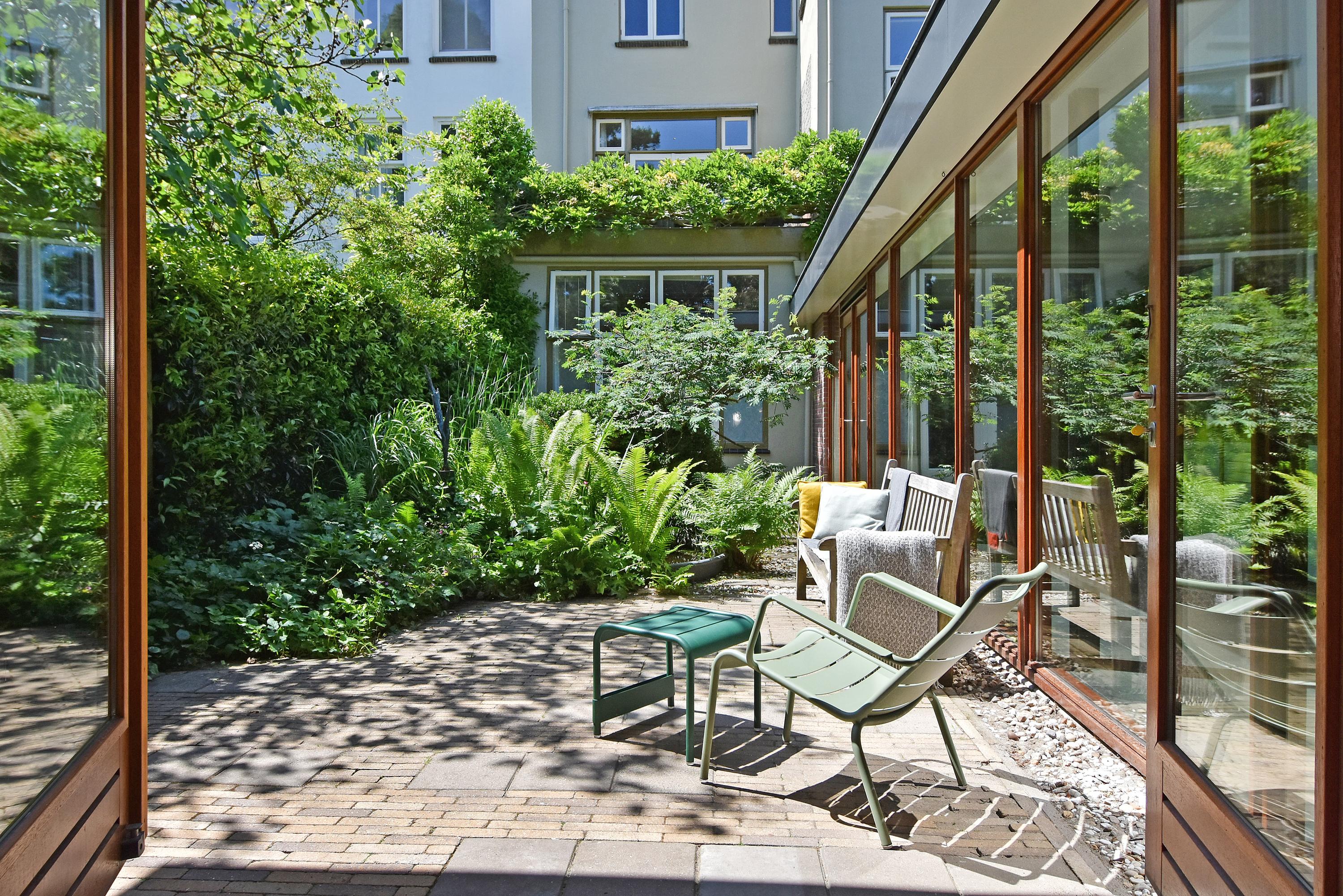 A modern extension forms a remarkable combination with the historic house. Here you will find a fully equipped and spacious kitchen, featuring a large block with stainless steel countertop, drawer units, excellent workspace, and many (designer) built-in appliances. Large windows provide unique views of the beautifully landscaped, lush, and sunny garden. Adjoining is a generous dining and music room, which also opens onto the back garden via French doors. This dining room also connects to the large garage at the rear, which benefits from daylight and can also be accessed via the side street.