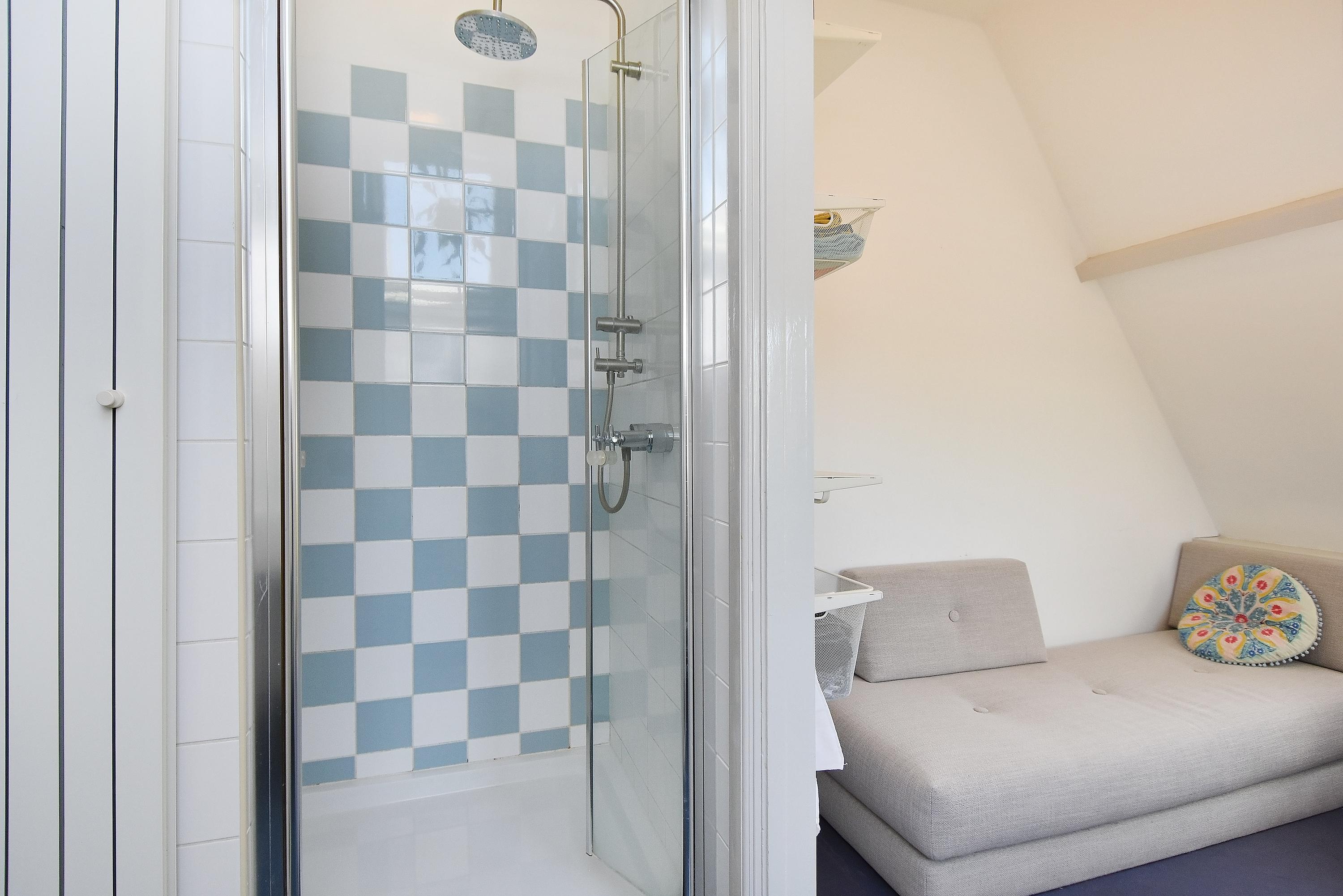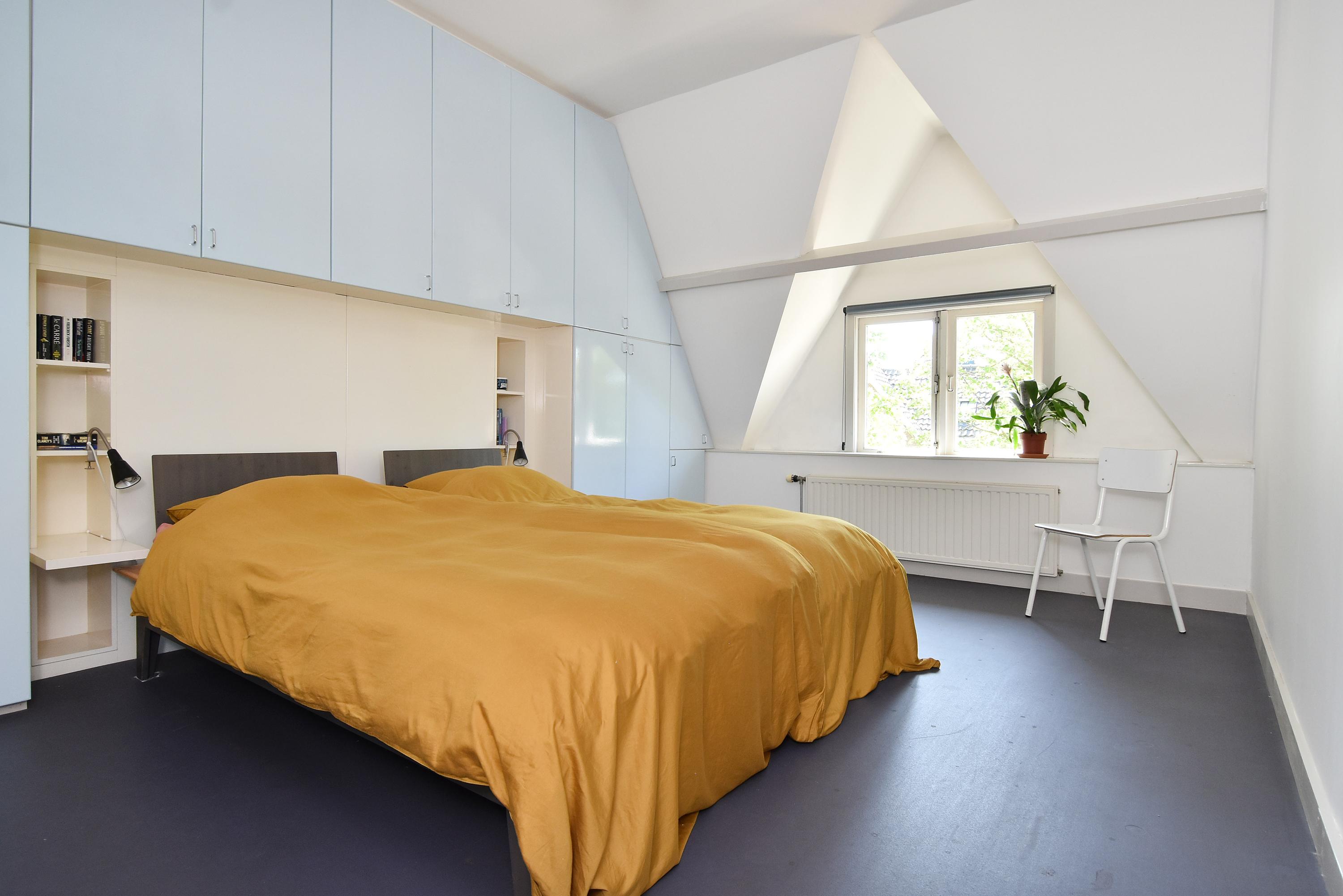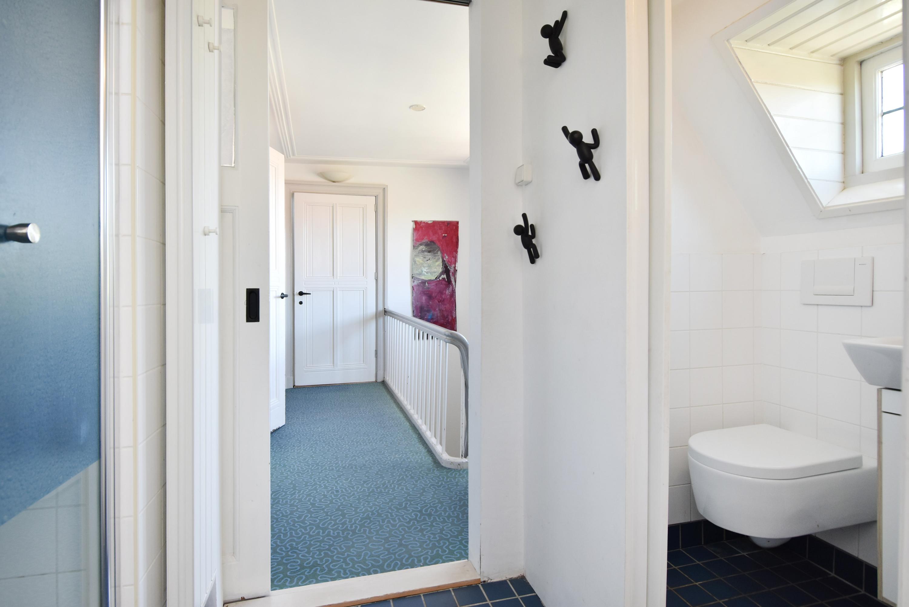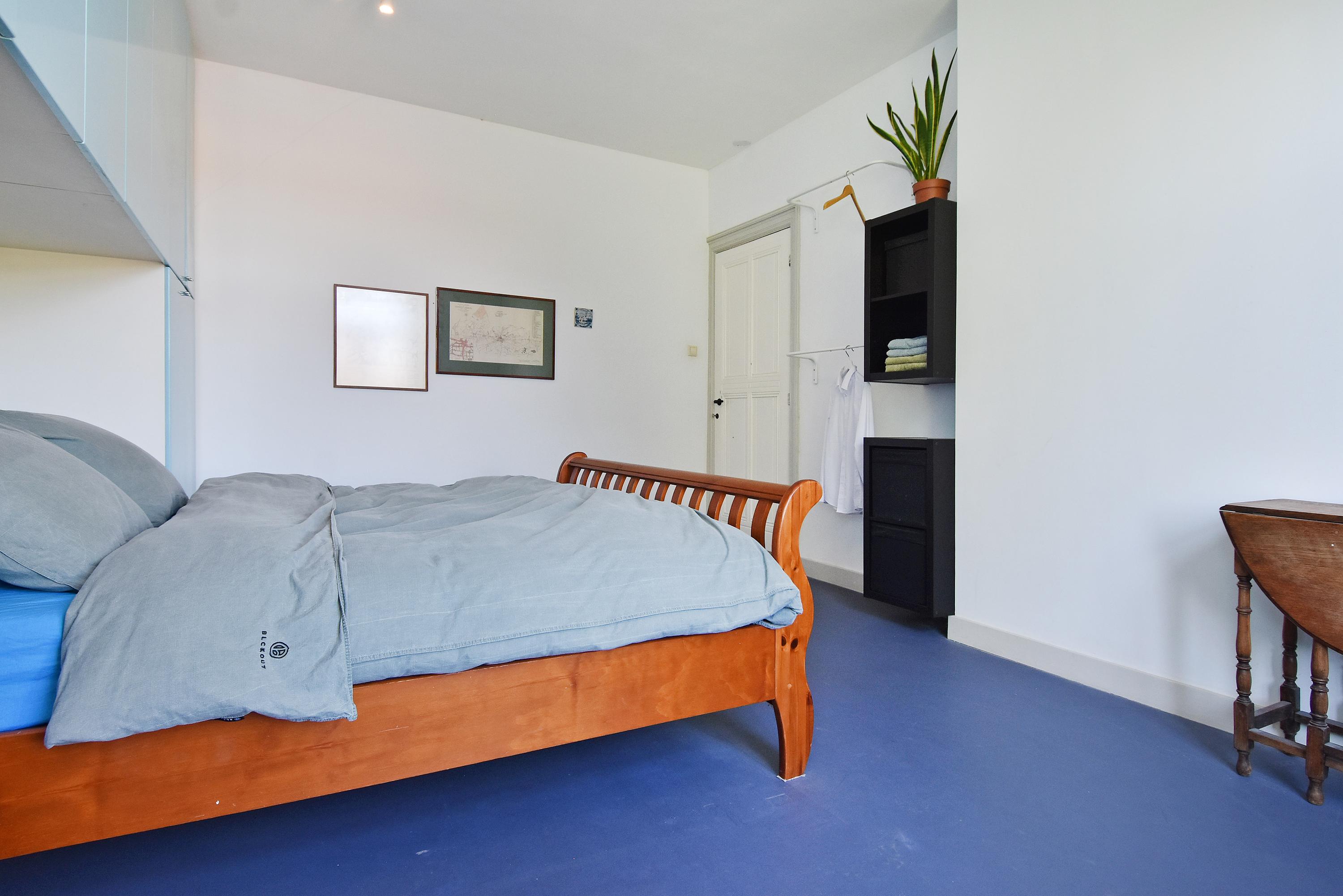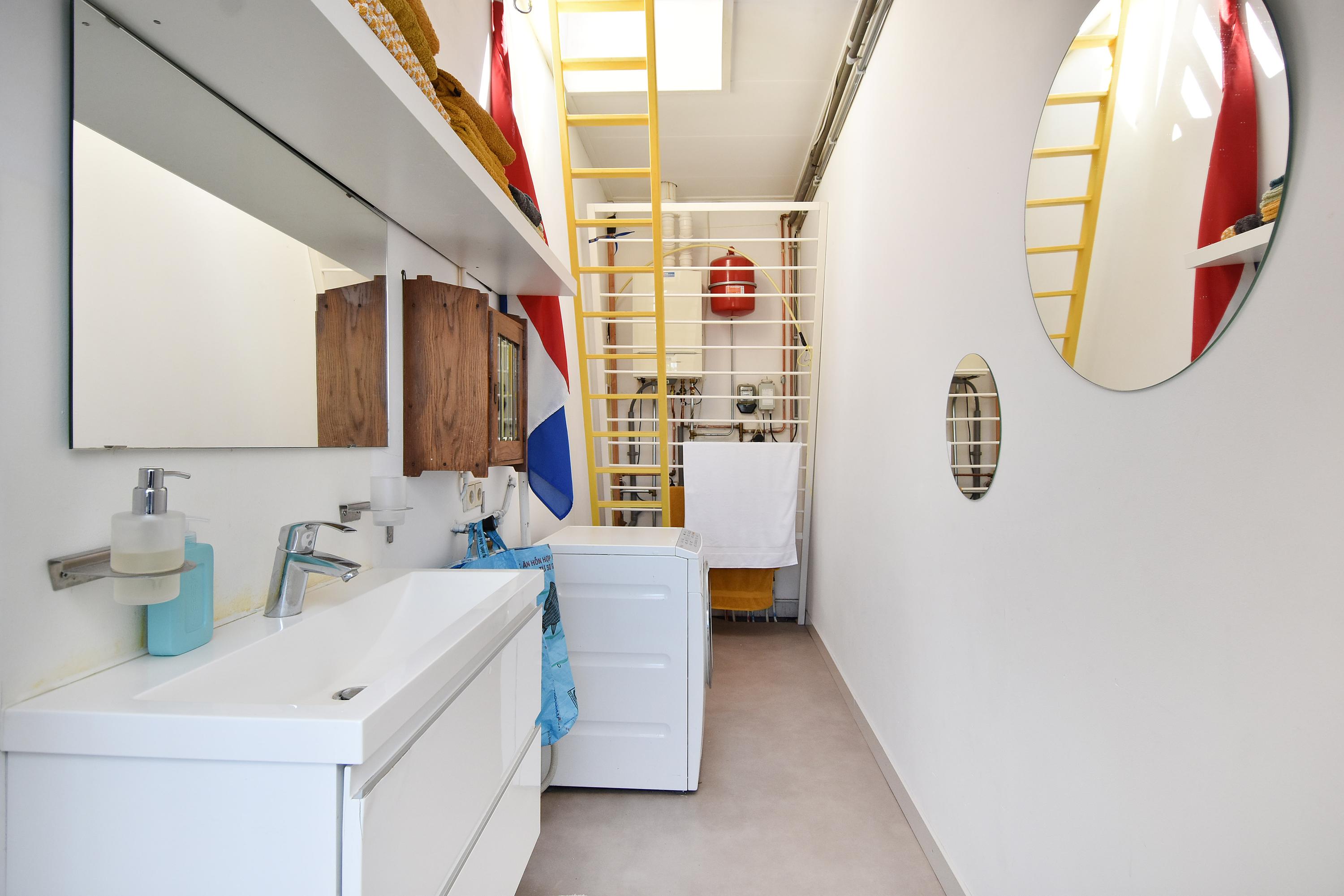The top floor, with its bright landing and side windows, offers sweeping views of Delft’s towers. This level includes a bathroom with shower, sink, and fourth toilet, plus a rear-facing bedroom. At the front, you’ll find the generous master bedroom with ample wardrobe space. In the center is a large storage/laundry room with abundant storage, central heating boiler, washing machine, and dryer connections, with access to the roof via loft ladder. At the rear, there are two further spacious bedrooms, one of which features its own en suite bathroom with shower, sink, and fifth toilet.
