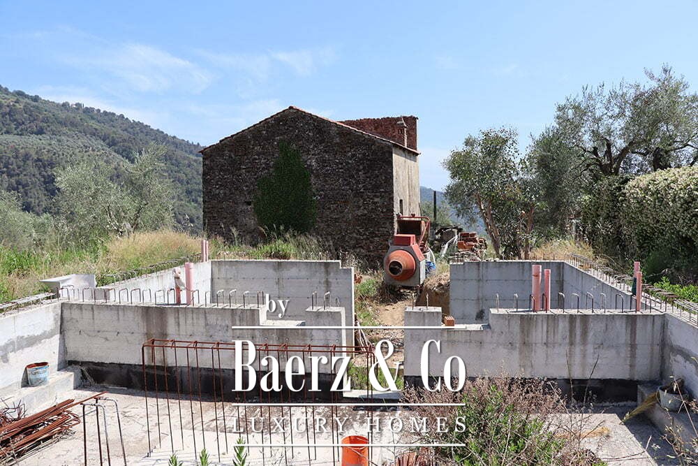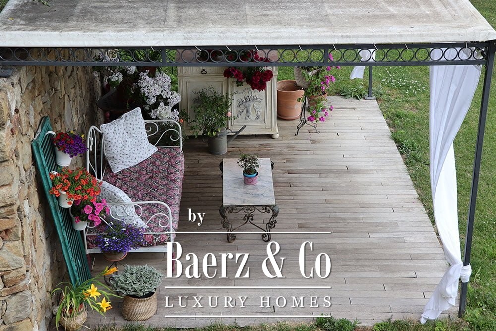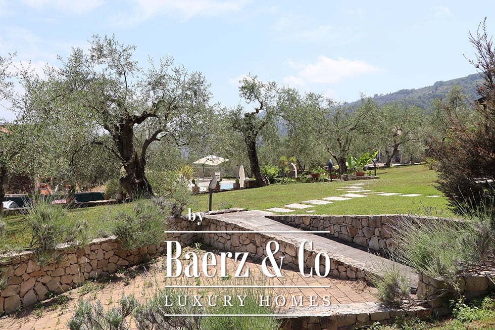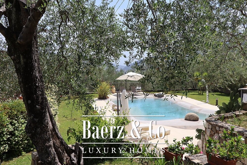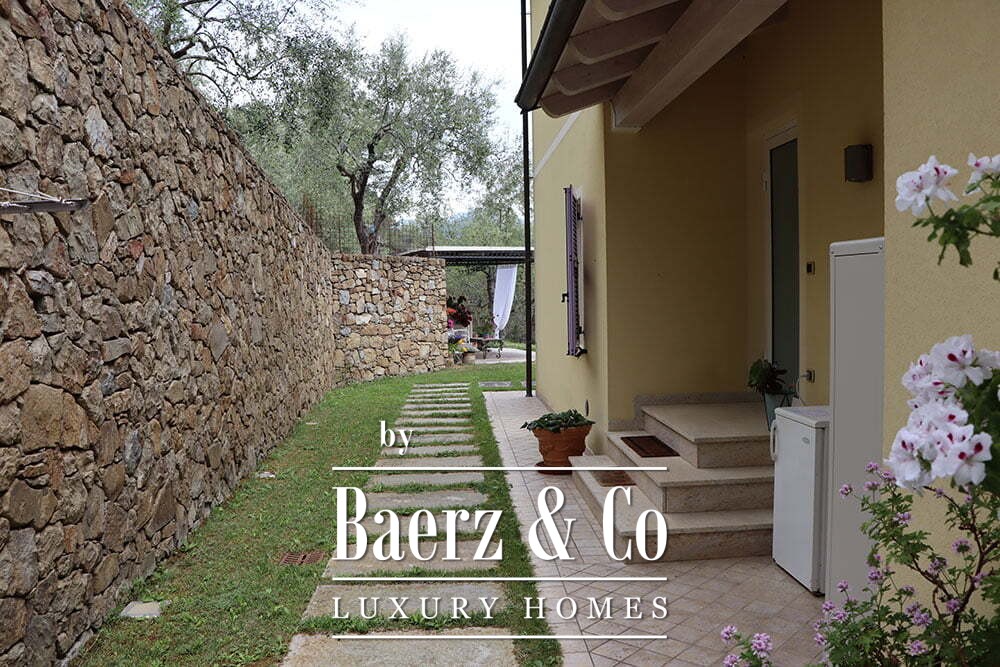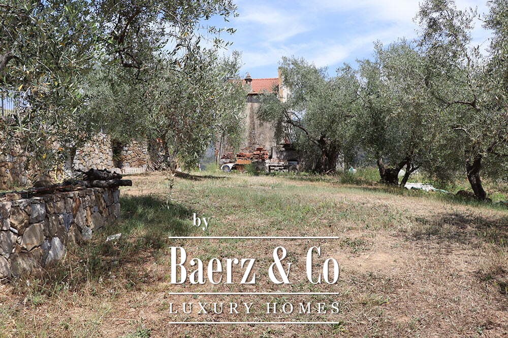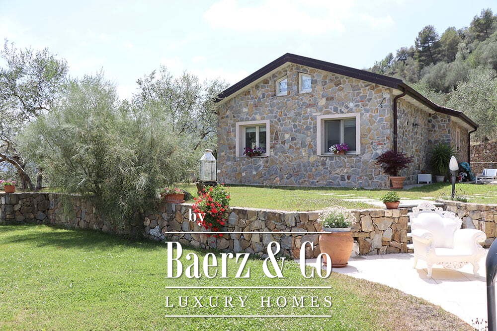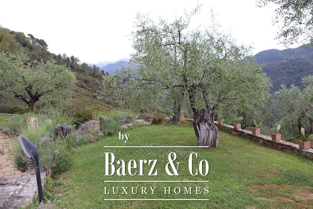 Both main buildings are equipped with solar panels, integrating eco-conscious technology into the tranquil pace of rural life. The expansive 12,000 m² garden features a bio-swimming pool designed to preserve the environment, crafted from quartz sand and resin. This country house for sale in Dolceacqua harmonizes hospitality and seclusion, offering a rare Ligurian retreat for those seeking authenticity and quiet grandeur.
