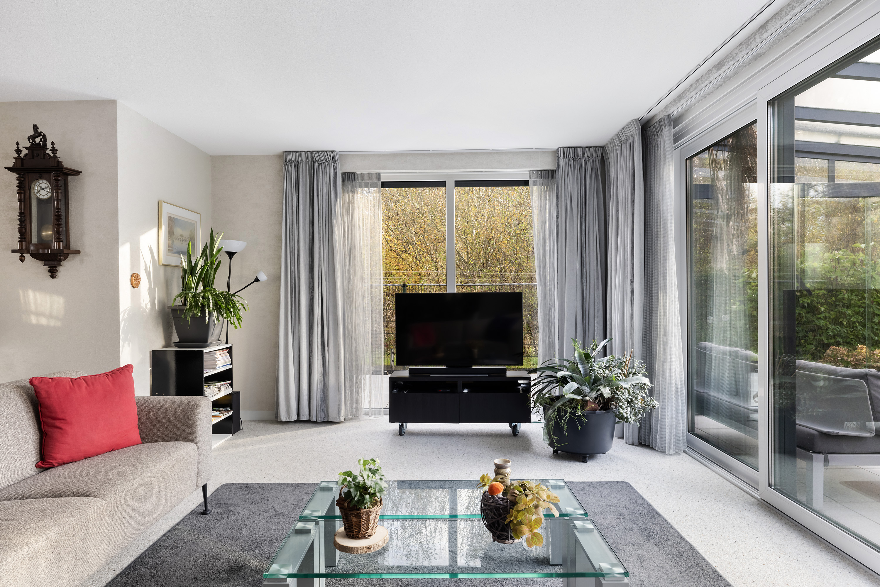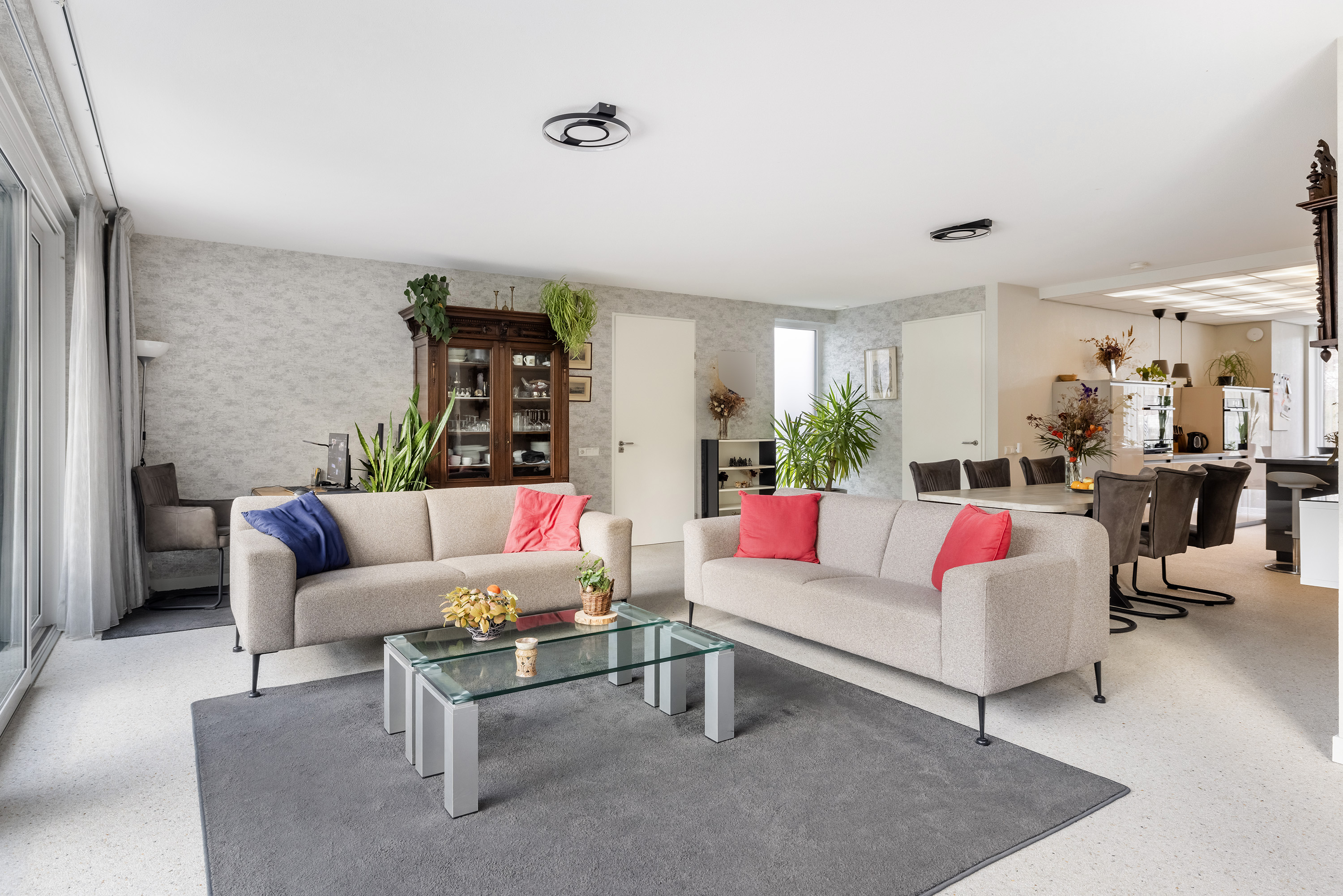 A wonderfully spacious and light-filled living room thanks to the large windows, with green views. The rear of the living room opens to a large conservatory via two sliding doors. The garage is also accessible from the living room. The space features a Carrara Italian marble-gravel floor and wallpapered walls.