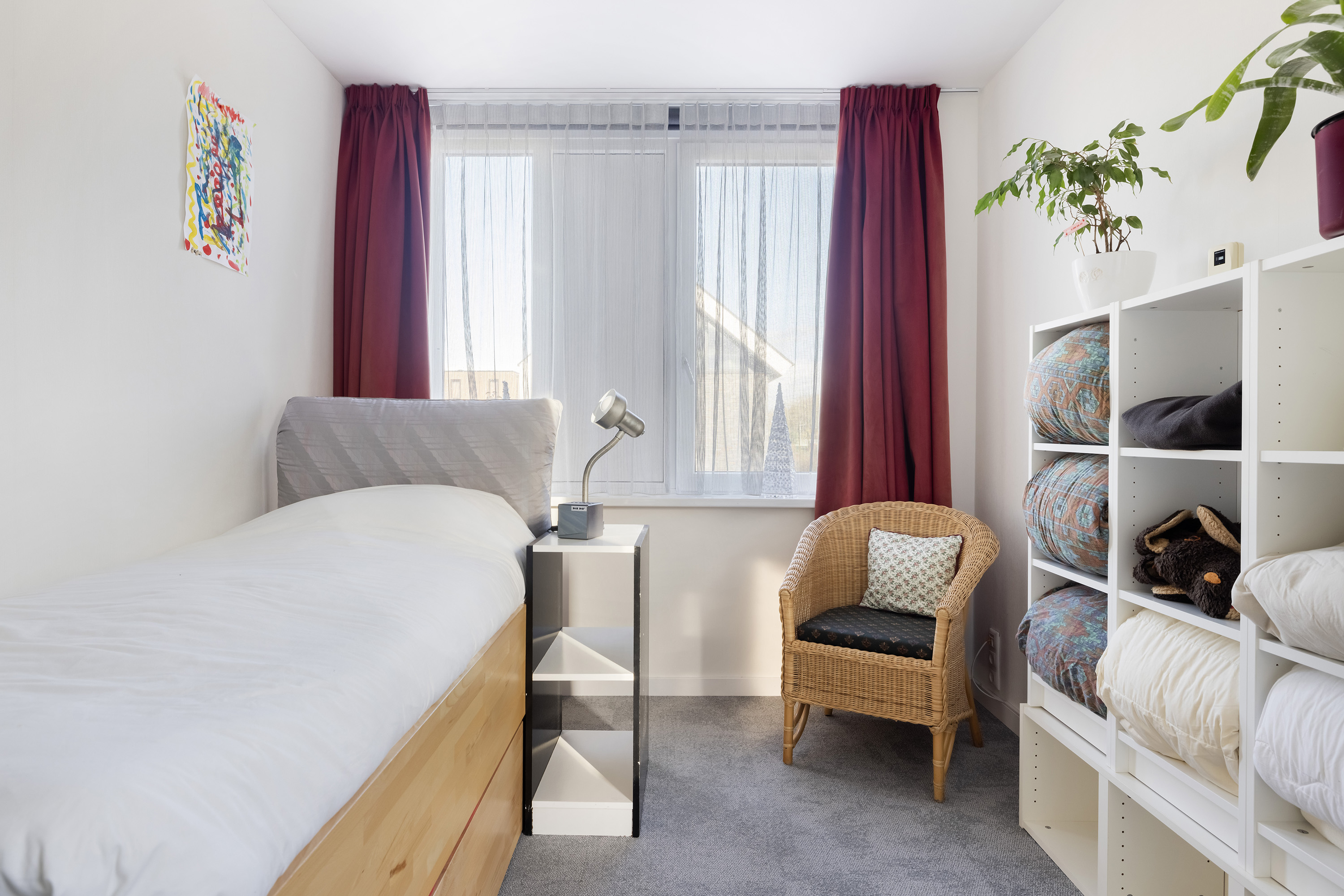 Finished with carpet flooring and wallpaper. Offers access to the garden via a single door.