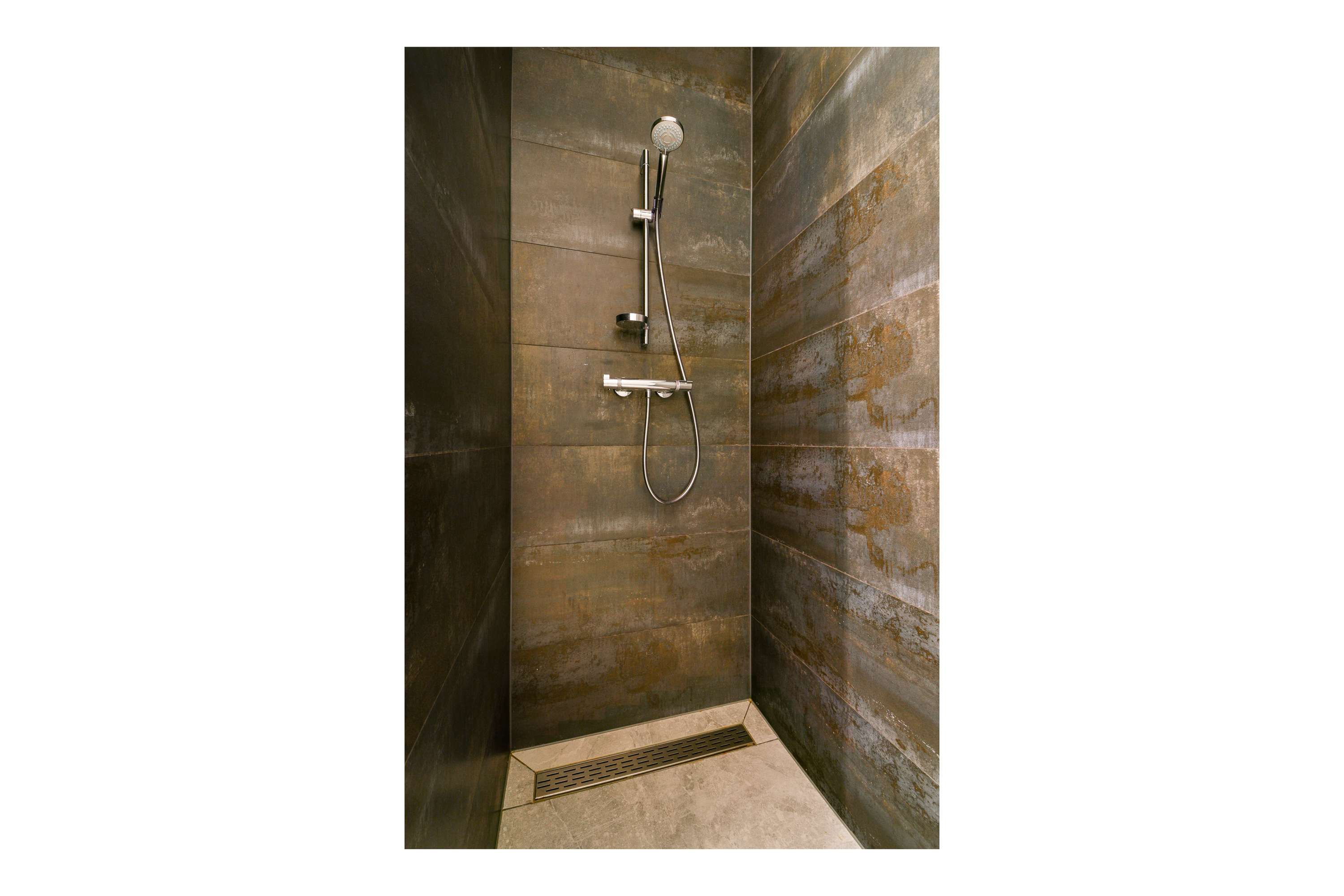 Bathroom 2: Walk-in shower with rain shower, double sink, wall-mounted toilet, infrared heating panel.