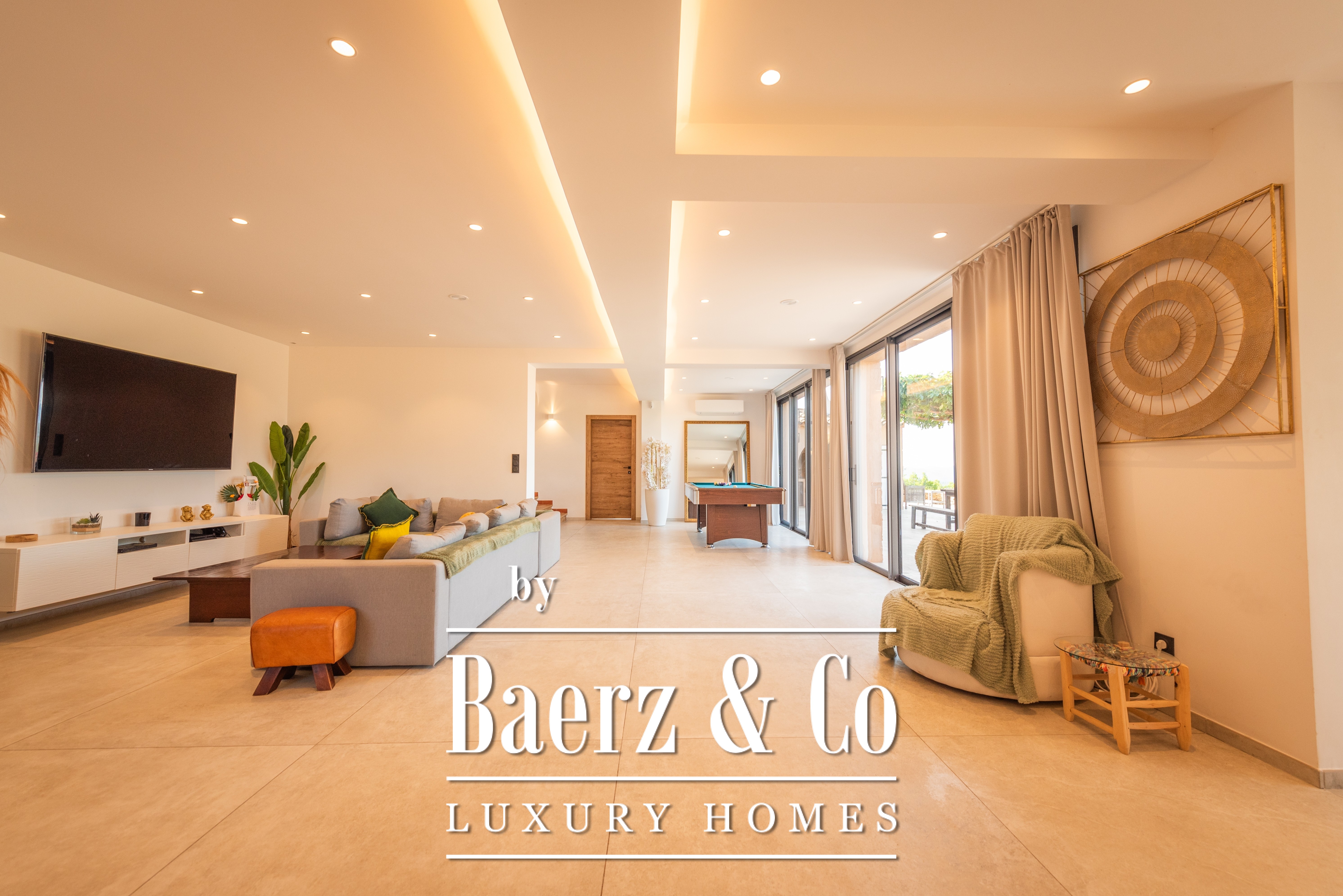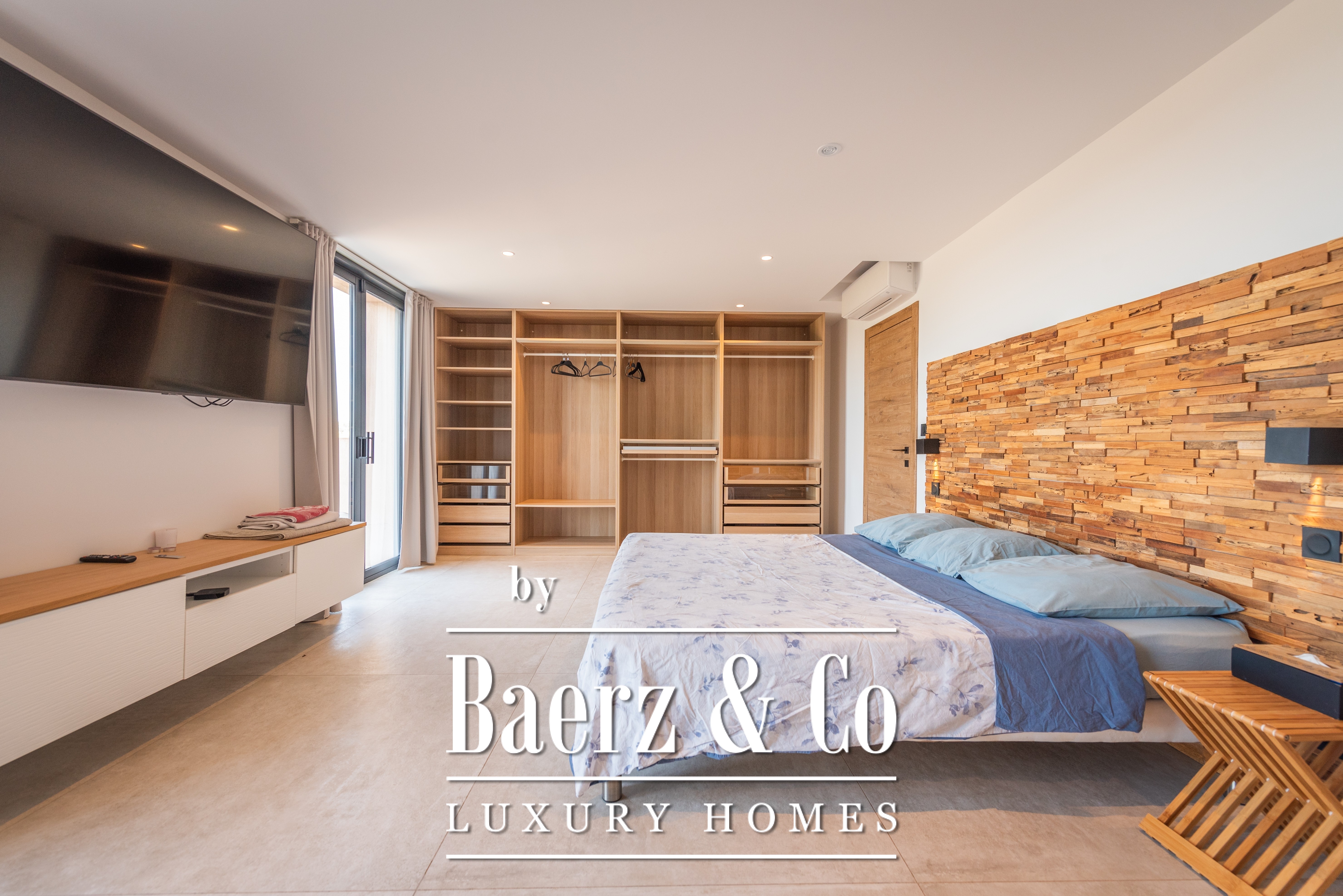 The main residence welcomes with a 100 m² open-plan living area, its proportions balanced and inviting. On the ground floor, a master suite provides direct comfort and privacy, while two additional bedrooms upstairs offer accommodation, including one with a private terrace that opens to the panoramic views. An independent studio, accessed separately, discreetly enhances flexibility.