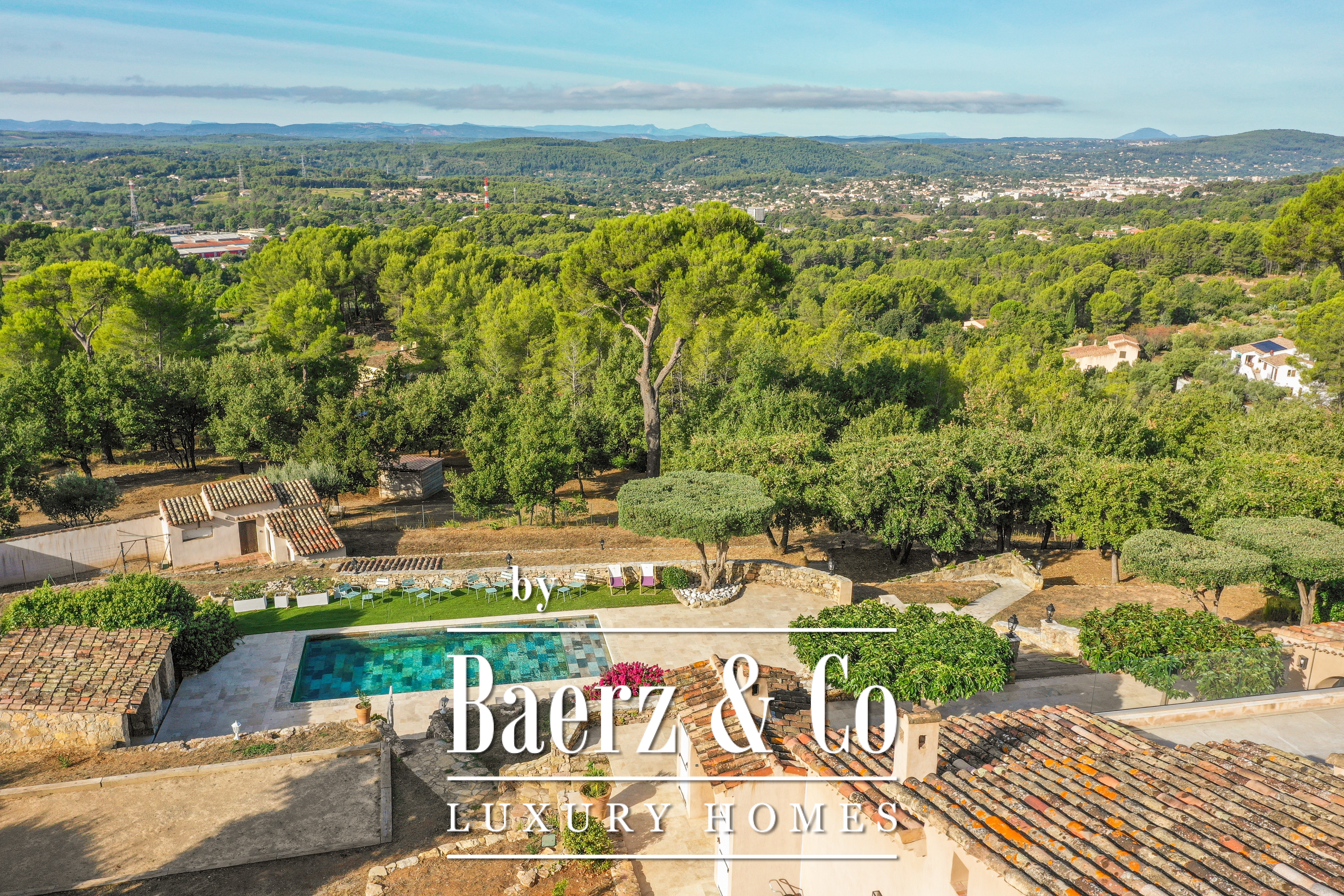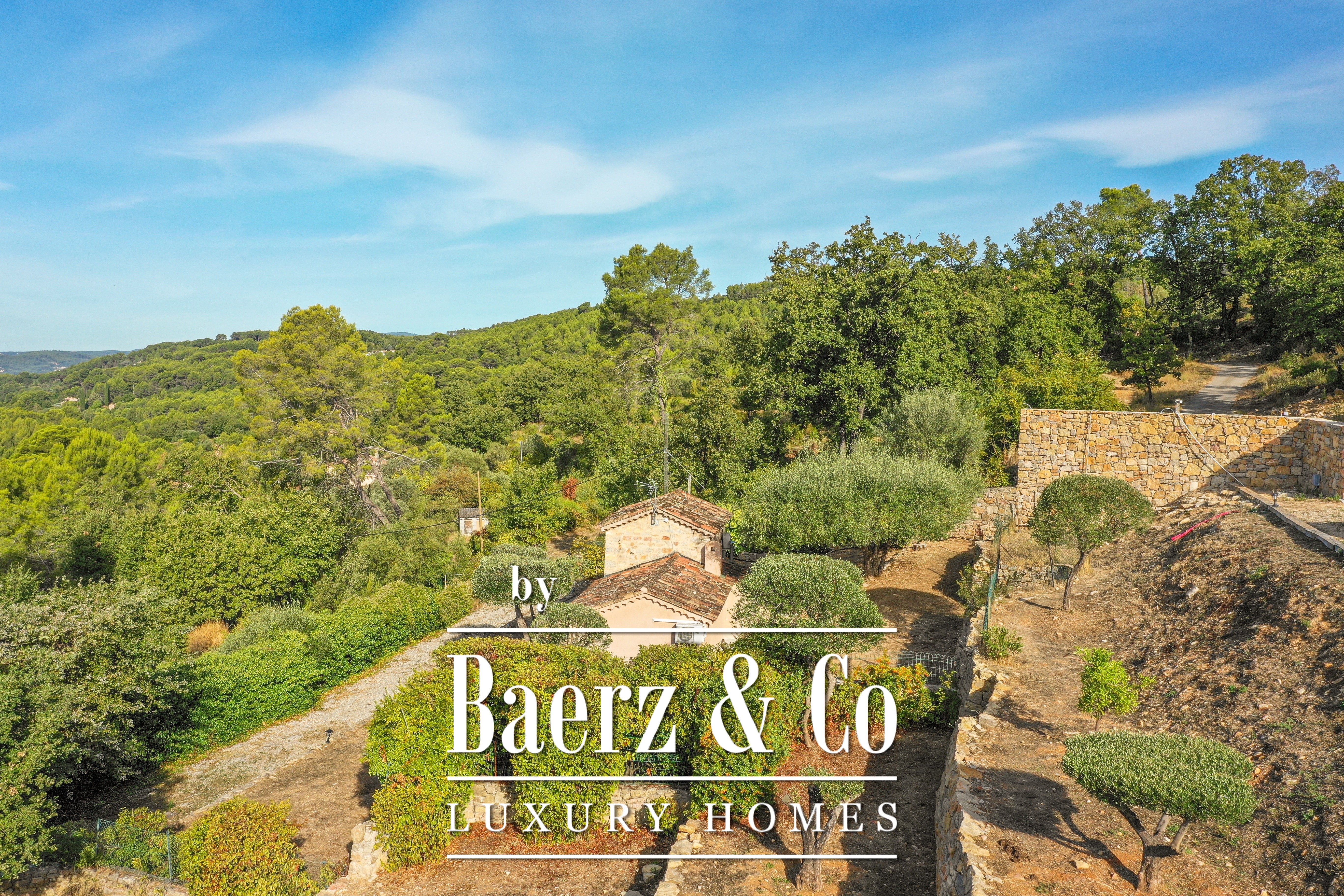 Villa Draguignan with panoramic mountain views rests above the town in a serene hillside setting, where nature and privacy define the experience. The estate unfolds across nearly 12,000 m² of quiet land, with sweeping 180° vistas framing the horizon. The villa’s architecture is measured and generous, offering a 222 m² main residence infused with natural light, and an independent 41 m² guesthouse situated below with its own private access.