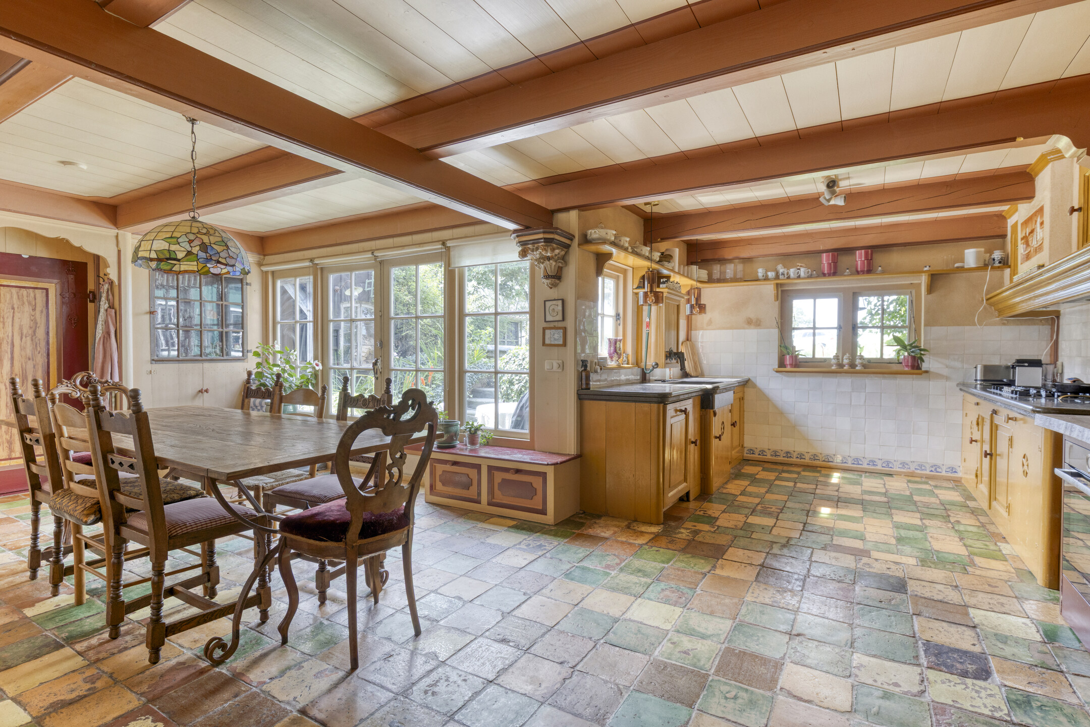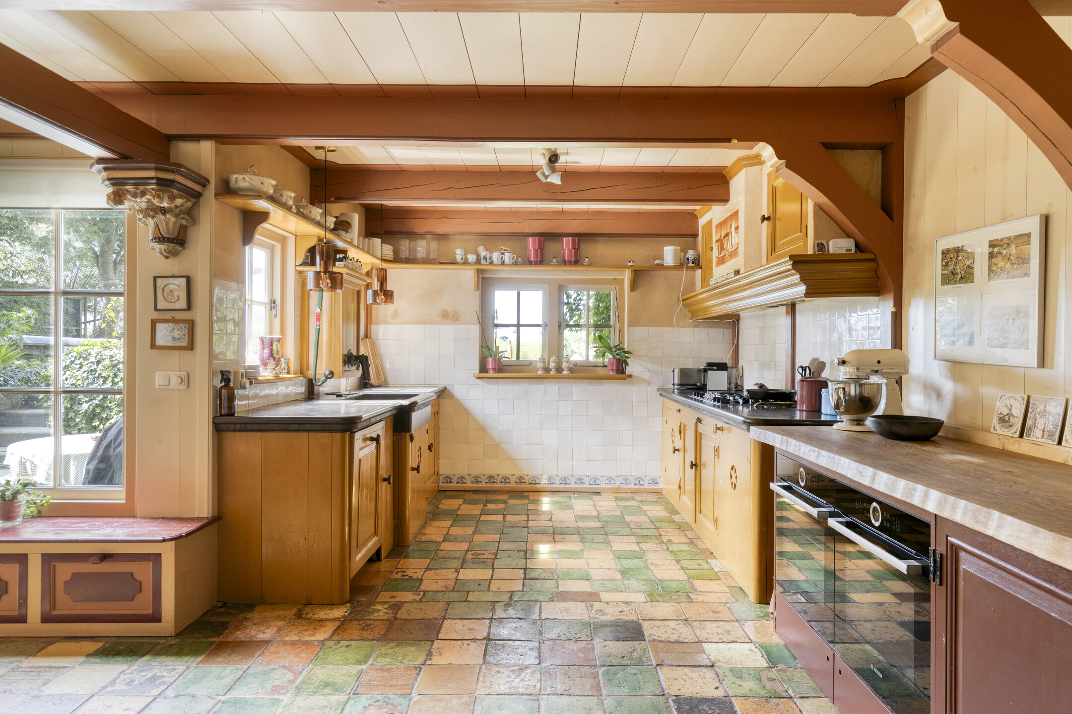 What truly sets this property apart is the experience. From your own garden you step onto your private jetty and head straight out onto the water. Inside, the spacious living room features wooden floors, exposed beams and a characterful wood-burning stove. The generous open-plan kitchen forms the heart of the home: a place for cooking, dining and spending time together, with French doors opening onto the sunny waterfront garden.