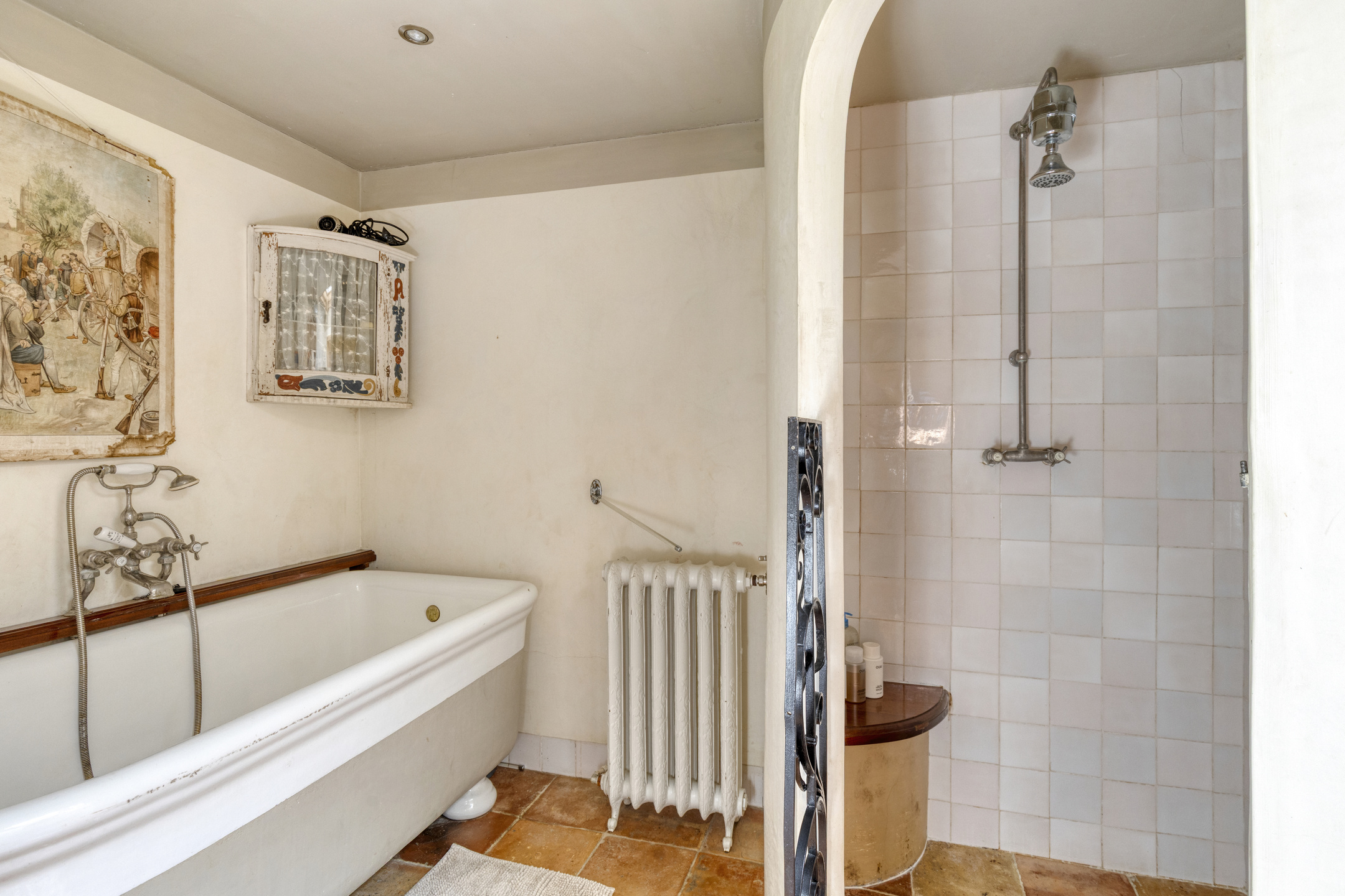 Also on the ground floor is a bedroom with direct access to the garden, suitable for single-level living. The adjoining bathroom features underfloor heating, a bathtub, walk-in shower, toilet, bidet and washbasin. From the bedroom you can access the internal garage, which houses the washing machine and dryer connections and the new central heating system (2024). The private driveway includes an EV charging point, and the hybrid heat pump is located in the adjacent alley.