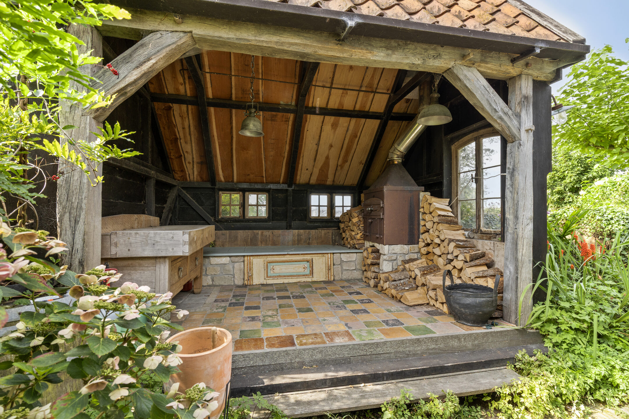 The waterfront garden is without doubt one of the highlights of this home. Located directly on open water, it offers complete privacy and uninterrupted views over the polder landscape. A covered outdoor seating area with a wood-burning stove – featuring original oven doors from the former bakery once located on this site – adds a unique and characterful touch.