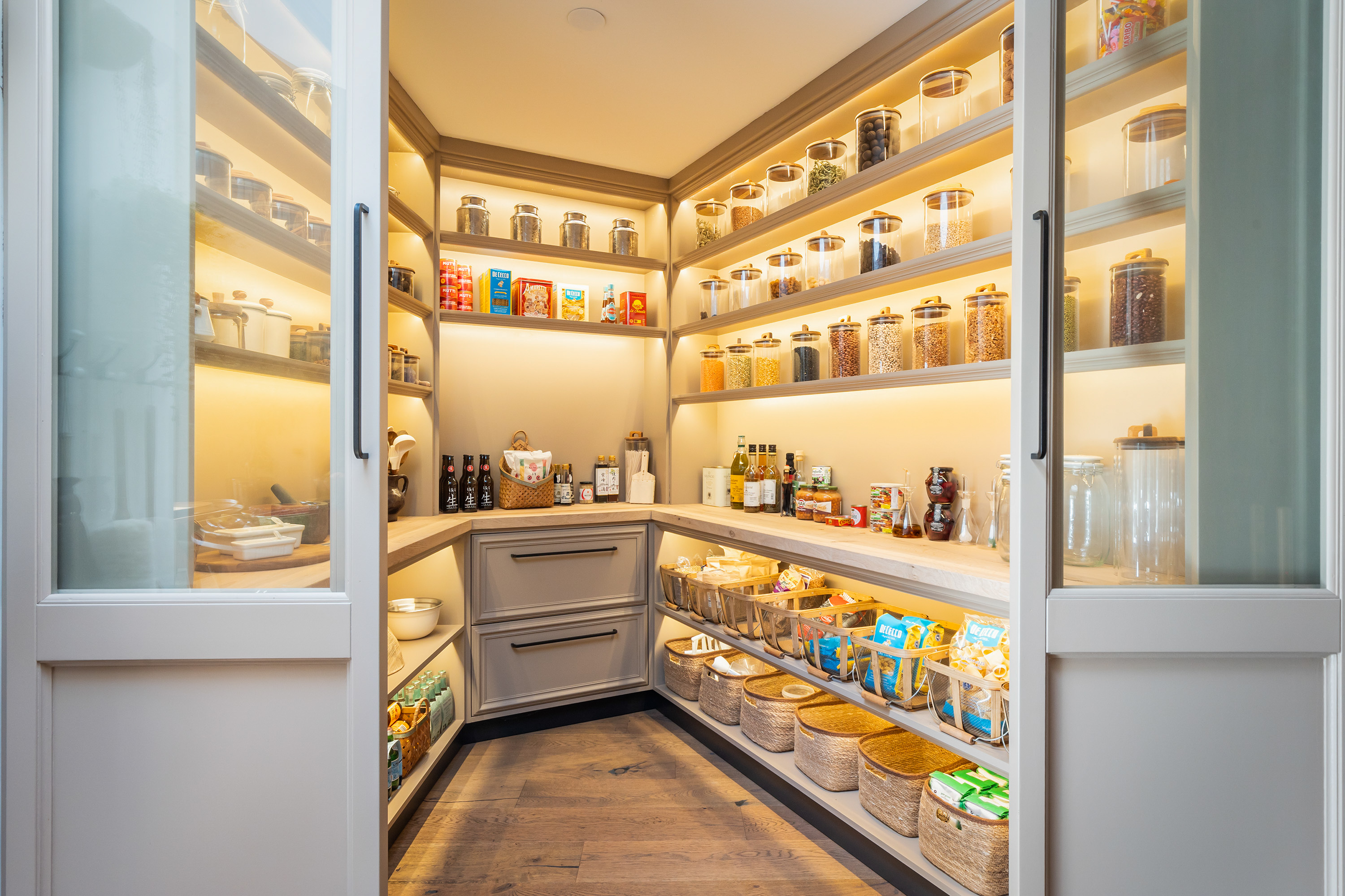 Additional rooms include a utility room, guest WC and a generous bedroom with walk-in wardrobe and luxury hotel-style bathroom. This bathroom features a double walk-in shower, granite basins, bespoke cabinetry and softly illuminated arched recesses that lend the space a warm, exclusive ambience.
