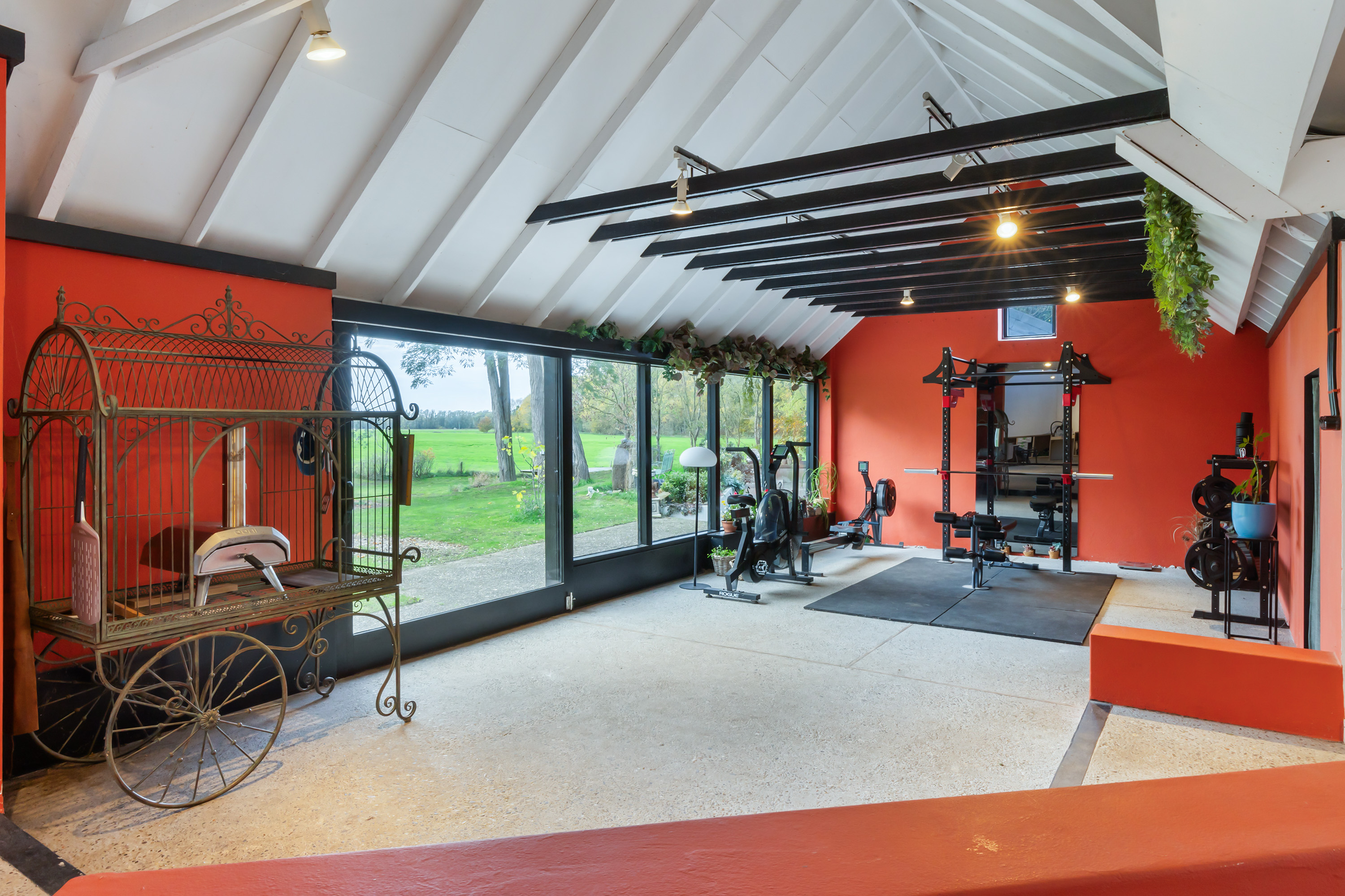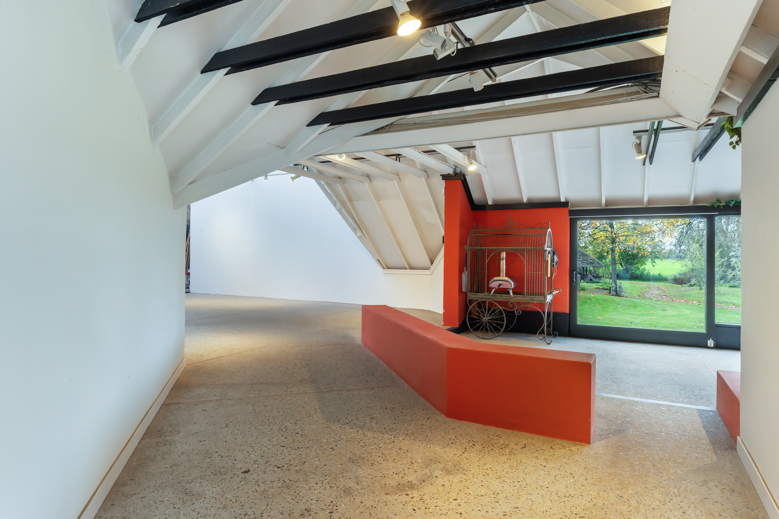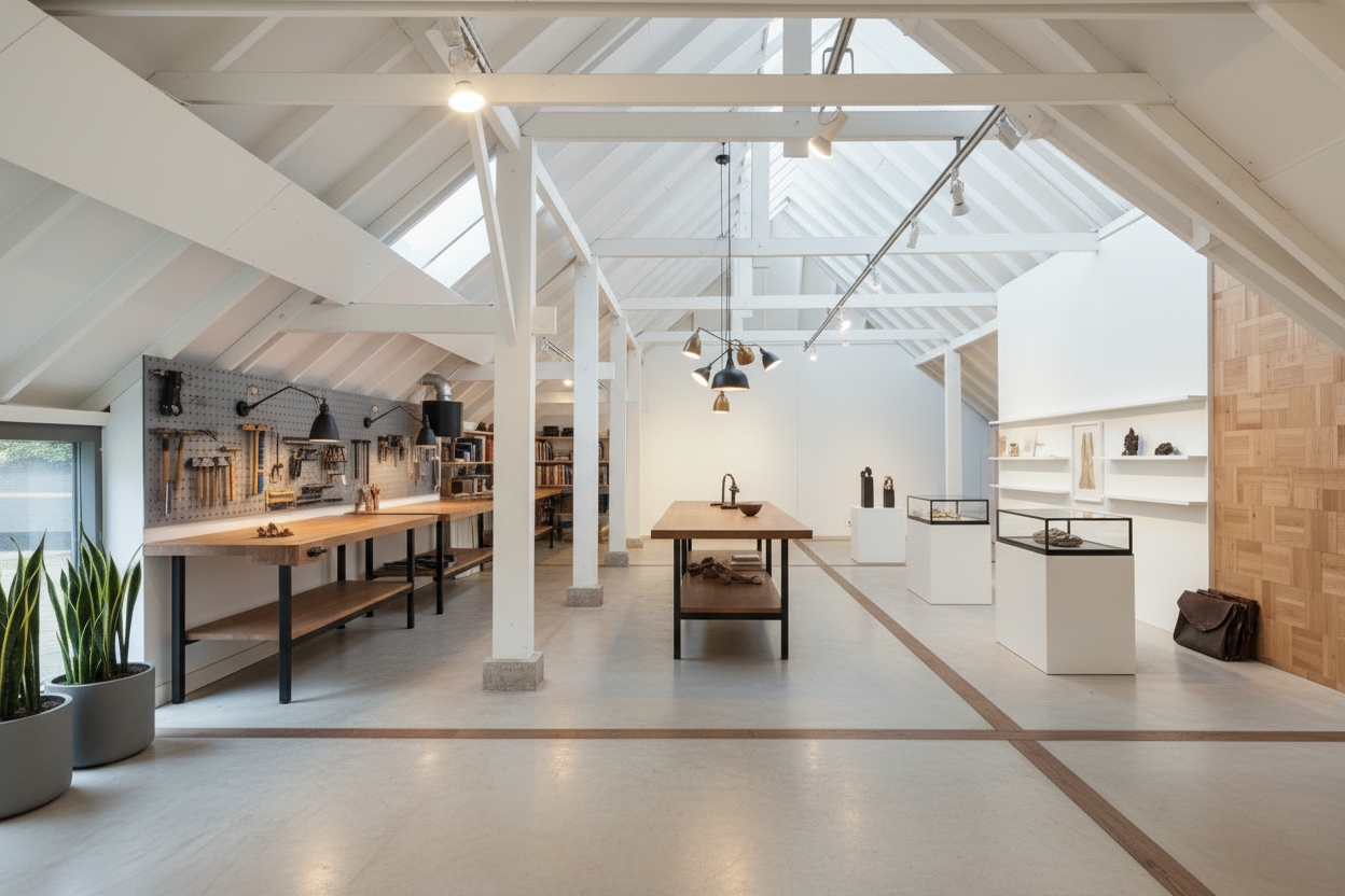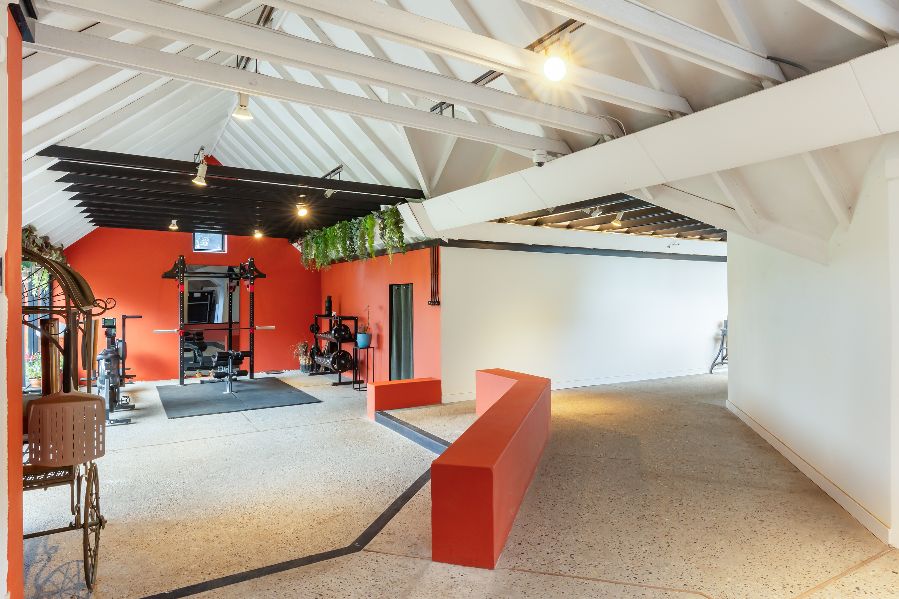 The adjoining 445 m² commercial building offers countless possibilities: an atelier, gallery, showroom, office or workshop. Its soaring ridge height with black timber trusses, generous proportions and large windows create a striking atmosphere of craftsmanship and character. The building includes its own entrance, office, pantry and WC. The mezzanine floor offers further space for guest accommodation, an atelier or workspace.