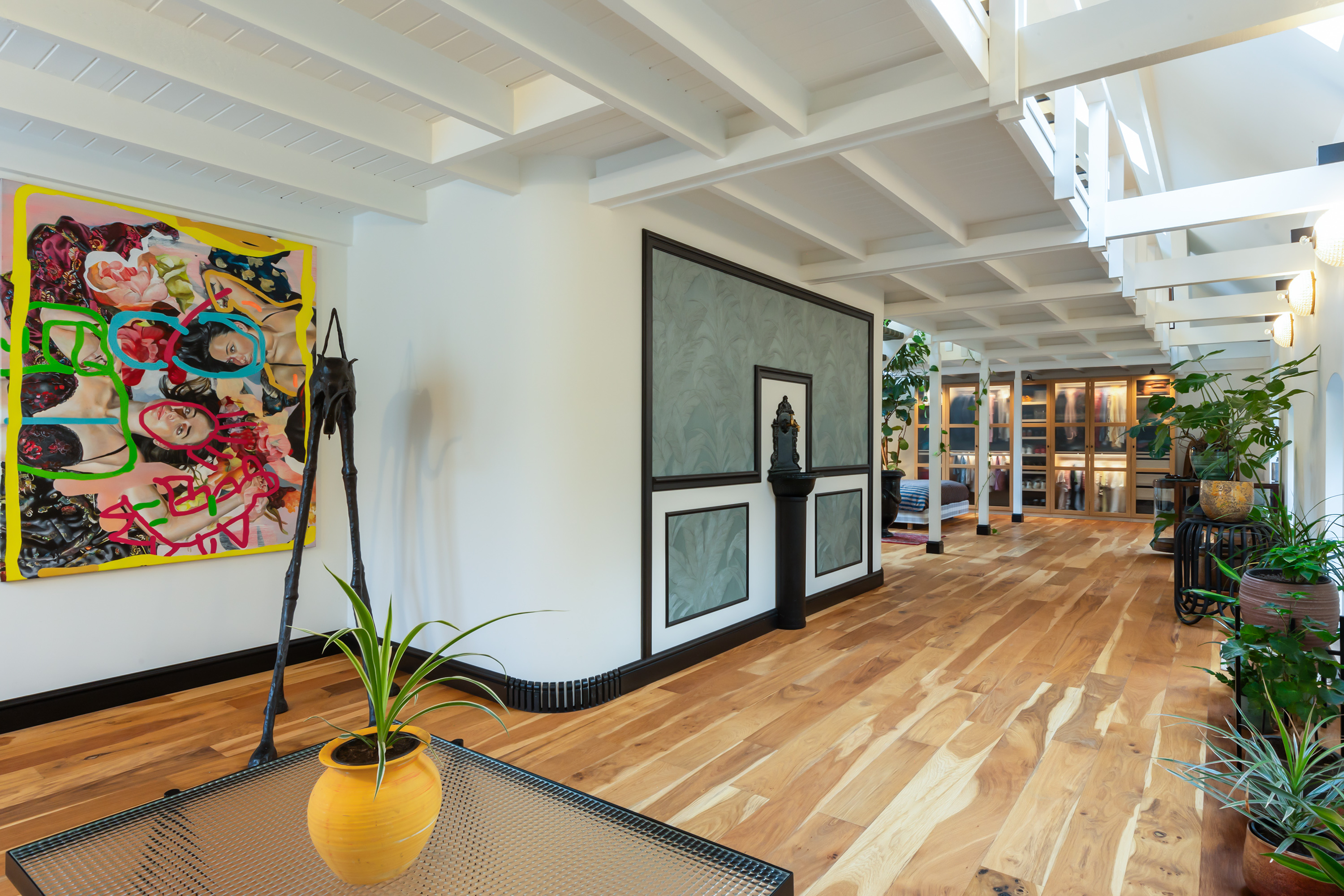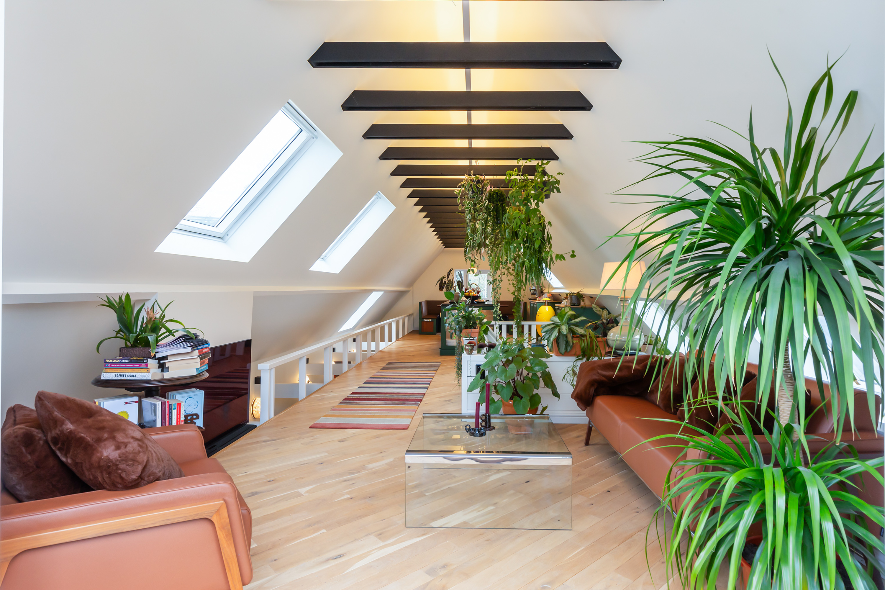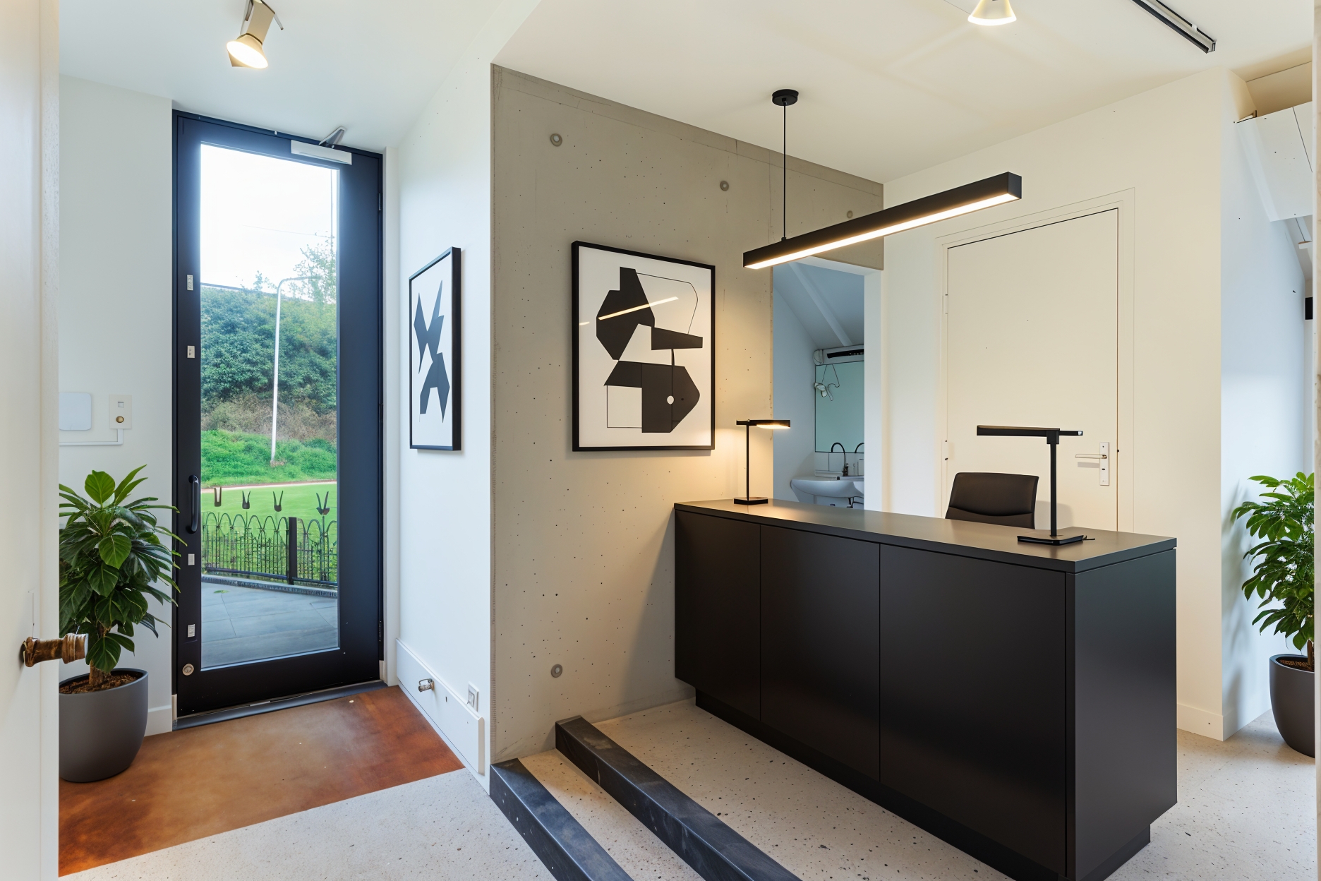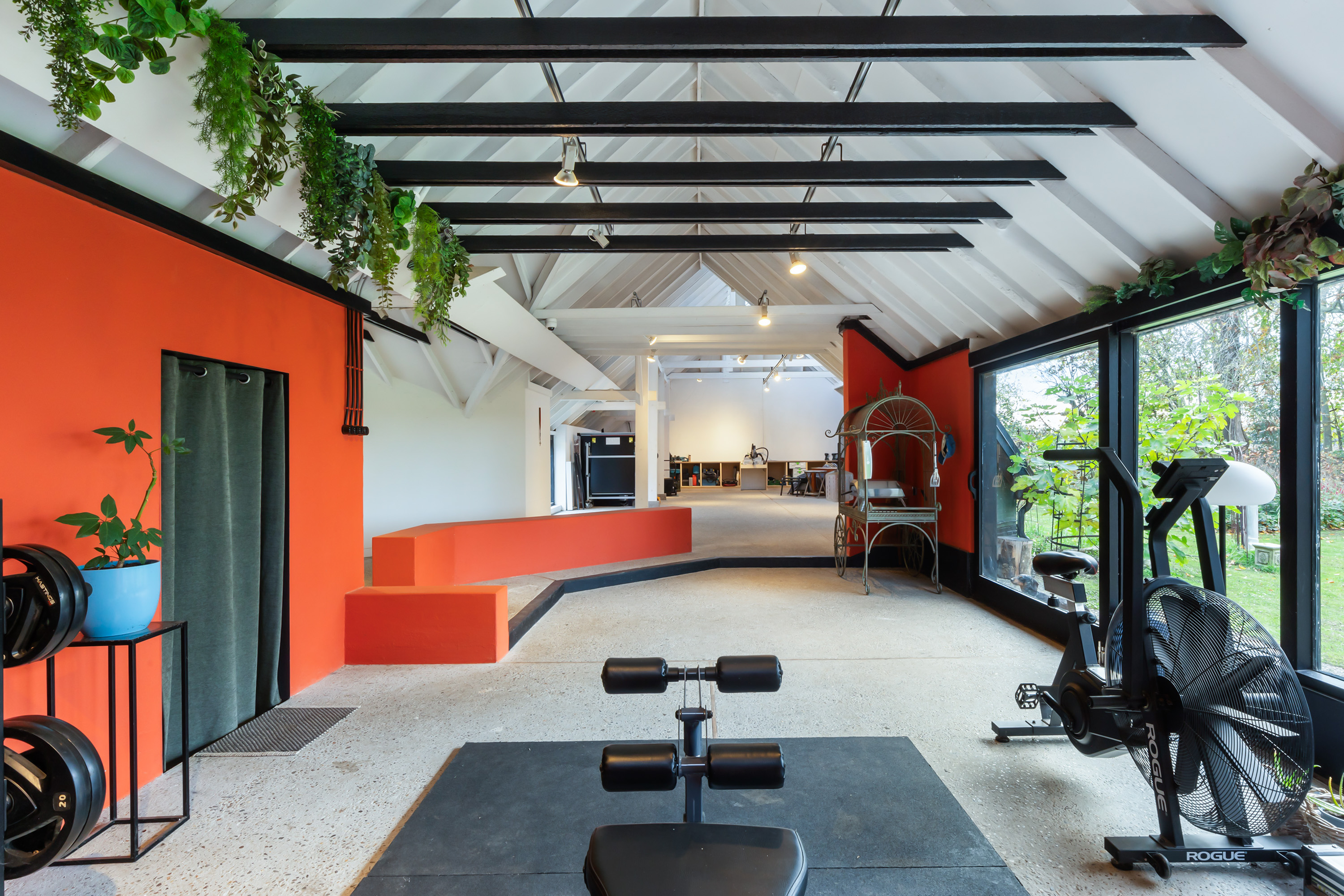 The adjoining 445 m² commercial building offers countless possibilities: an atelier, gallery, showroom, office or workshop. Its soaring ridge height with black timber trusses, generous proportions and large windows create a striking atmosphere of craftsmanship and character. The building includes its own entrance, office, pantry and WC. The mezzanine floor offers further space for guest accommodation, an atelier or workspace.