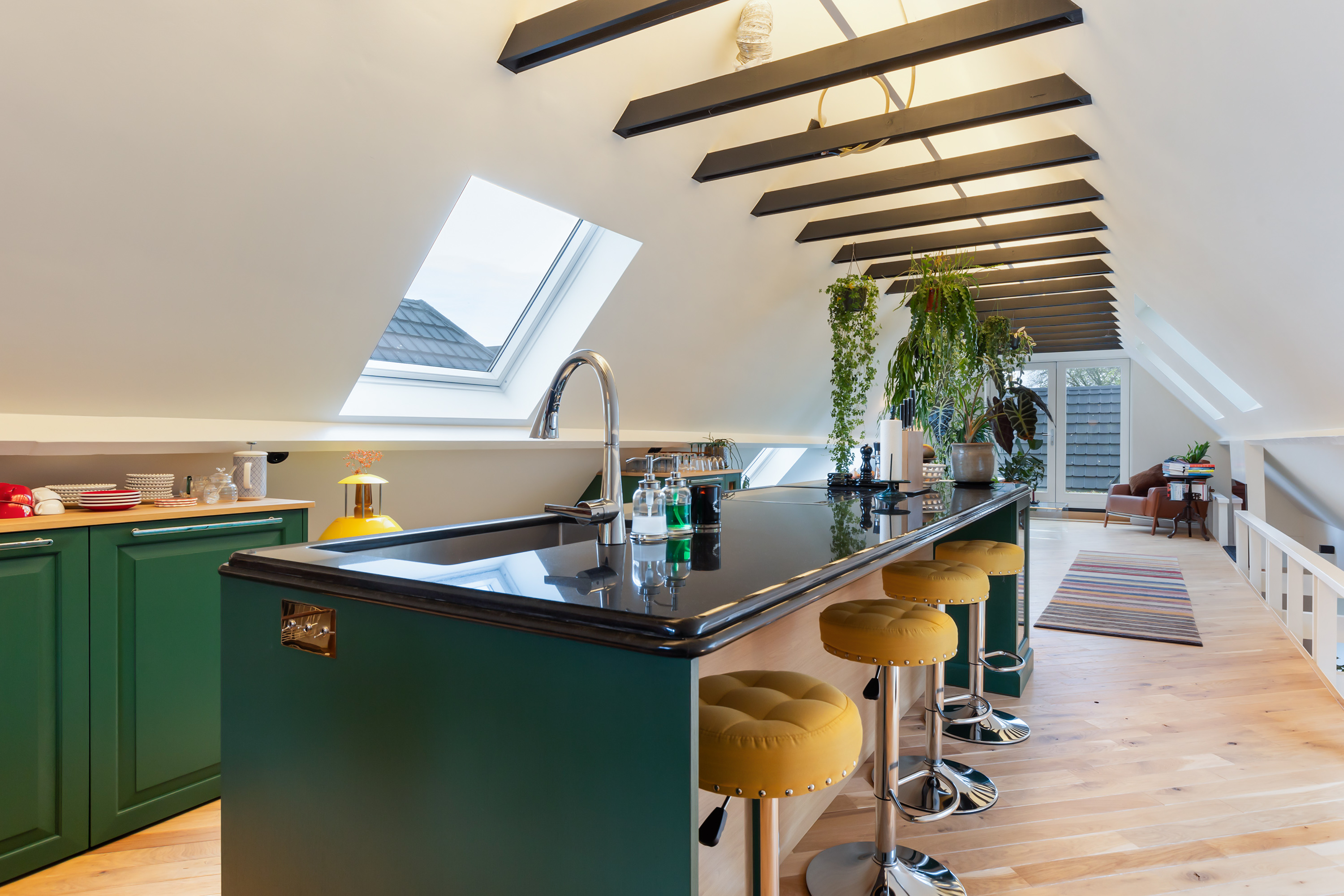 On the mezzanine level is an atmospheric kitchen-diner featuring oak cabinetry in a woodland green tone, granite worksurfaces and Miele appliances. At the front is a bright dining area, while the rear offers a cosy TV room with French doors opening onto the spacious roof terrace. Here, you can enjoy panoramic views across the garden and fields – an ideal spot to unwind or dine in the evening sun.