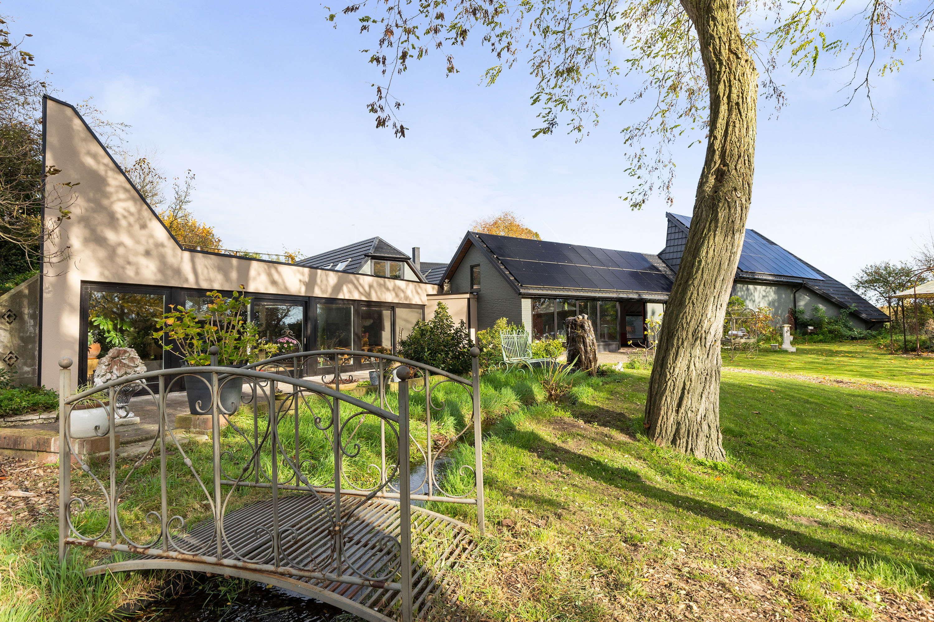 The garden surrounding the property has been landscaped with great care for atmosphere and tranquillity. Facing south, the rear garden blends seamlessly into the surrounding fields, while mature trees and hedges provide privacy. A romantic gazebo, a gently flowing stream with footbridge, and a floating deck with panoramic views together create a place where nature and design meet in harmony. A carport, timber outbuilding and fully enclosed grounds offer comfort and security for both residents and animals.