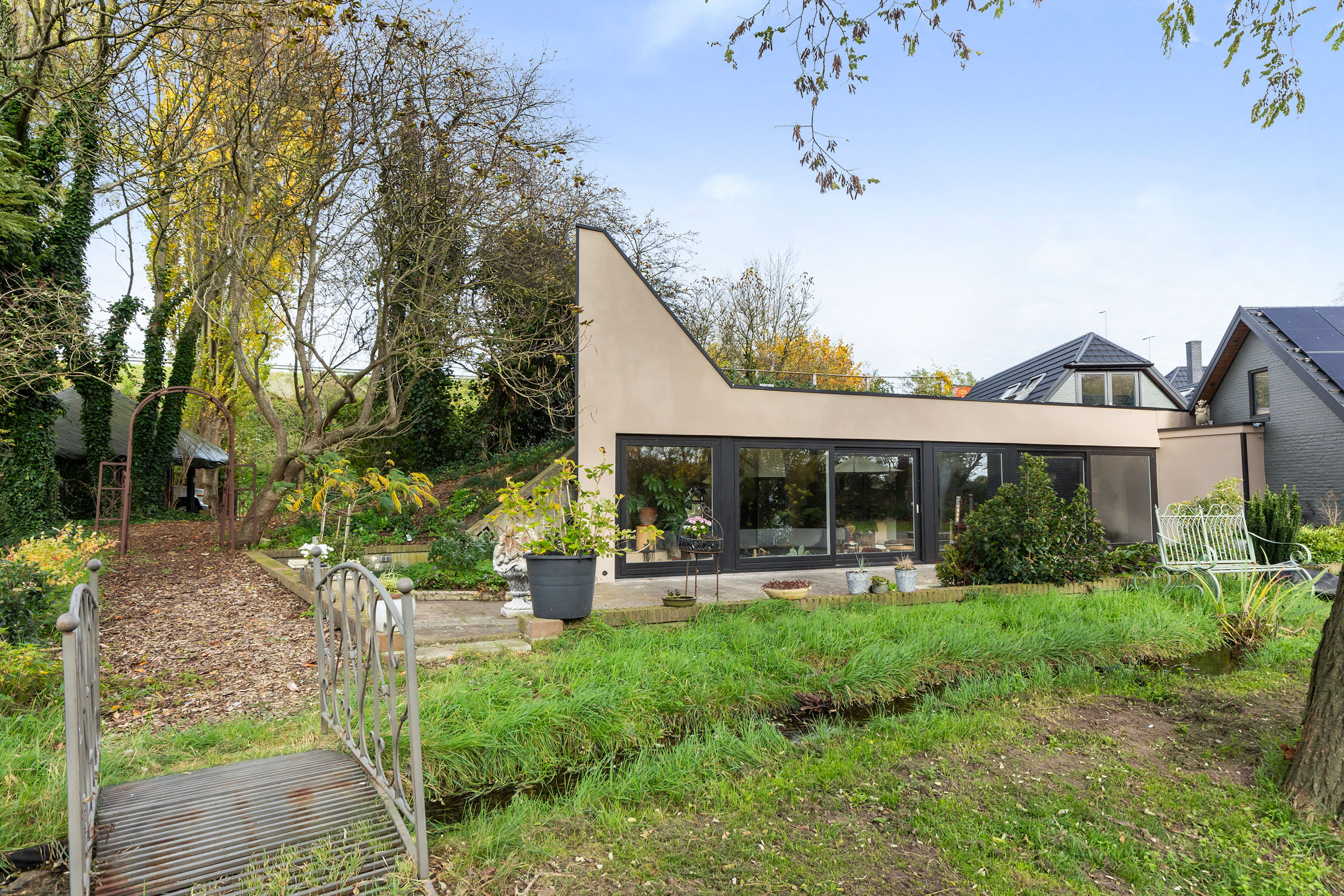The property is located on a quiet lane with only local traffic. Thanks to the natural height difference with the A1 and sound-reducing asphalt, the garden remains remarkably peaceful. The village of Gorssel is a five-minute drive away, while Deventer and Zutphen can be reached within fifteen minutes. The Randstad is accessible in under an hour, and public transport connections are excellent.