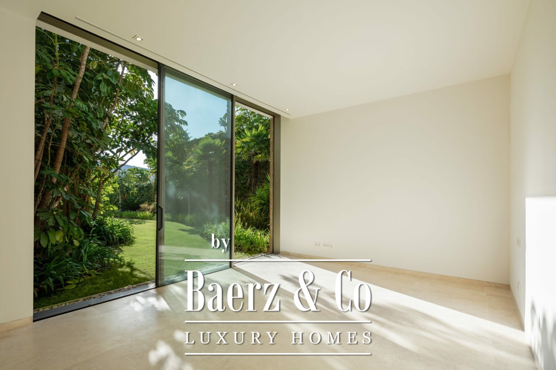 This exquisite villa, nestled beside the golf course, presents an extraordinary opportunity for residents to immerse themselves in the lavish Mediterranean lifestyle. Poised within the famous golf resort, this residence affords sweeping vistas of the lush fairways and the Mediterranean Sea. The architectural brilliance shines through, lending the home a modern allure that epitomises luxury. Set upon an expansive plot, the villa welcomes guests with a captivating entrance adorned with a picturesque lake and meticulously landscaped gardens. Spanning two levels, the four bedrooms are located on the upper floor, while an additional fifth bedroom is conveniently located on the ground level. Inside, the interiors exude elegance with their soft neutral tones and tasteful wooden accents, creating