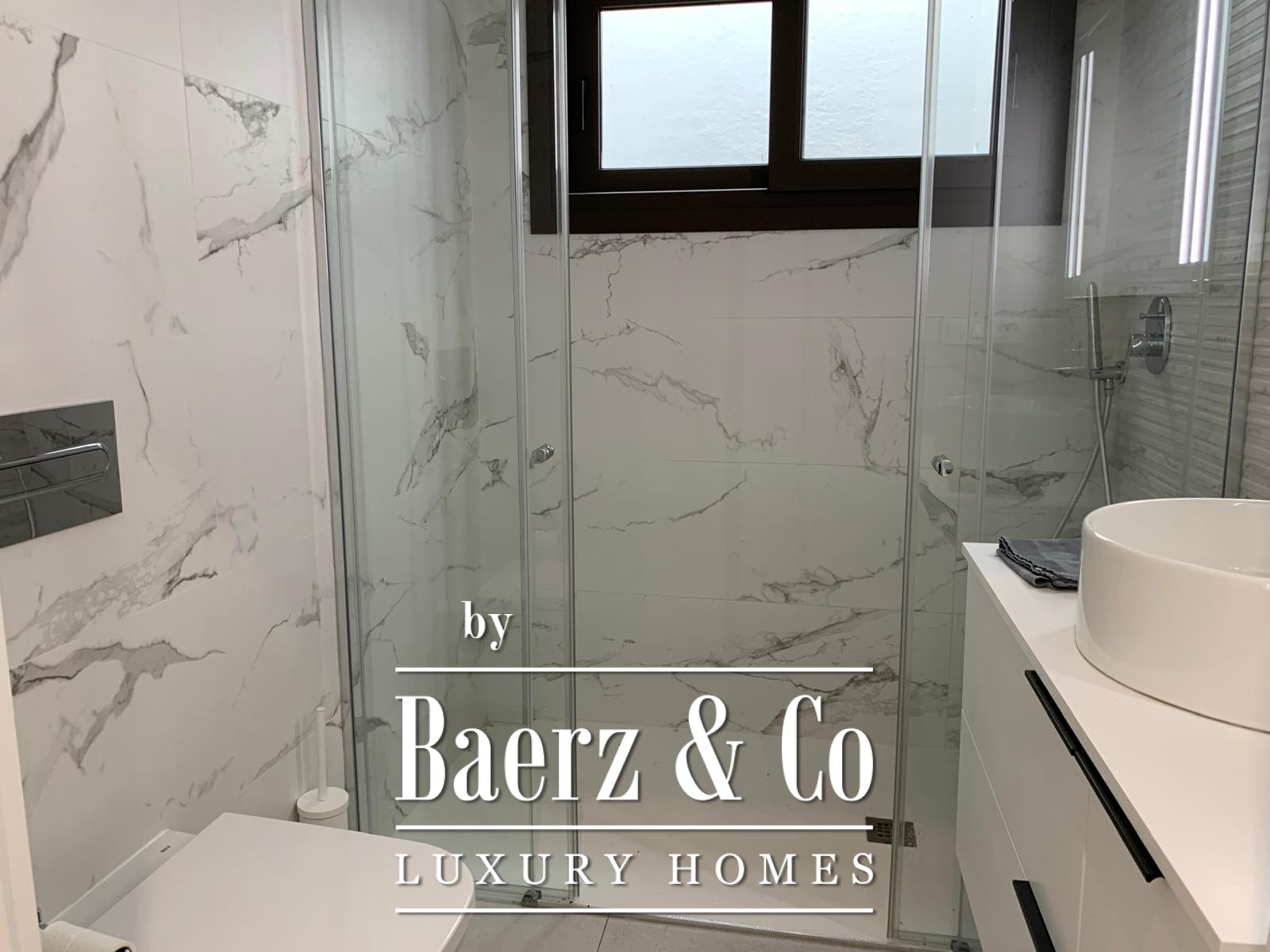 Descending to the semi-basement, a spacious lounge encourages use as a cinema room or personal gym, accompanied by laundry facilities, two further bedrooms, and a bathroom with shower. Outside, the landscaped garden envelopes a private pool and terraces for outdoor relaxation while a fenced parking area offers security and convenience. Two solariums, each with independent access, reveal broad sea and cove views, one equipped with an outdoor shower. This Finestrat villa balances clean lines, double glazing, and intelligent security within a calm residential setting.