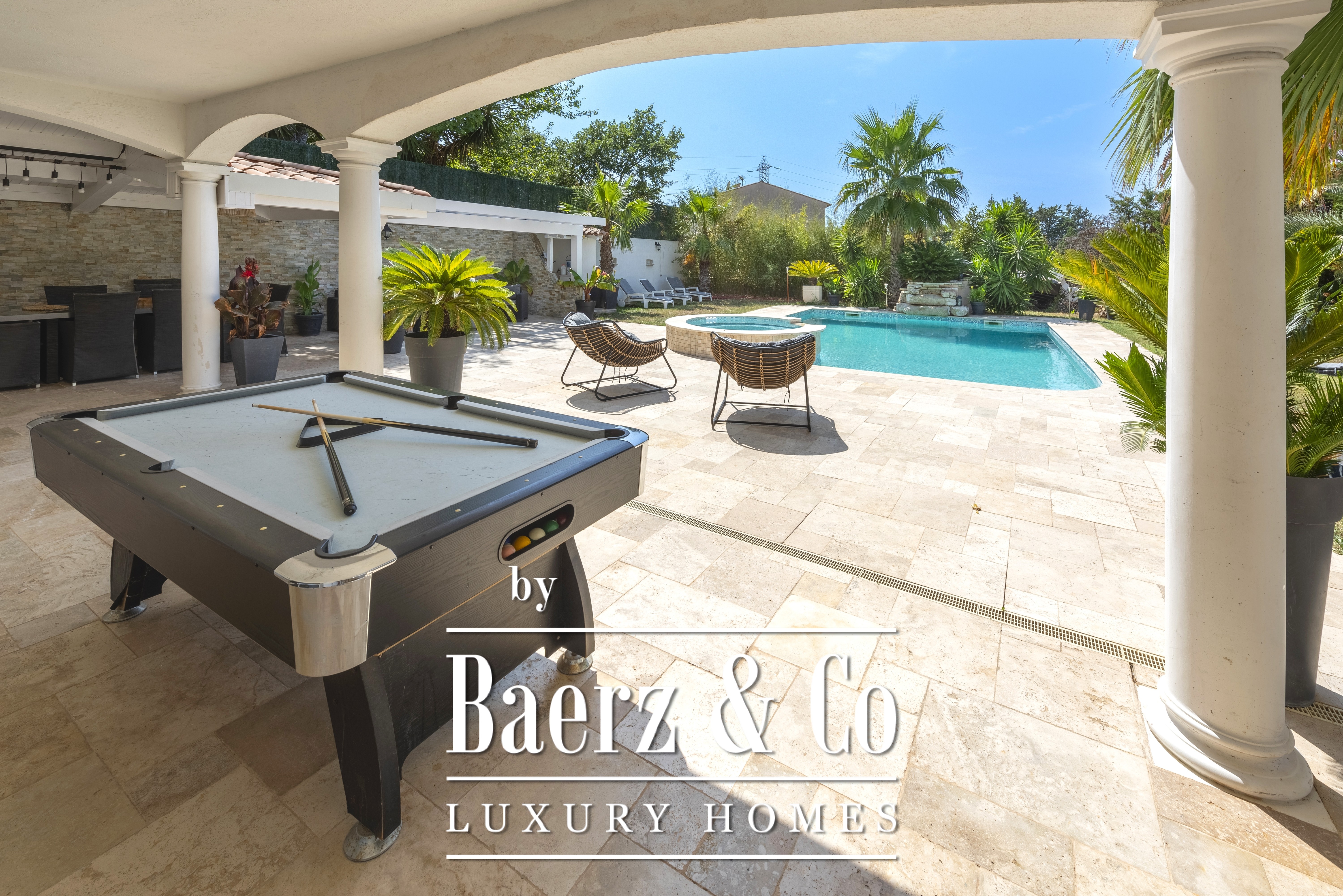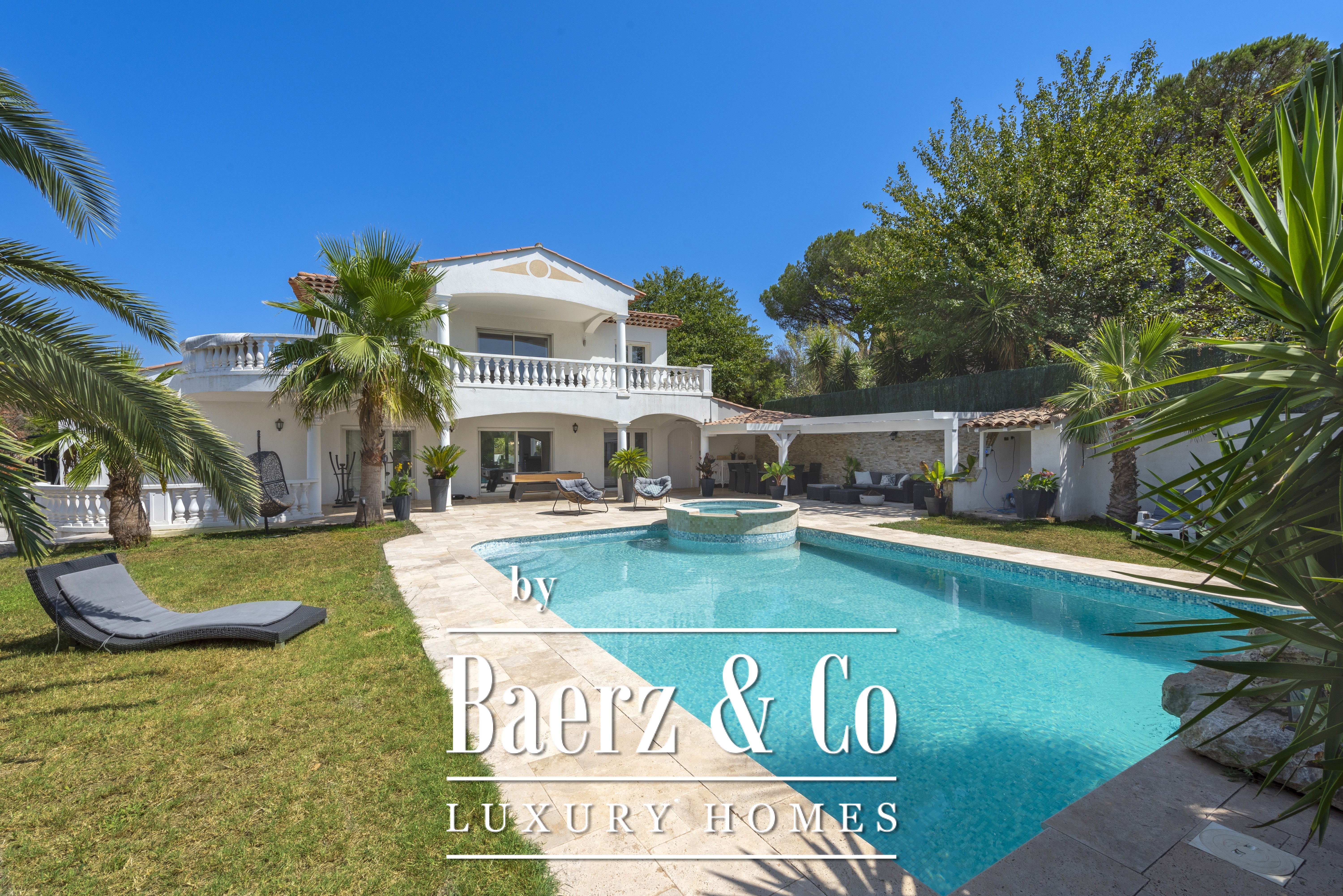 Villa Fréjus presents a 172 m² villa for sale, designed around spacious volumes and refined light, set within a private and secure estate. This property is positioned in a quiet residential environment, while offering immediate access to amenities including shops, schools and main roads. The villa Fréjus opens with a luminous living area and a fully equipped open-plan kitchen, structured for effortless hosting. Facing west, the space extends naturally onto an expansive terrace overlooking the pool and landscaped grounds. The sleeping quarters encompass four bedrooms, a large bathroom, a shower room and a functional laundry room. The setting reveals a 1,082 m² plot, arranged with both open and covered terraces, creating zones for summer dining, relaxation by the pool and a dedicated jacuzzi. Granite tile flooring, underfloor heating, reversible air conditioning and electric roller shutters highlight attention to quality and comfort. The villa offers both a garage and ample indoor and outdoor parking, supporting a lifestyle of privacy and ease. The energy class B rating reflects balanced modern efficiency.