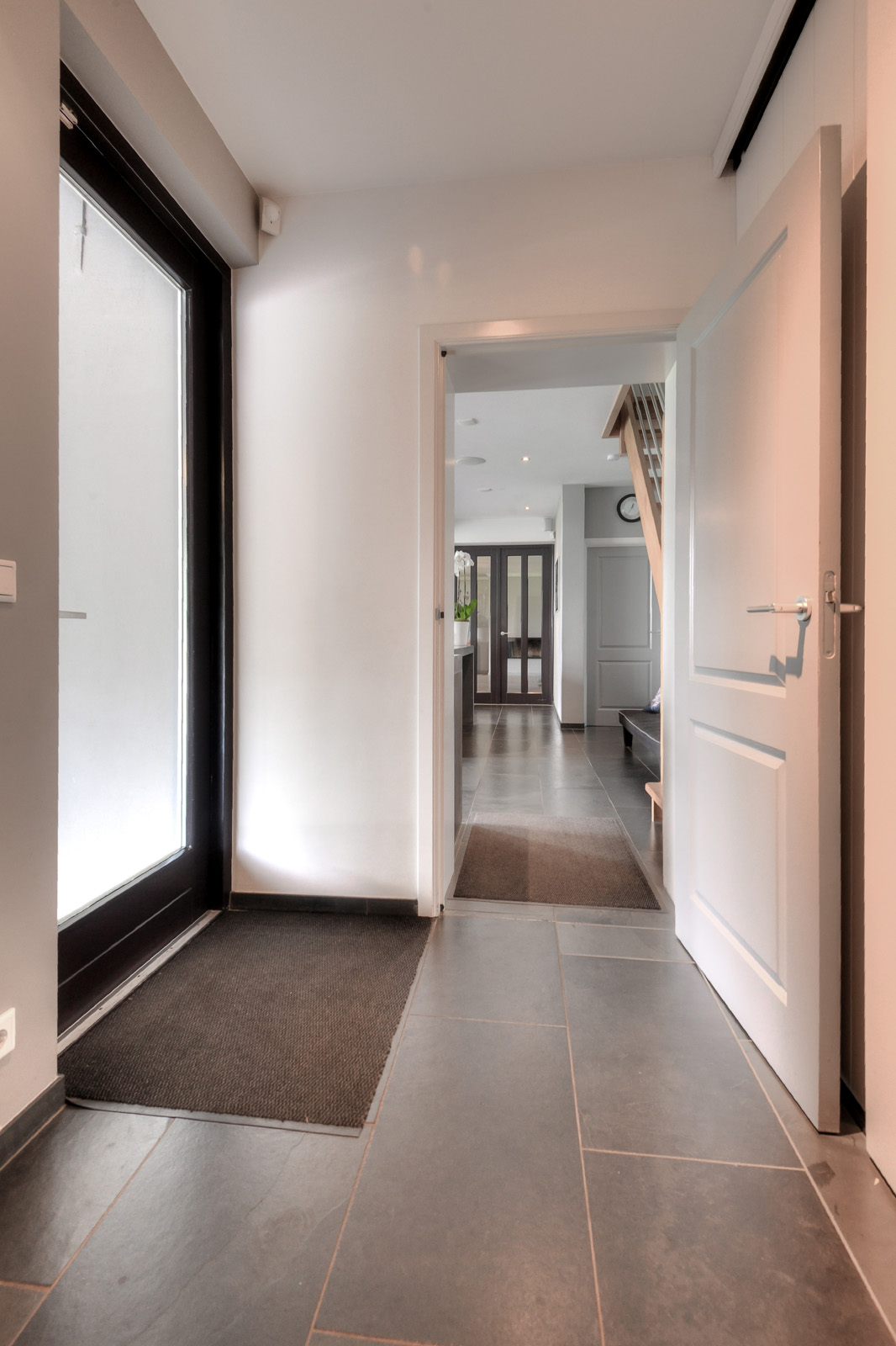 The entrance is located at the rear, next to the carport. From this (front) door you access: