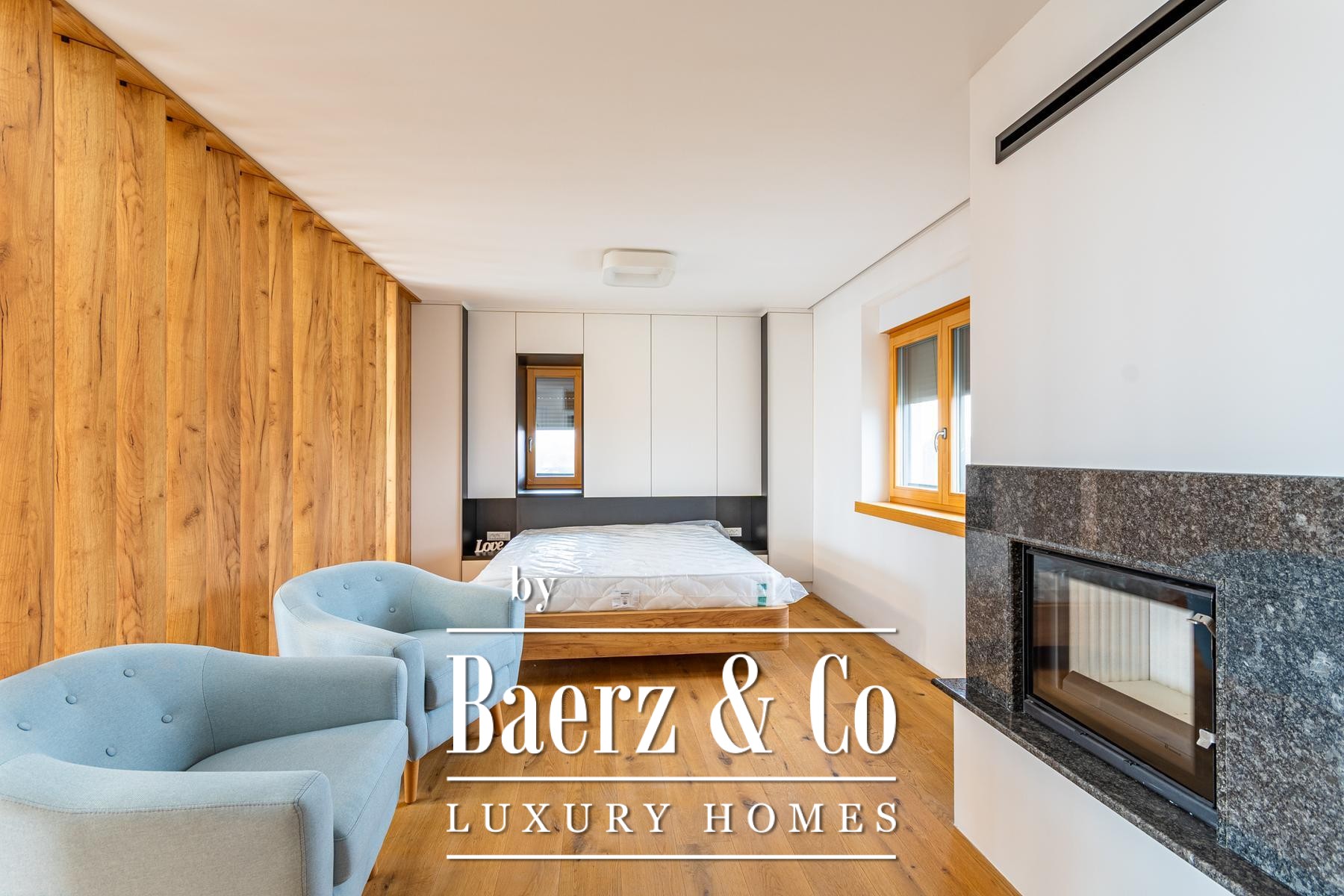 The villa’s architecture flows effortlessly between its three levels. The ground floor features an open kitchen, dining, and living zone, anchored by a fireplace and opening onto a broad terrace that welcomes natural light. A bedroom and bathroom with WC complete this floor. On the first level, a separate entrance leads to two bedrooms, a spacious bathroom, and a flexible kitchenette and living arrangement, with another terrace that frames the scenery. The finished basement provides a private sauna, wine cellar, and garage, grounding the home in quiet luxury.