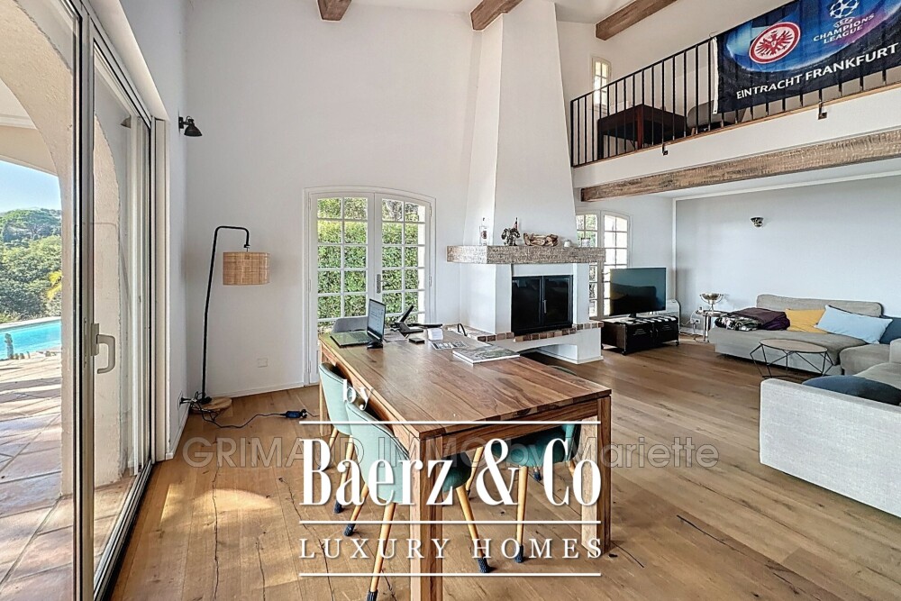 fitted kitchen, three bedrooms with two shower rooms, upstairs a master suite with its bathroom and an office. Numerous covered and uncovered terraces. Beautiful amenities and a beautiful view of the bay of Saint Tropez.