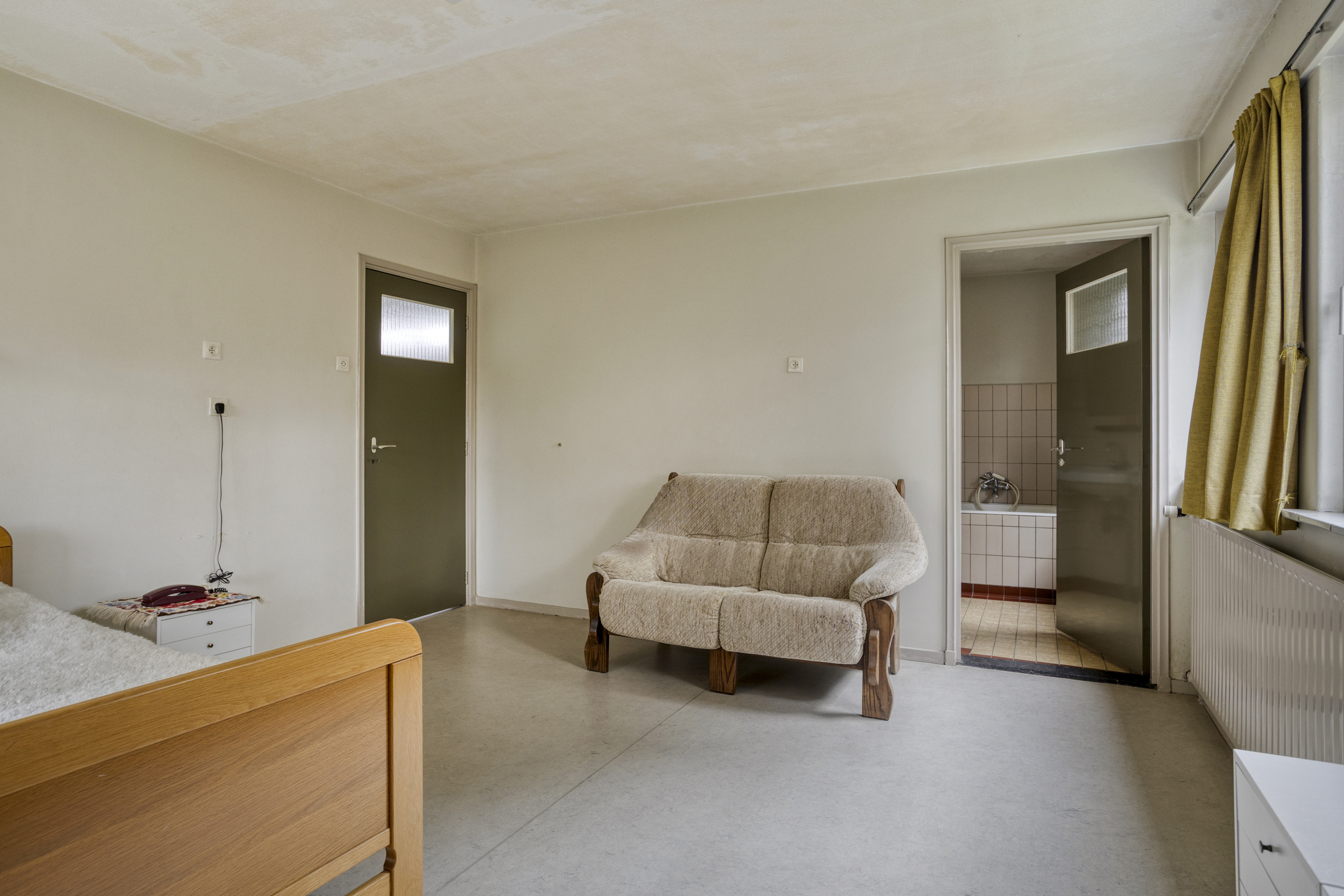 Rear right bedroom with washbasin connection (not in use), plastered walls, linoleum flooring, plastered ceiling;