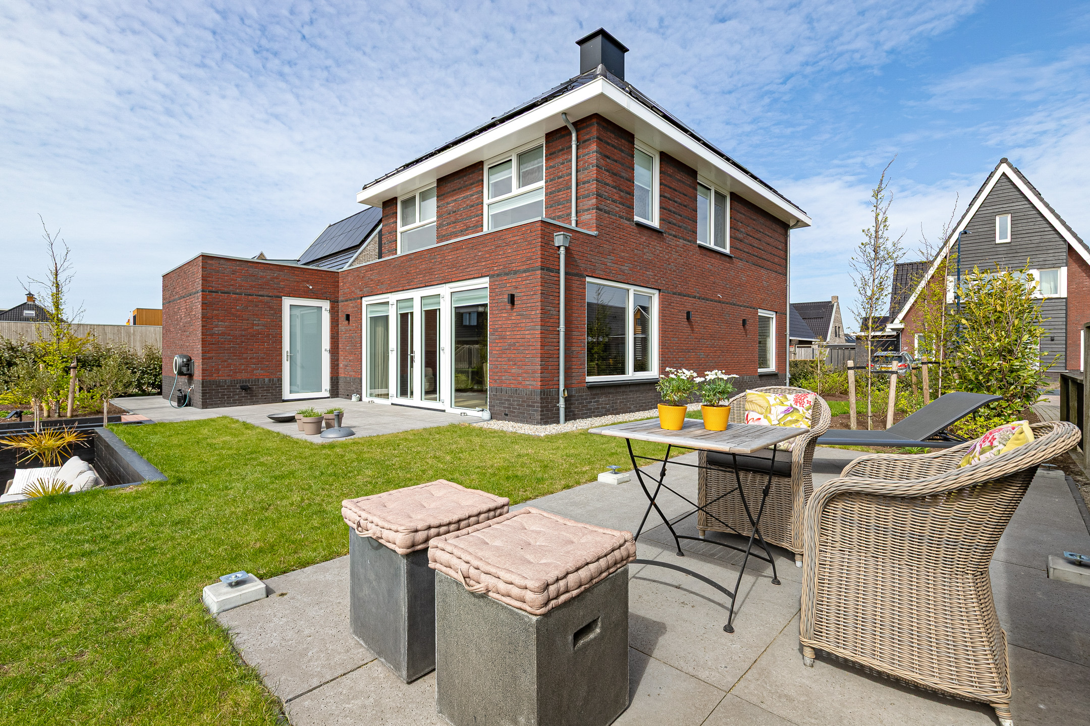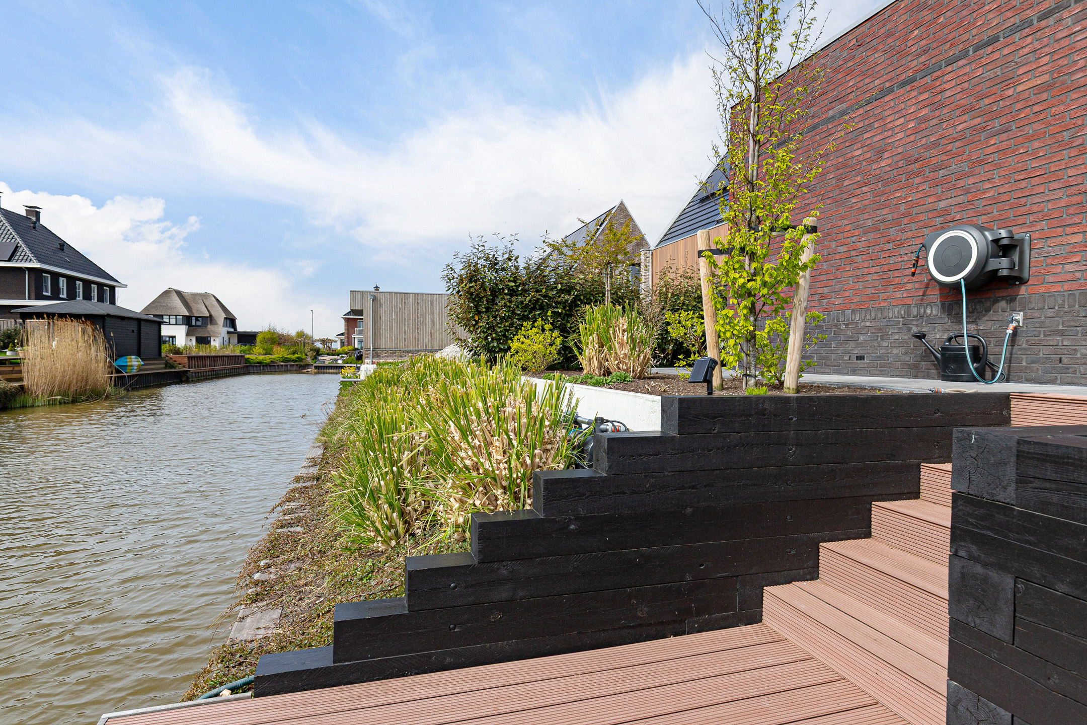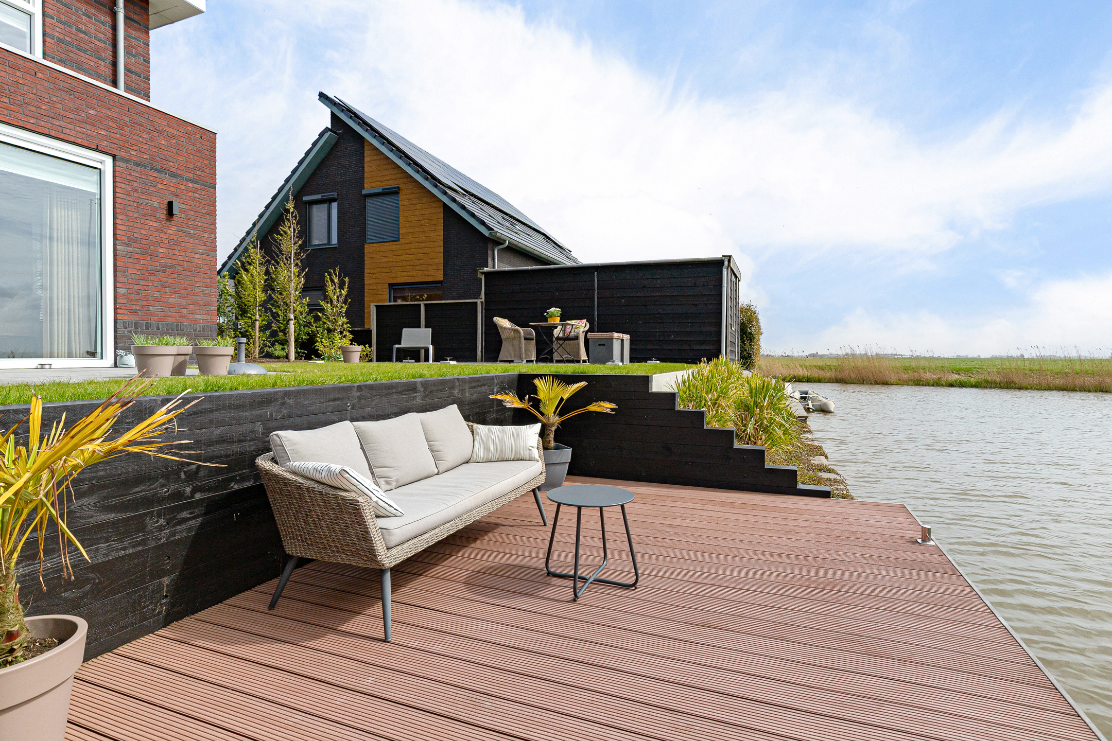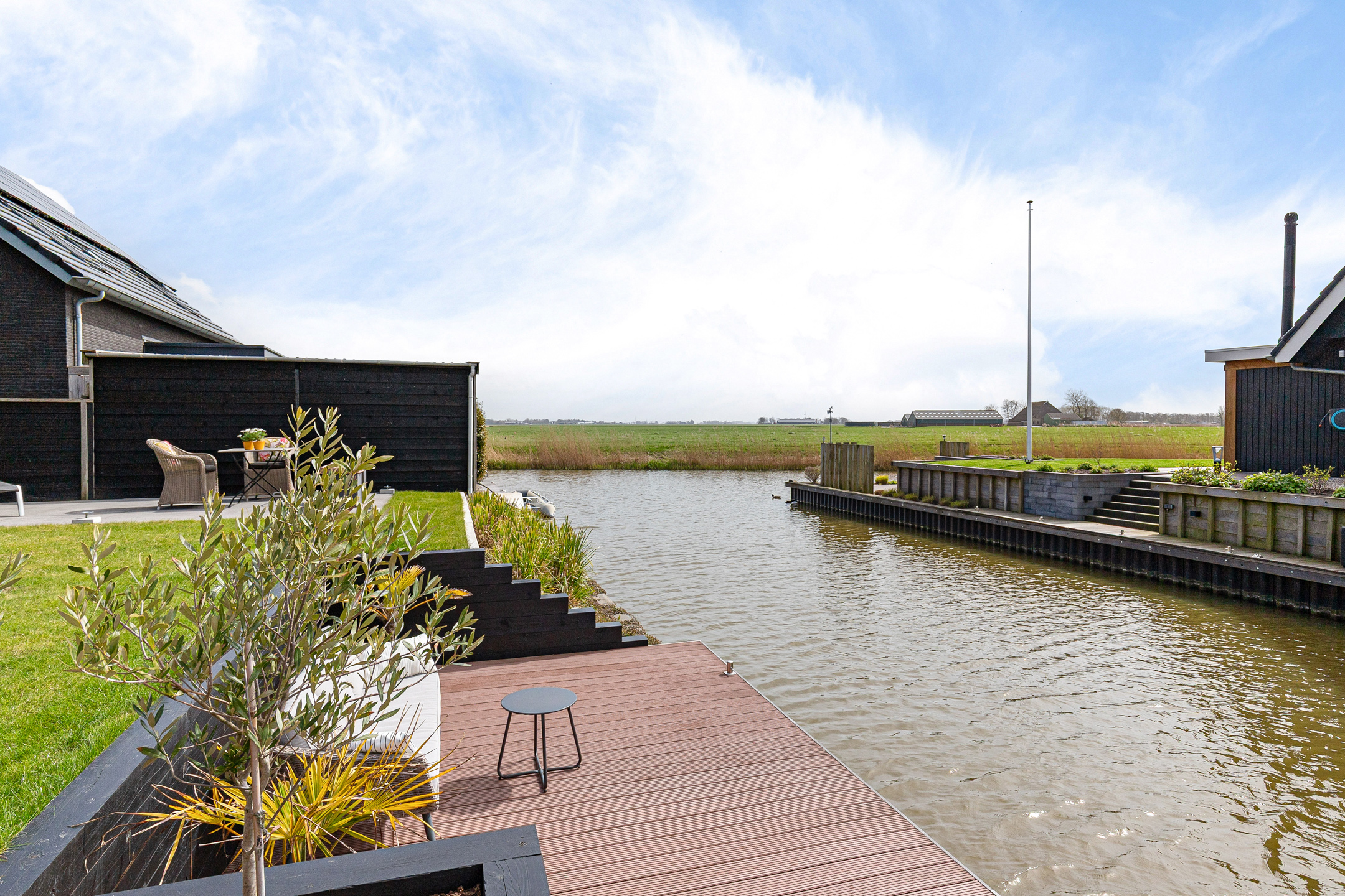 The architect-designed waterfront garden has been beautifully landscaped and features several terraces, stylish planting, and a generous composite mooring jetty. From your private water access, you can directly enter a branch of the famous Eleven Cities Route (Elfstedentocht).