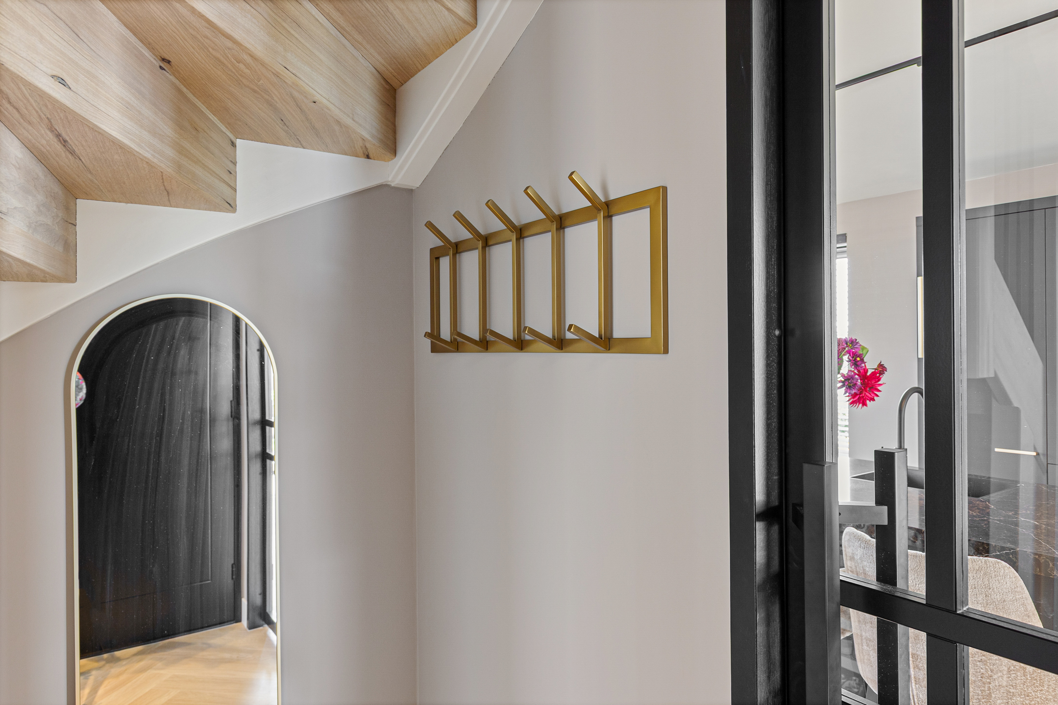 The entrance leads into a spacious hallway featuring a staircase finished with Fraké wood treads and handrails, combined with elegant black balusters, a stylish guest toilet, and the utility meter cupboard. From the hallway, an extra-wide glass door provides access to the generous living area.