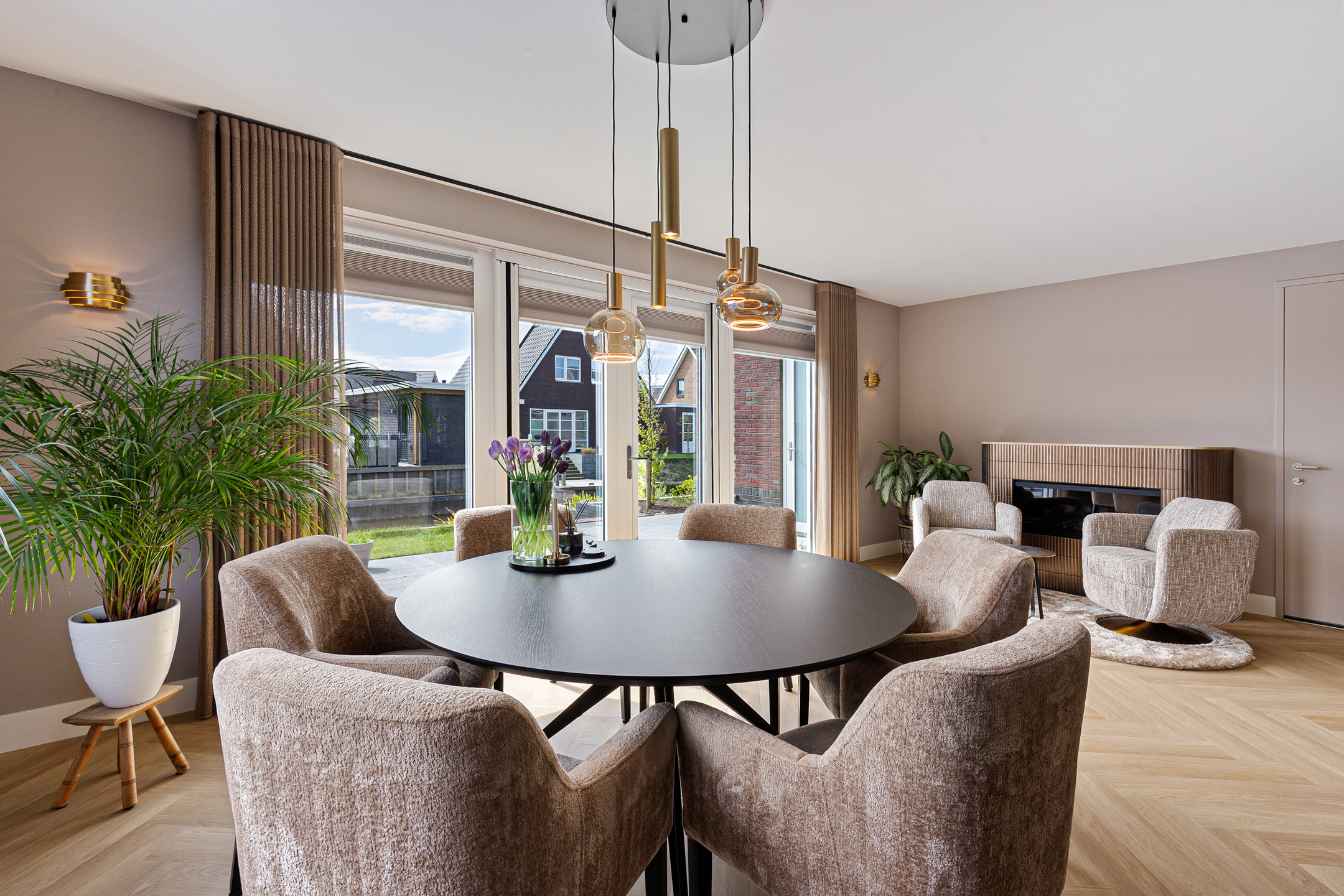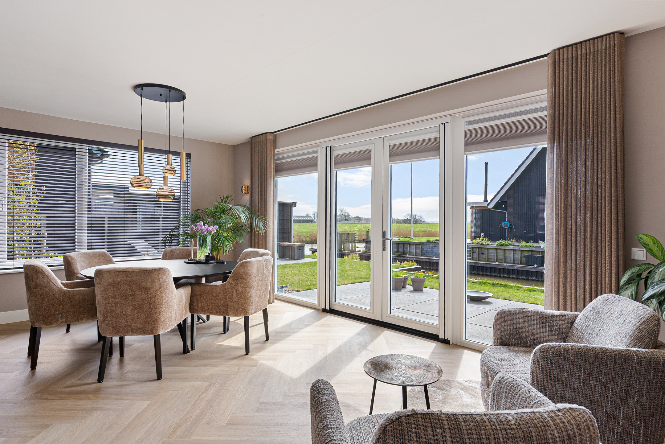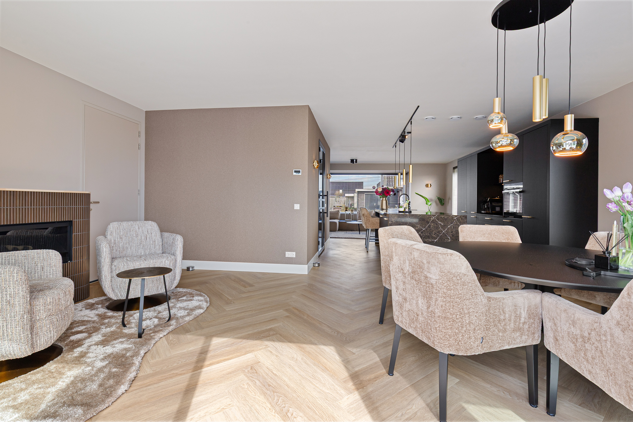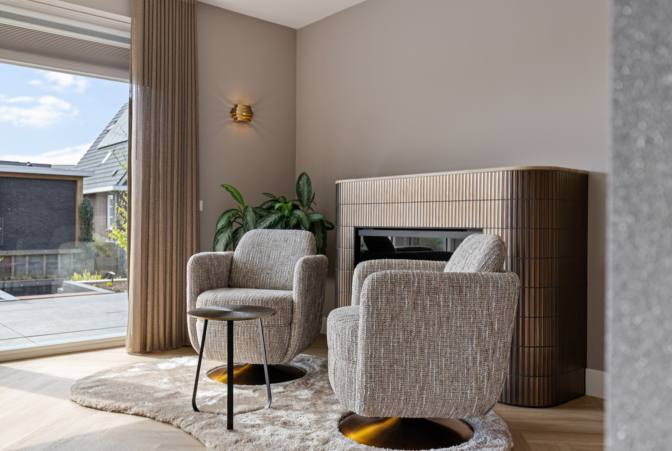 A stylish built-in electric fireplace (Kalfire E-one, Dec. 2025) set within an elegant surround finished with bronze ceramic KitKat tiles serves as a true focal point. The living room is fitted with wooden Luxaflex blinds, beautiful in-between curtains on the garden side, interior sun shading, and a double pleated insect screen door.