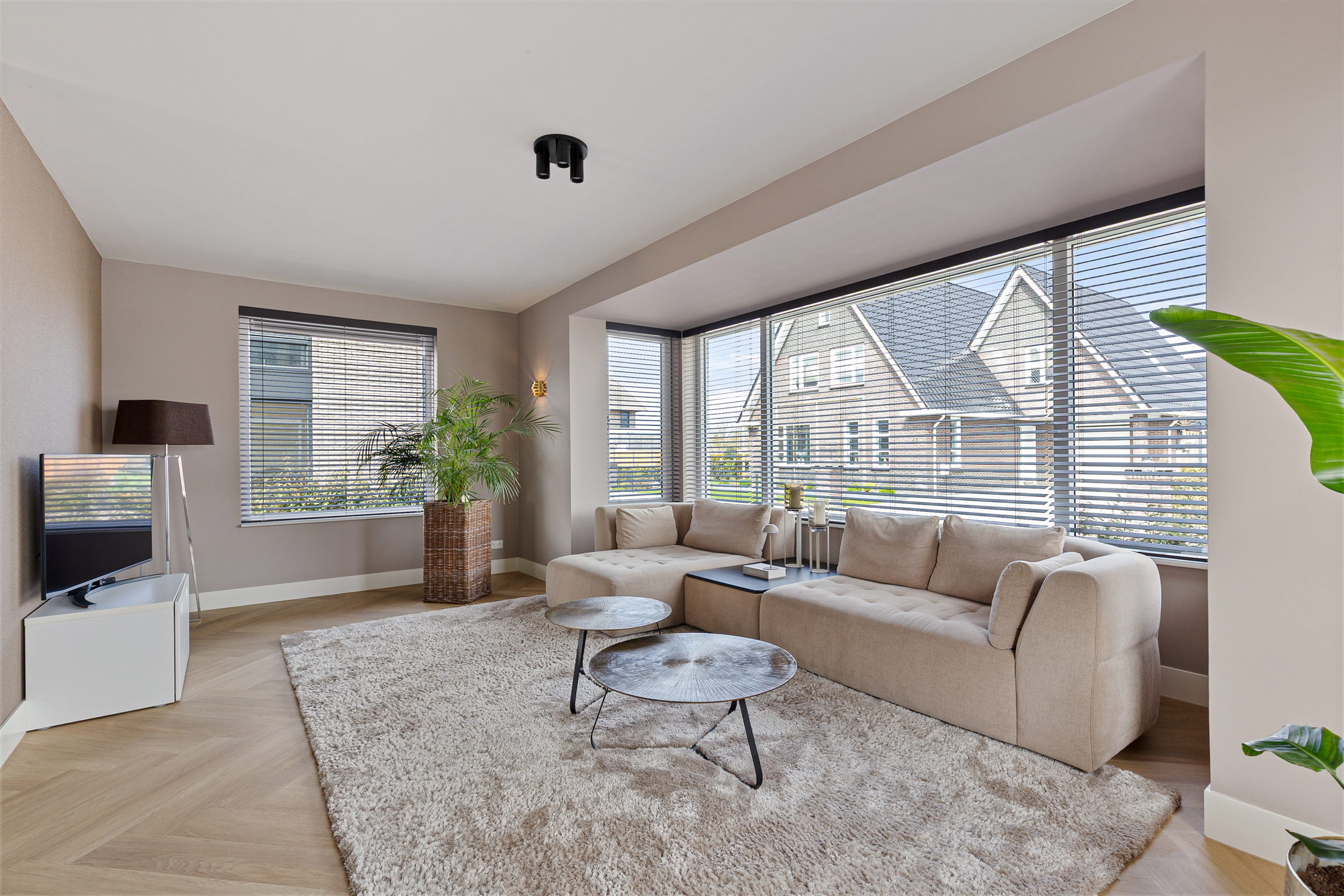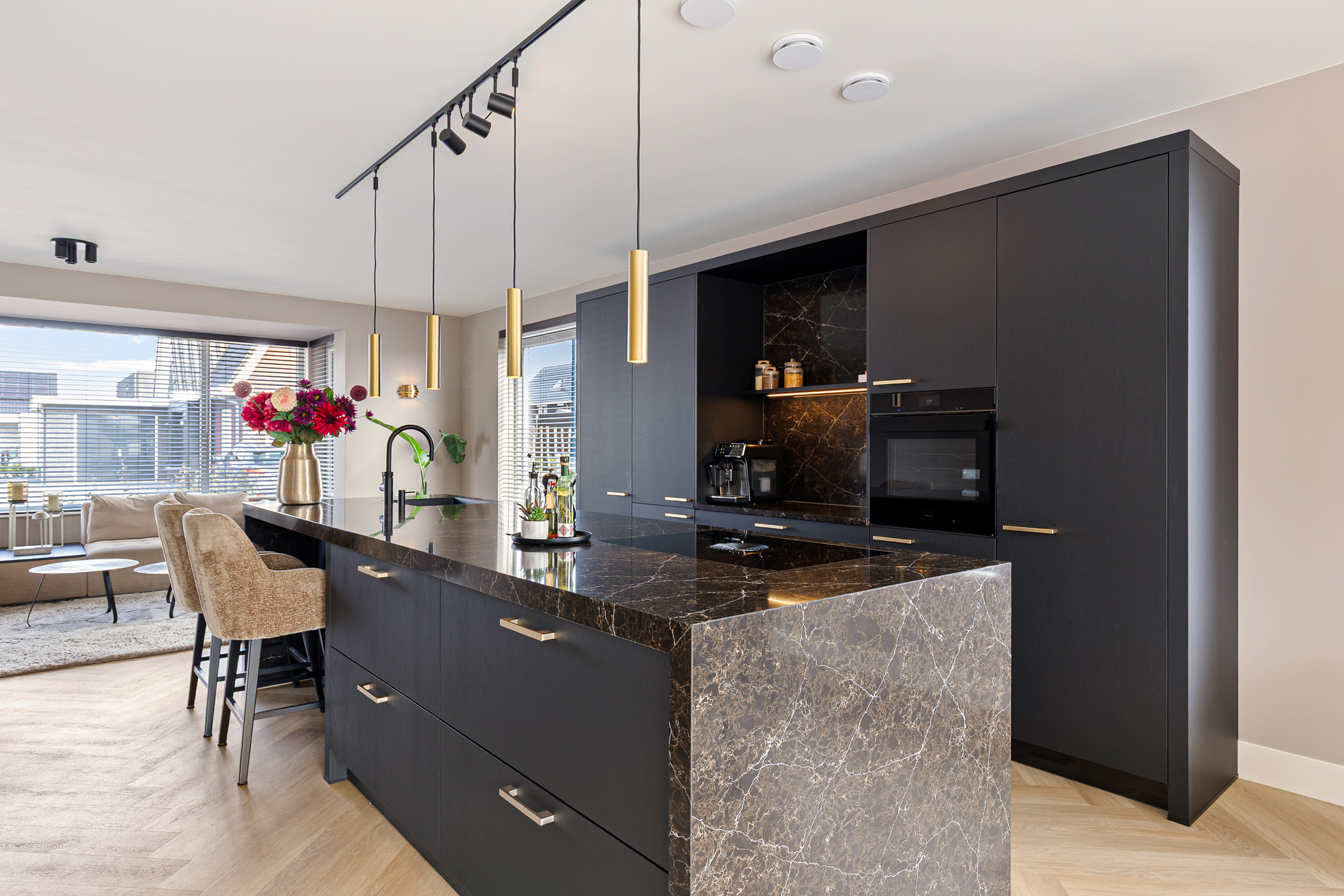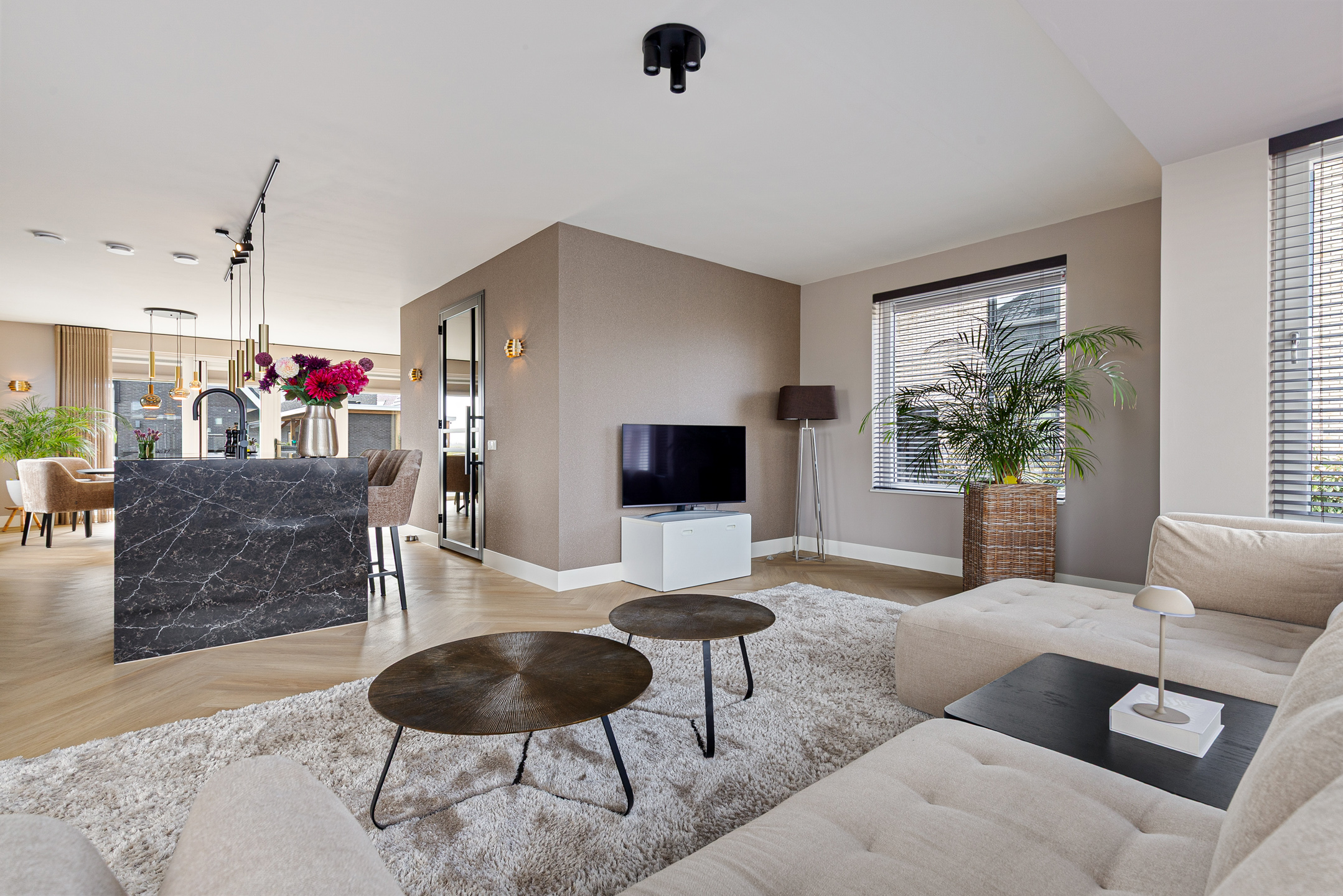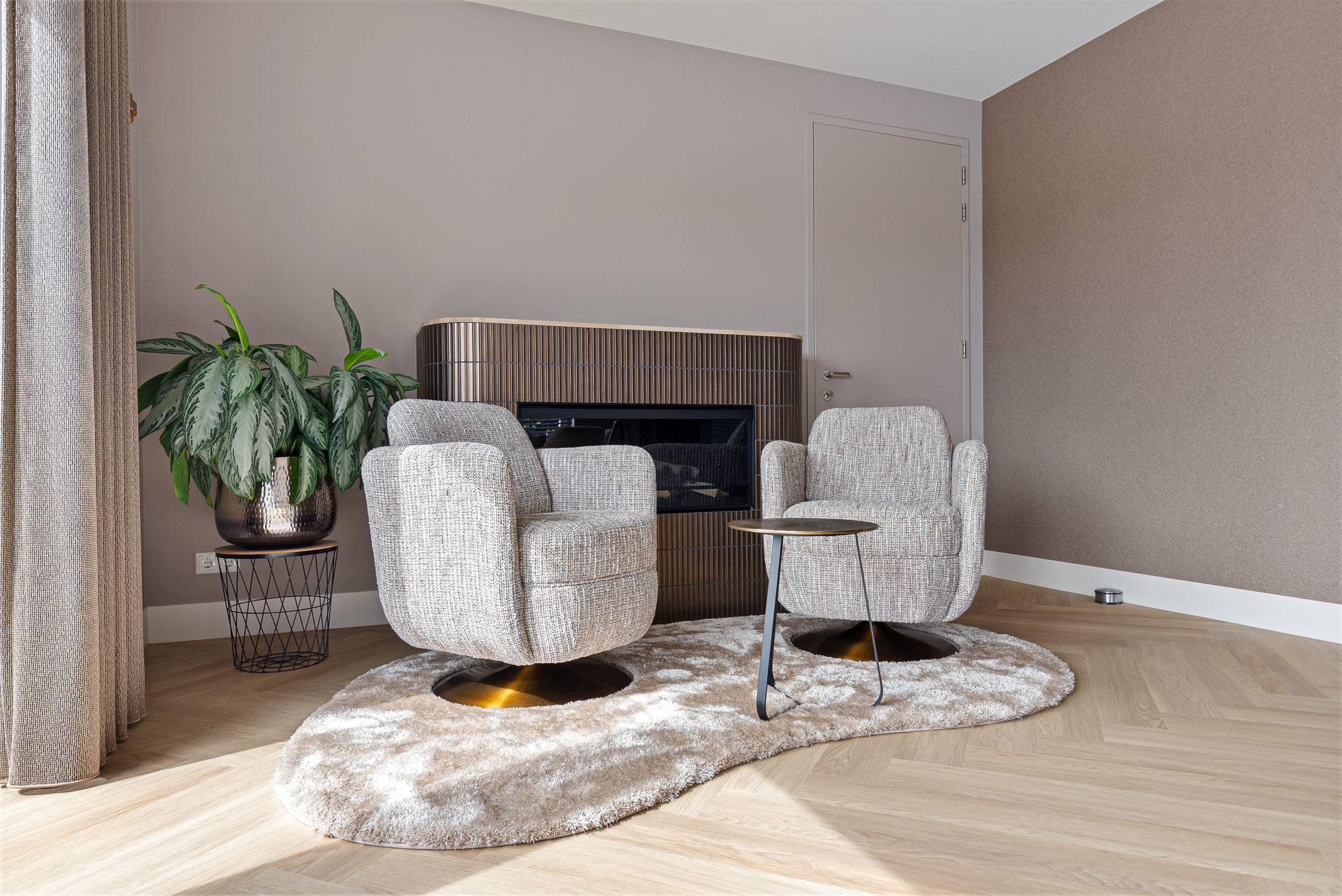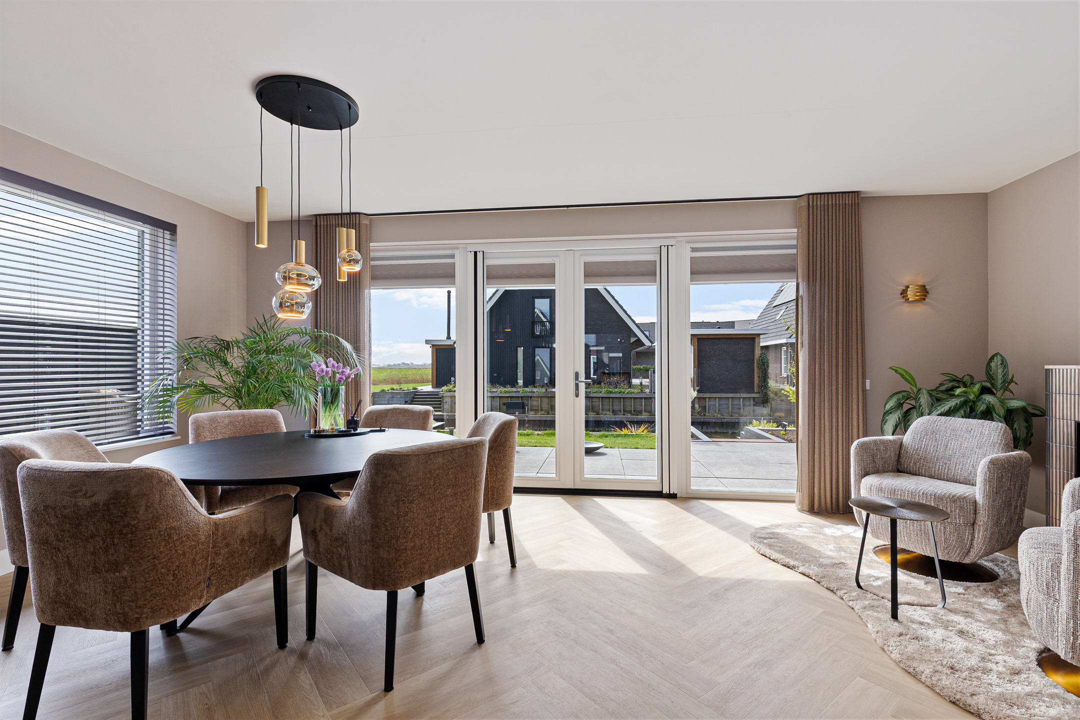 A stylish built-in electric fireplace (Kalfire E-one, Dec. 2025) set within an elegant surround finished with bronze ceramic KitKat tiles serves as a true focal point. The living room is fitted with wooden Luxaflex blinds, beautiful in-between curtains on the garden side, interior sun shading, and a double pleated insect screen door.