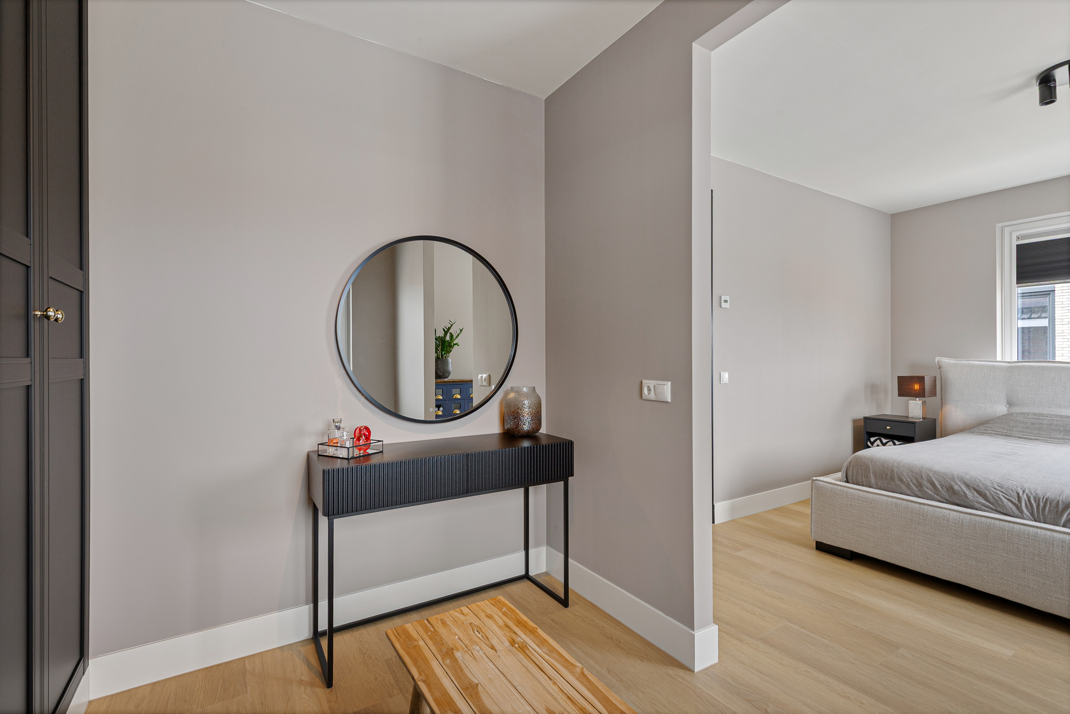 The master bedroom is generously proportioned and features a luxurious en-suite dressing room with fitted wardrobes and space for a vanity setup.