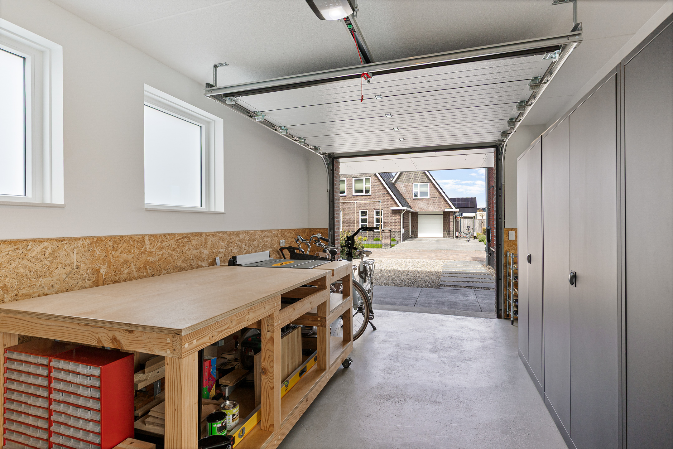 The space features an electric garage door and benefits from abundant daylight through windows in the side façade and a glazed door providing direct access to the garden.