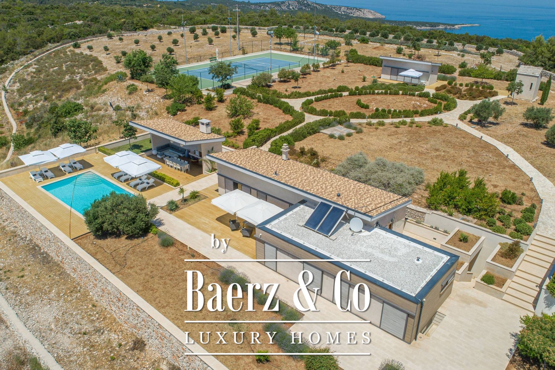 and three bedrooms, one of which has an attached bathroom. In the basement there is another room with a bathroom, a wine cellar, and a spa area (hot tub, massage table, gym and sauna).The outdoor space is refined with a barbecue, a lighted tennis court, a bowling alley and a detached garden house with a studio apartment. The facility is equipped with a high-end electronic locking system and a video surveillance system and an alarm for additional security.It is less than two kilometers from the beautiful Pokrivenik bay.