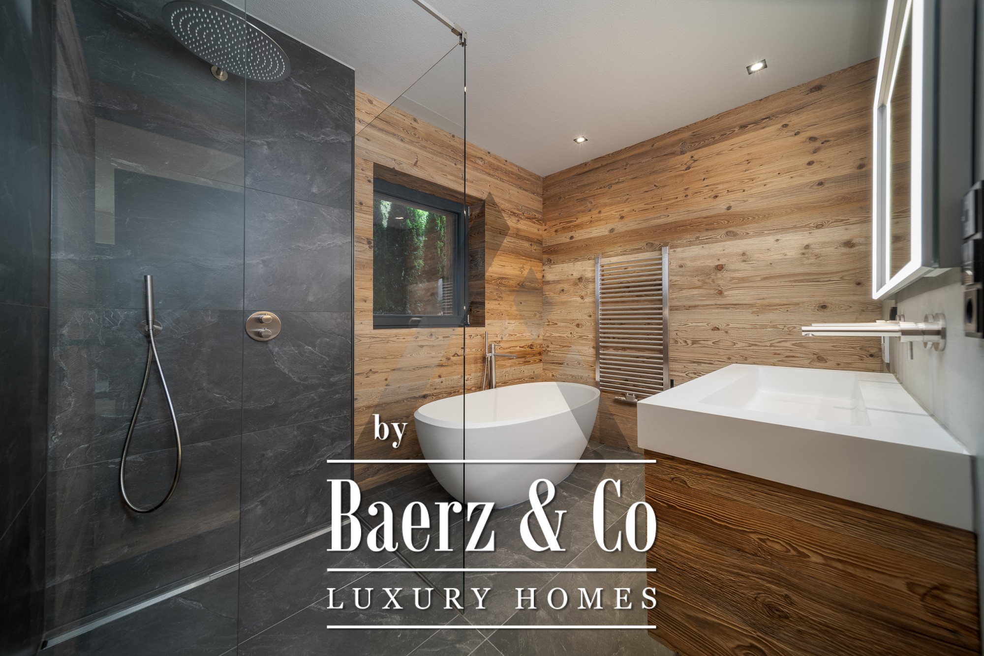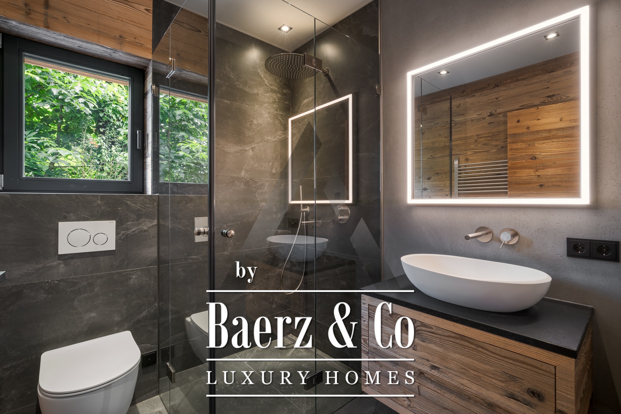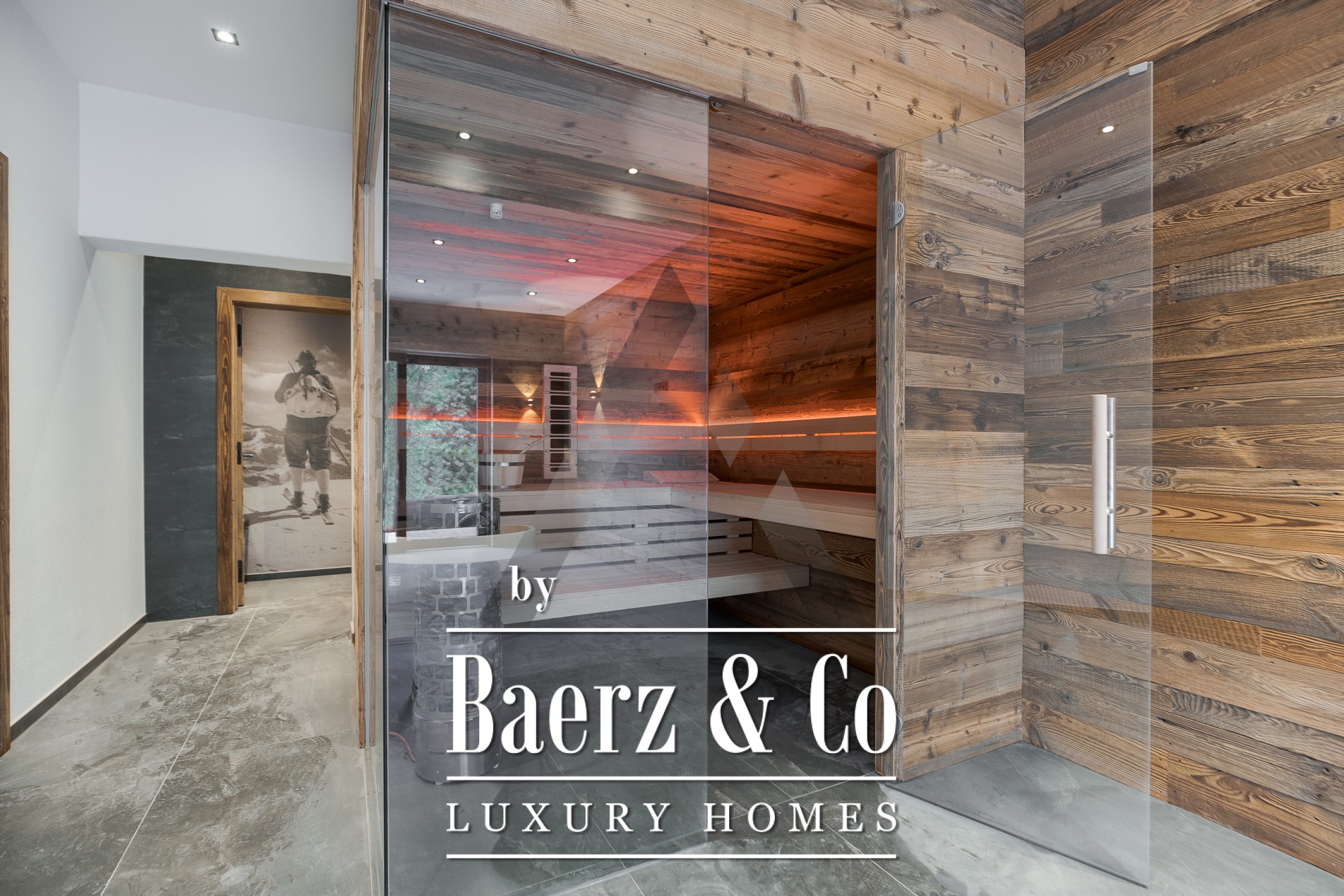 Floor-to-ceiling glass fronts in the expansive 70 m² living and dining area open to the landscape, while natural stone and old wood formwork accentuate the exterior’s timeless elegance. The professional kitchen features appliances from Gaggenau and Bora Professional, ideal for culinary pursuits. A dedicated wellness area with sauna and relaxation zone invites restoration, joined by thoughtful amenities such as a lift, open fireplace, BUS system, and both underground and outdoor parking.