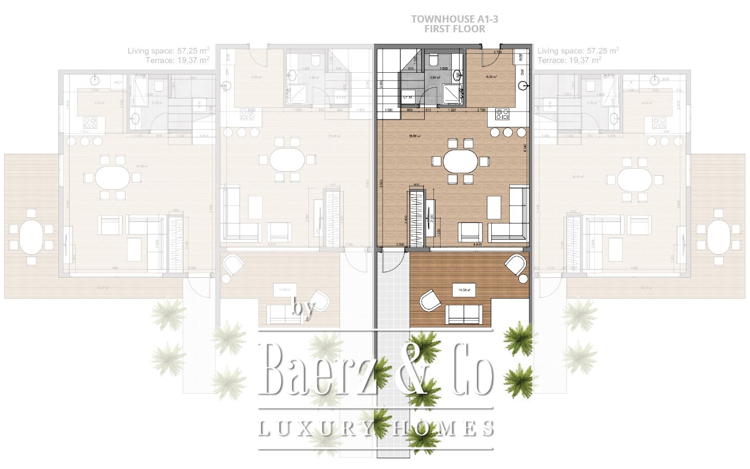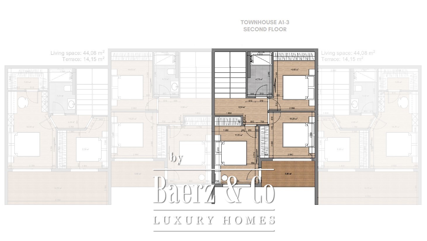The residence offers 110 m² of living space on a private 200 m² plot, with flexibility in layout between two or three bedrooms, and two bathrooms. An open-plan living room-kitchen leads seamlessly to two terraces, each framing sea perspectives, while parking and a private walkway add to the sense of arrival. Four homes comprise each townhouse structure, constructed with modern reinforced concrete, shockproof panoramic windows, and an emphasis on ecological safety.